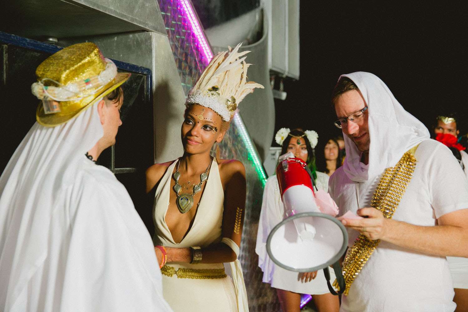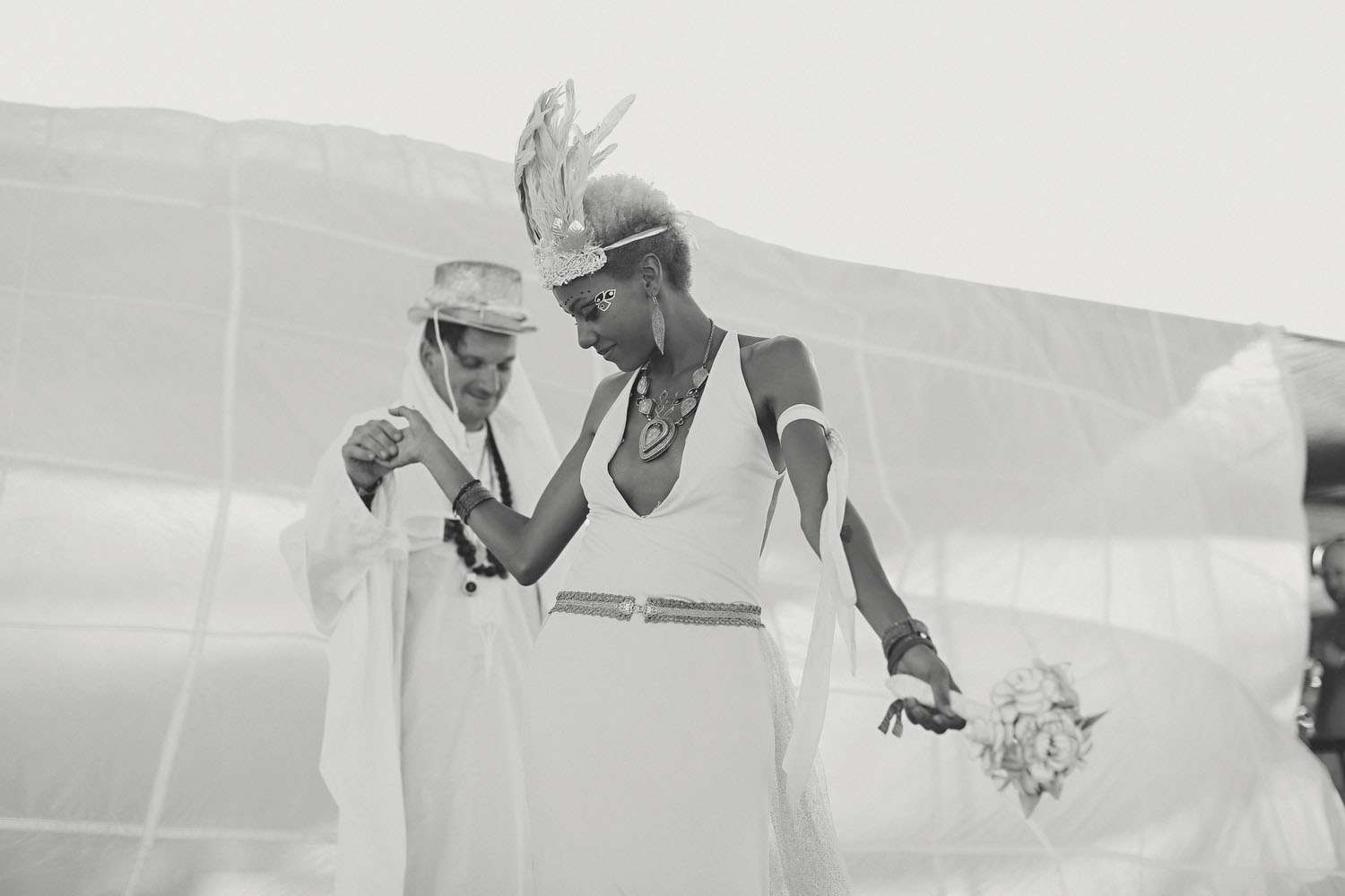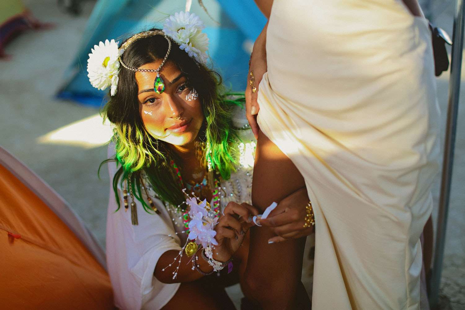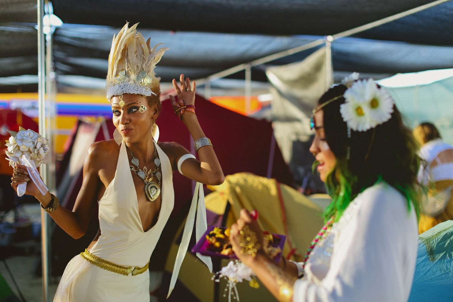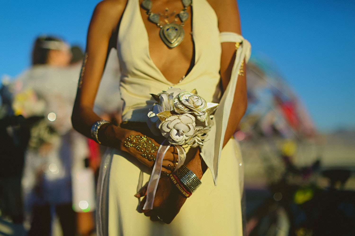 “The inspiration for our wedding was desert, caravansary, flowy, bedouin, Aladdin (with my name being Jasmine and all… haha), white and gold”, wrote the bride. “What made it unique was the fact that it was a HUGE production at Burning Man, over 500 people dressed to the nines in white and gold showed up to celebrate our union. The challenge prior was having no way to communicate. It was like taking it back to the old school days before the internet and relying on people’s memories. We did a lot of running around to different camps to remind people that the wedding was on Wednesday, which actually faired the best in terms of weather. The universe definitely worked in our favor.”