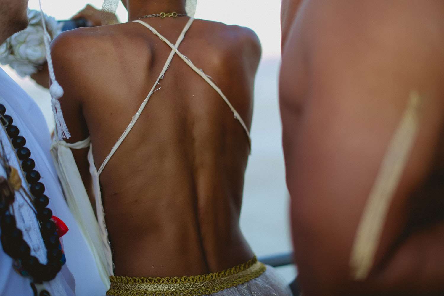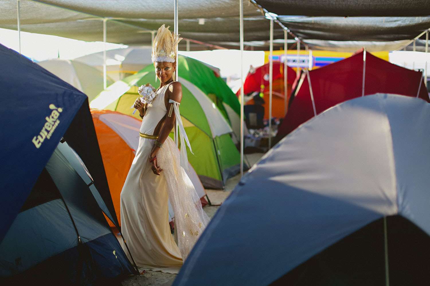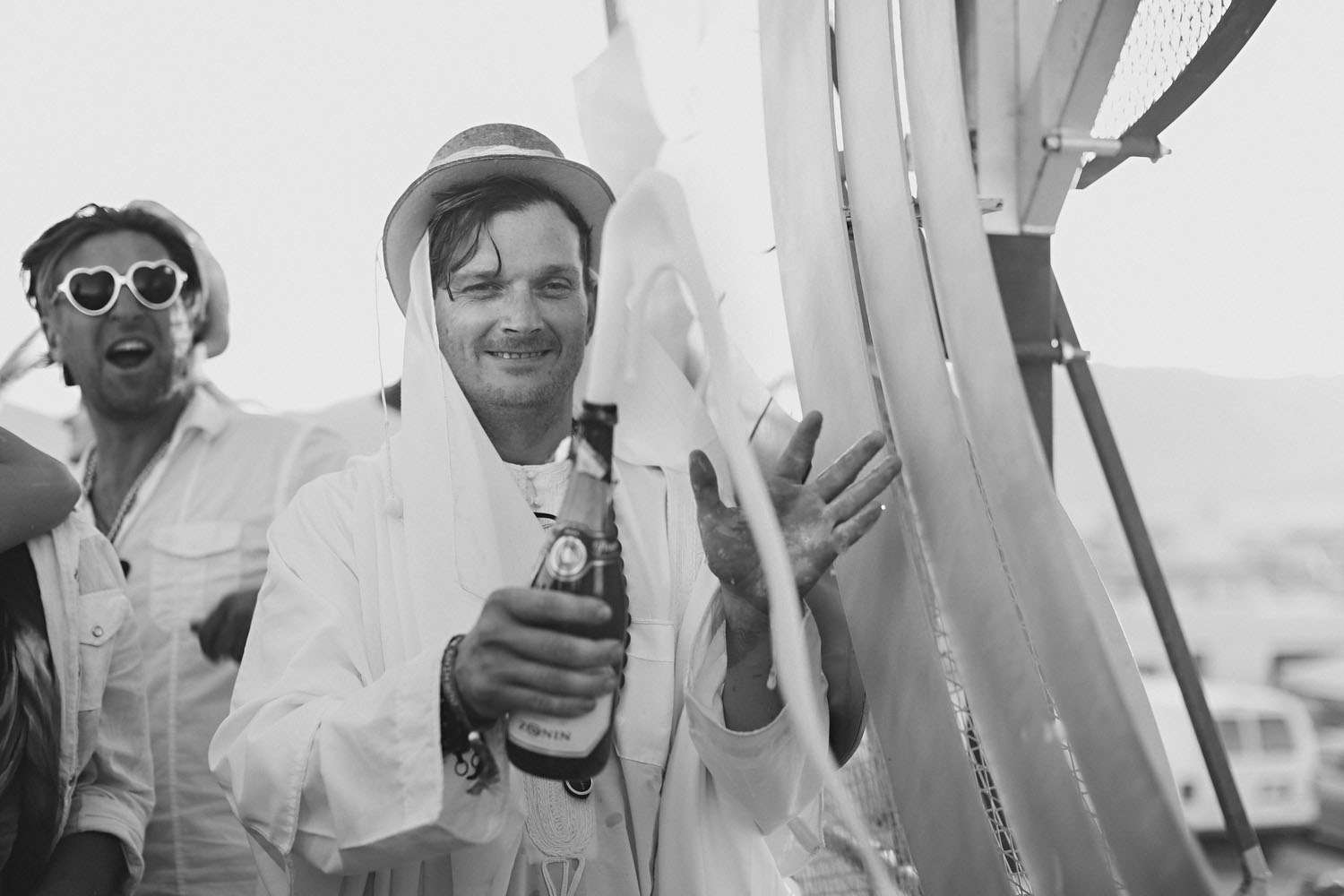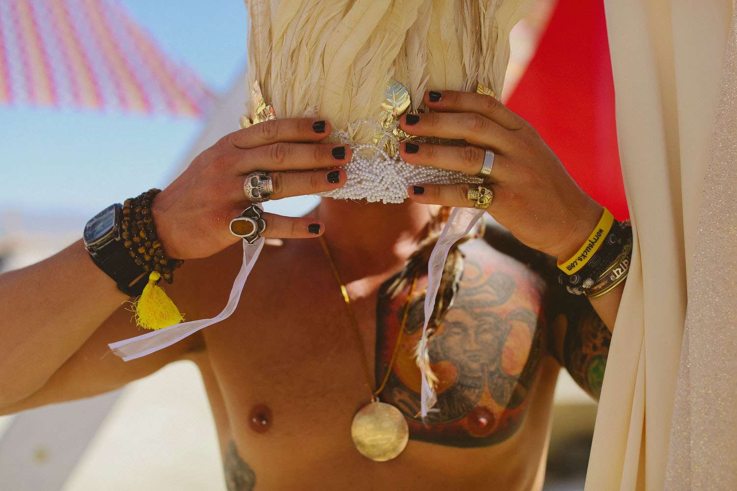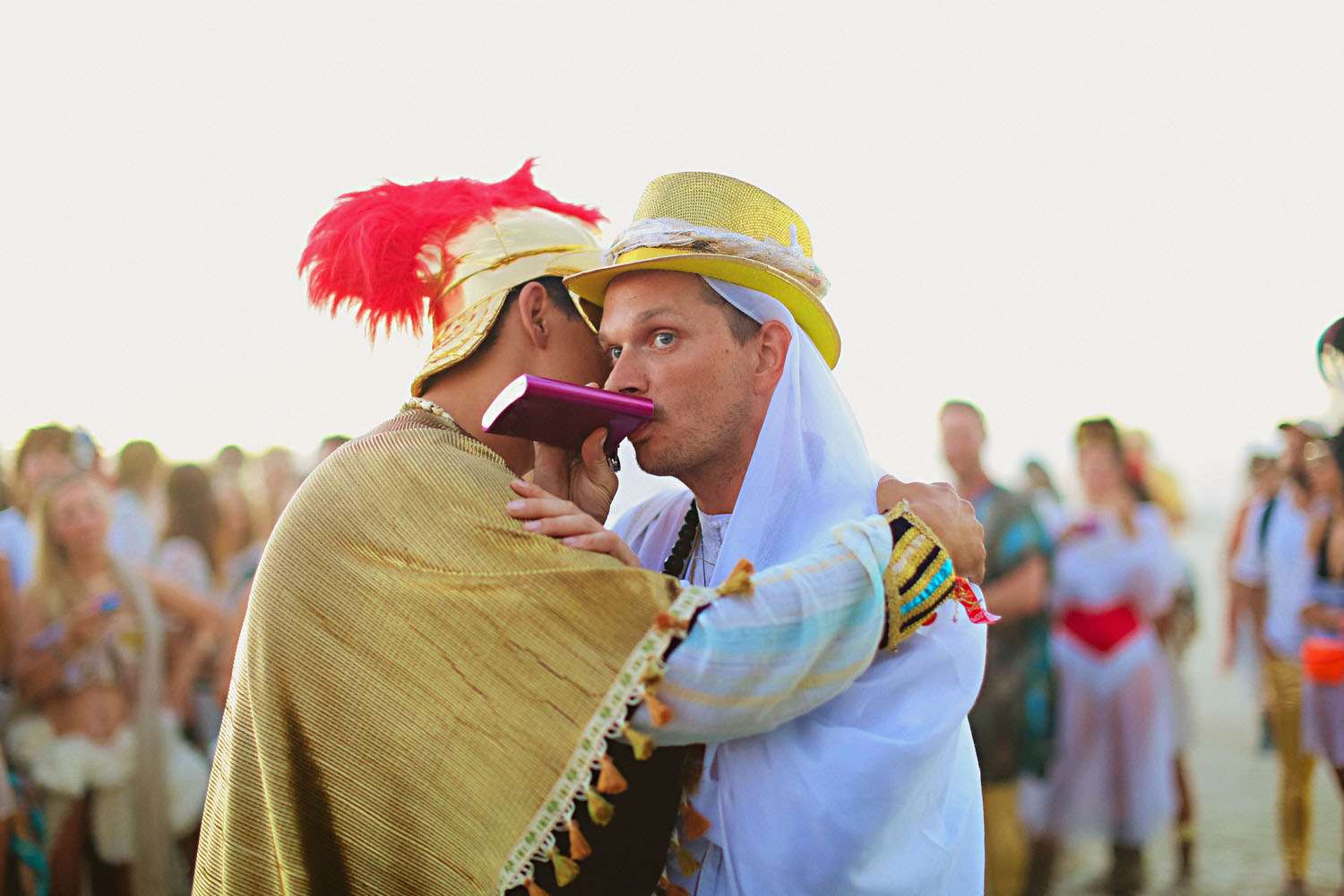 “The inspiration for our wedding was desert, caravansary, flowy, bedouin, Aladdin (with my name being Jasmine and all… haha), white and gold”, wrote the bride. “What made it unique was the fact that it was a HUGE production at Burning Man, over 500 people dressed to the nines in white and gold showed up to celebrate our union. The challenge prior was having no way to communicate. It was like taking it back to the old school days before the internet and relying on people’s memories. We did a lot of running around to different camps to remind people that the wedding was on Wednesday, which actually faired the best in terms of weather. The universe definitely worked in our favor.”
