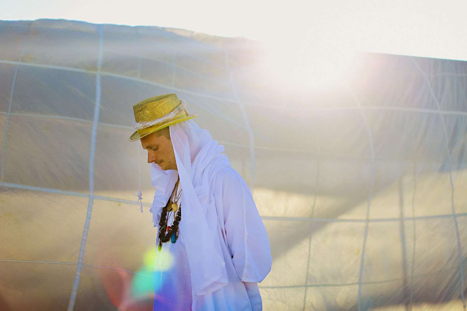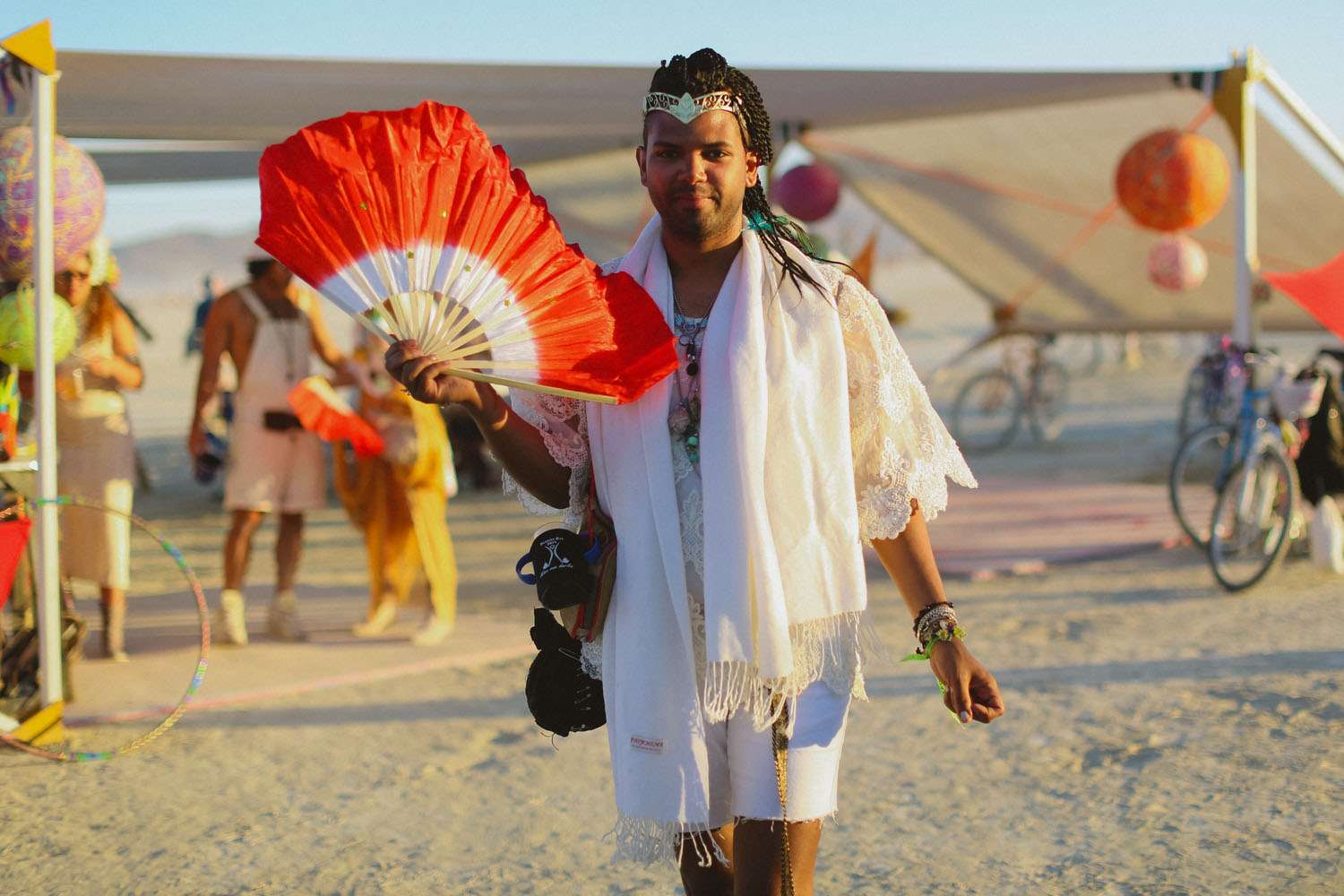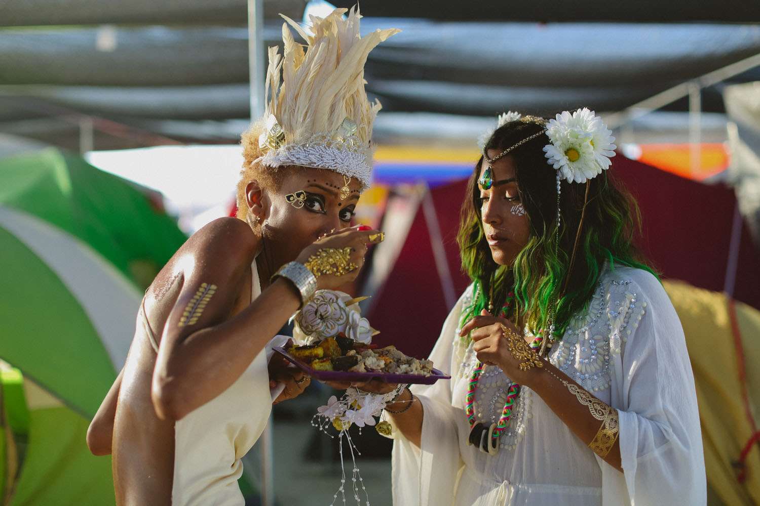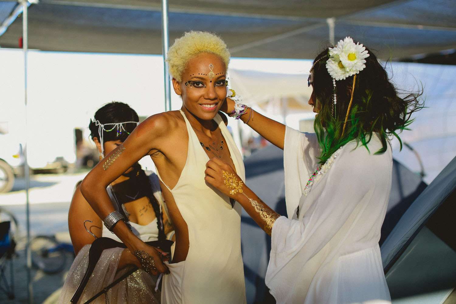 “The theme this year for Burning Man itself was Caravansary, which actually fit perfectly for us on so many levels”, she continued. “It was almost serendipitous if you will. We had already decided lonnnnnng before that we were going to do the white and gold theme. I imagined this being quite picturesque in desert landscape. It was more befitting after the theme was announced and worked perfectly for the costumes we had already decided upon. I was finally getting to marry my Aladdin, except he’s Icelandic.”