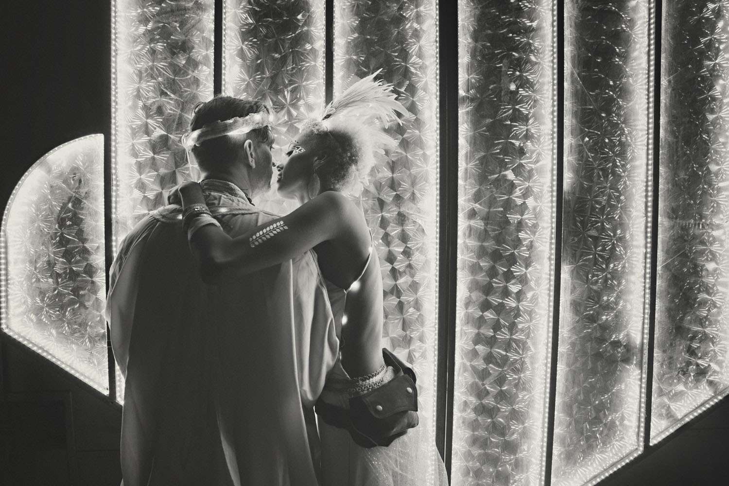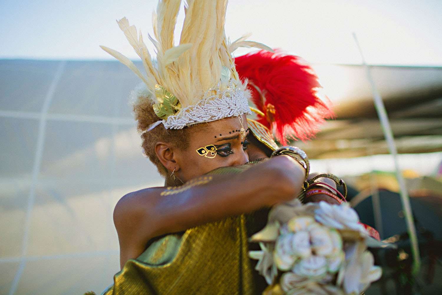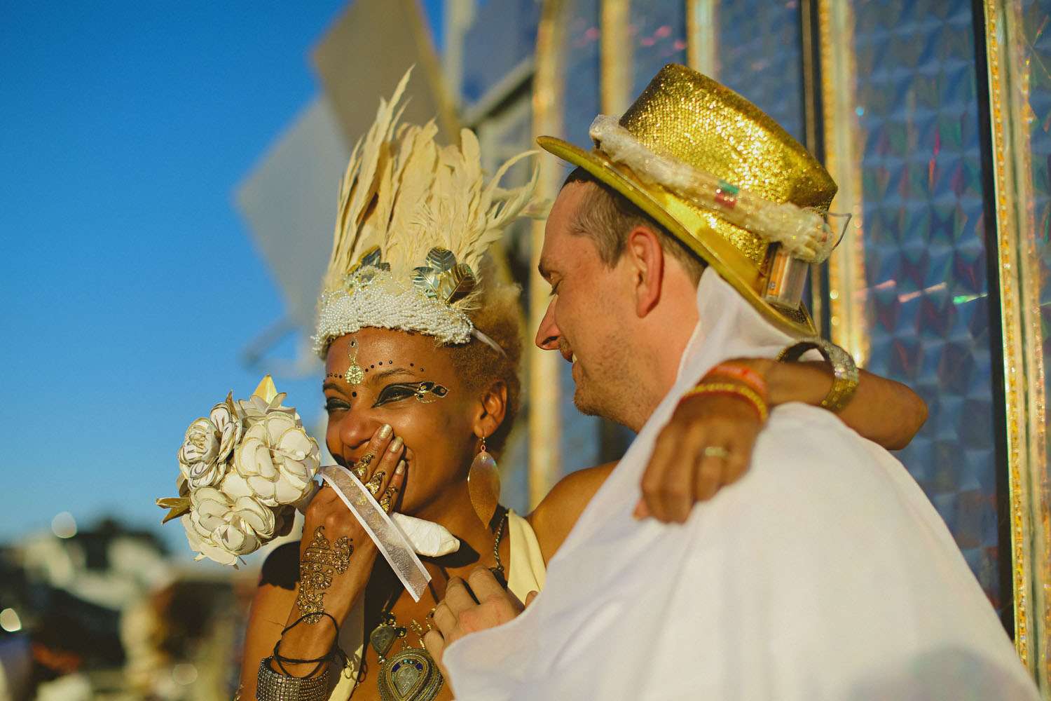 Stand by and prepare to flip out over this incredible Burning Man wedding. It wins EVERYTHING. The day was the truest expression of love. There were no flowers, centrepieces, stationery or cake. They had the ceremony at the Heart Phoenix Art Car by the Embrace Sculpture with 500 people looking on.
