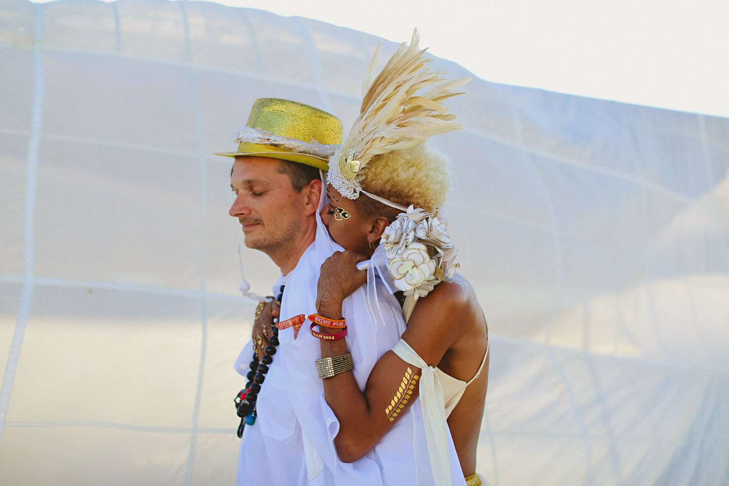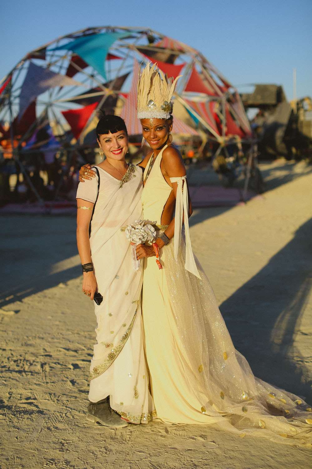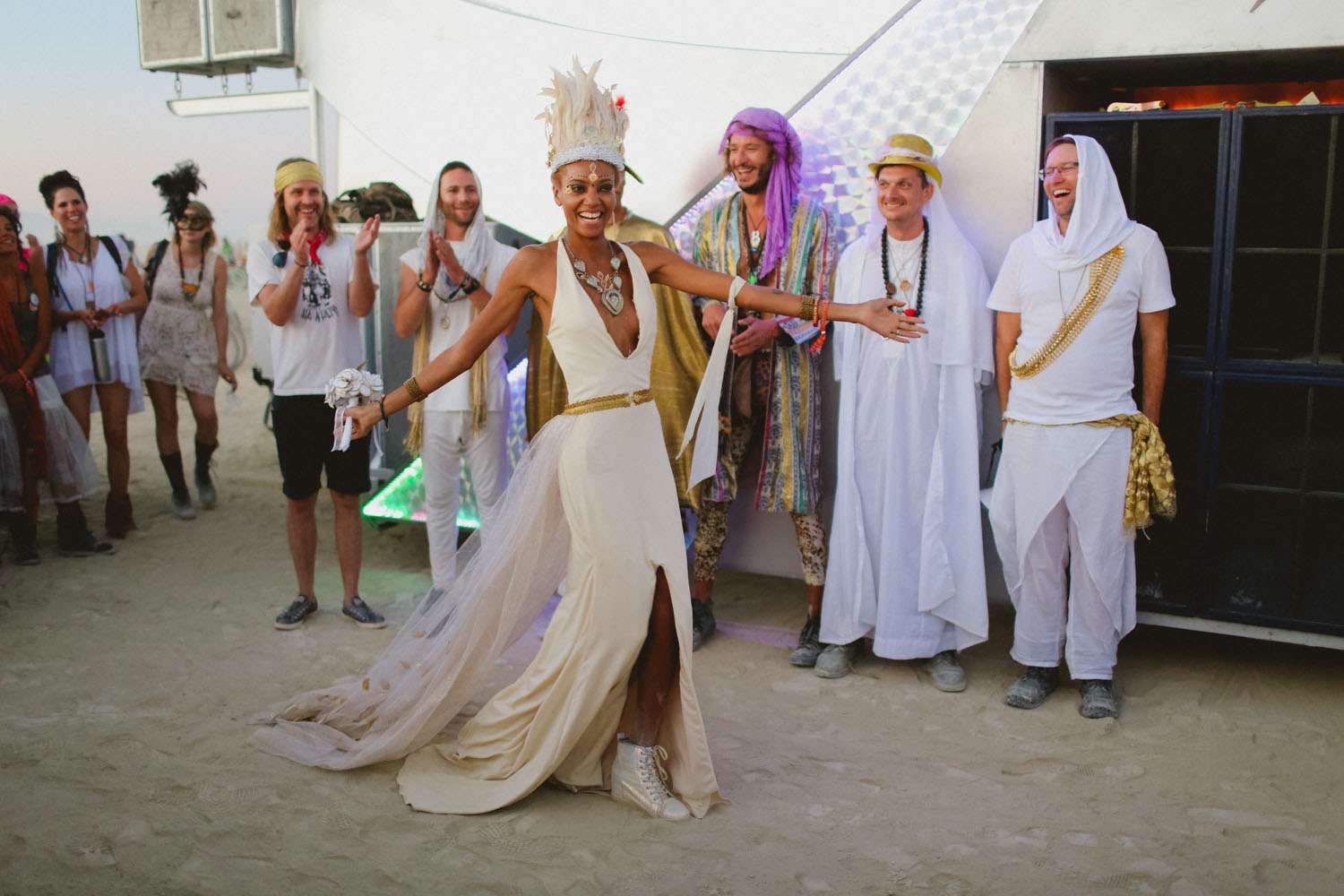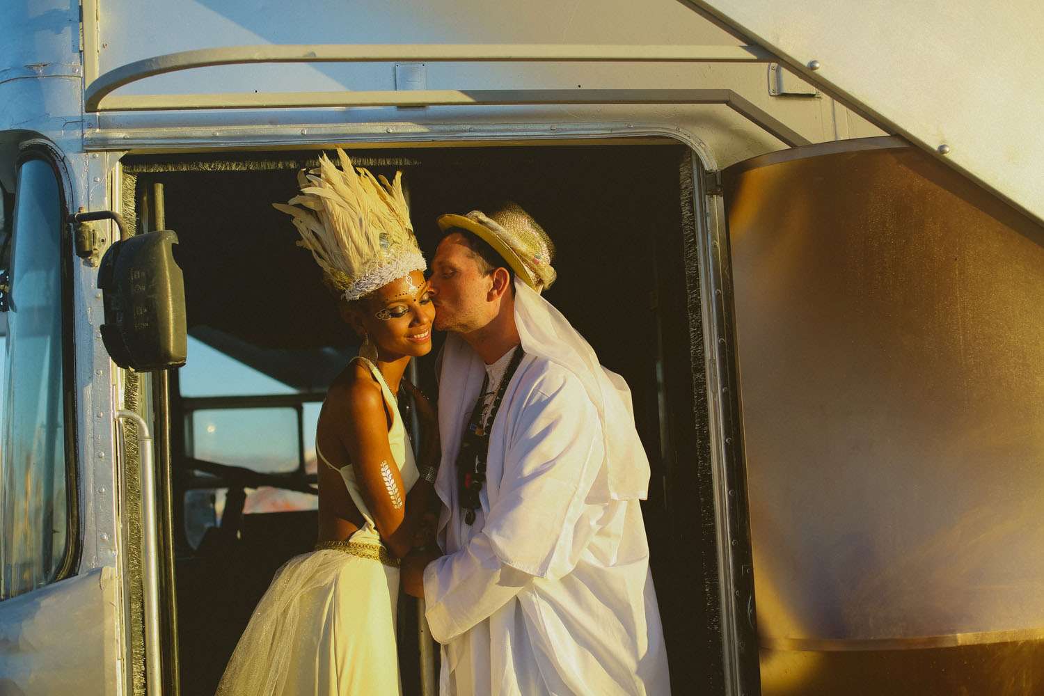“A big part of getting married at Burning Man is that things happen that you don’t plan for”, the bride concluded. “It’s a completely harsh environment that presents itself with unexpected challenges, even when you think you have planned things well. In our case, our accommodations that were presented to us as a wedding present from very dear friends of ours, turned out to be less than perfect. Long story short our friends, were duped into renting a converted Greyhound bus that had none of the advertised amenities: air conditioning, bathrooms, showers, etc. It basically ended up being a sweat bath plus most of our food for the week going bad within the first few days.”
