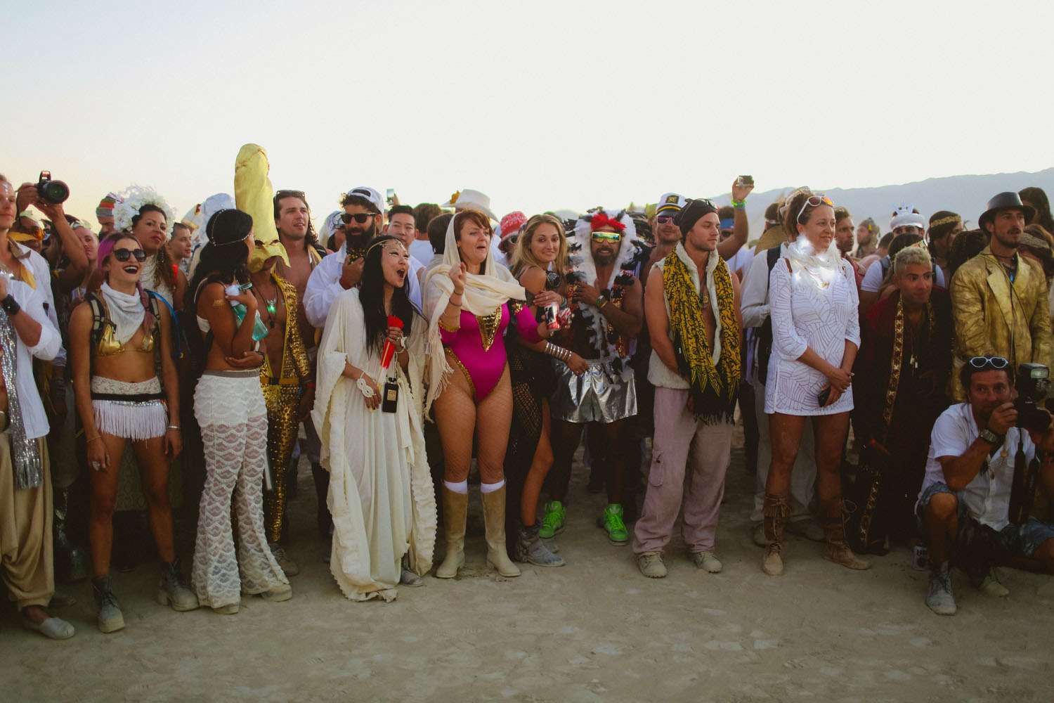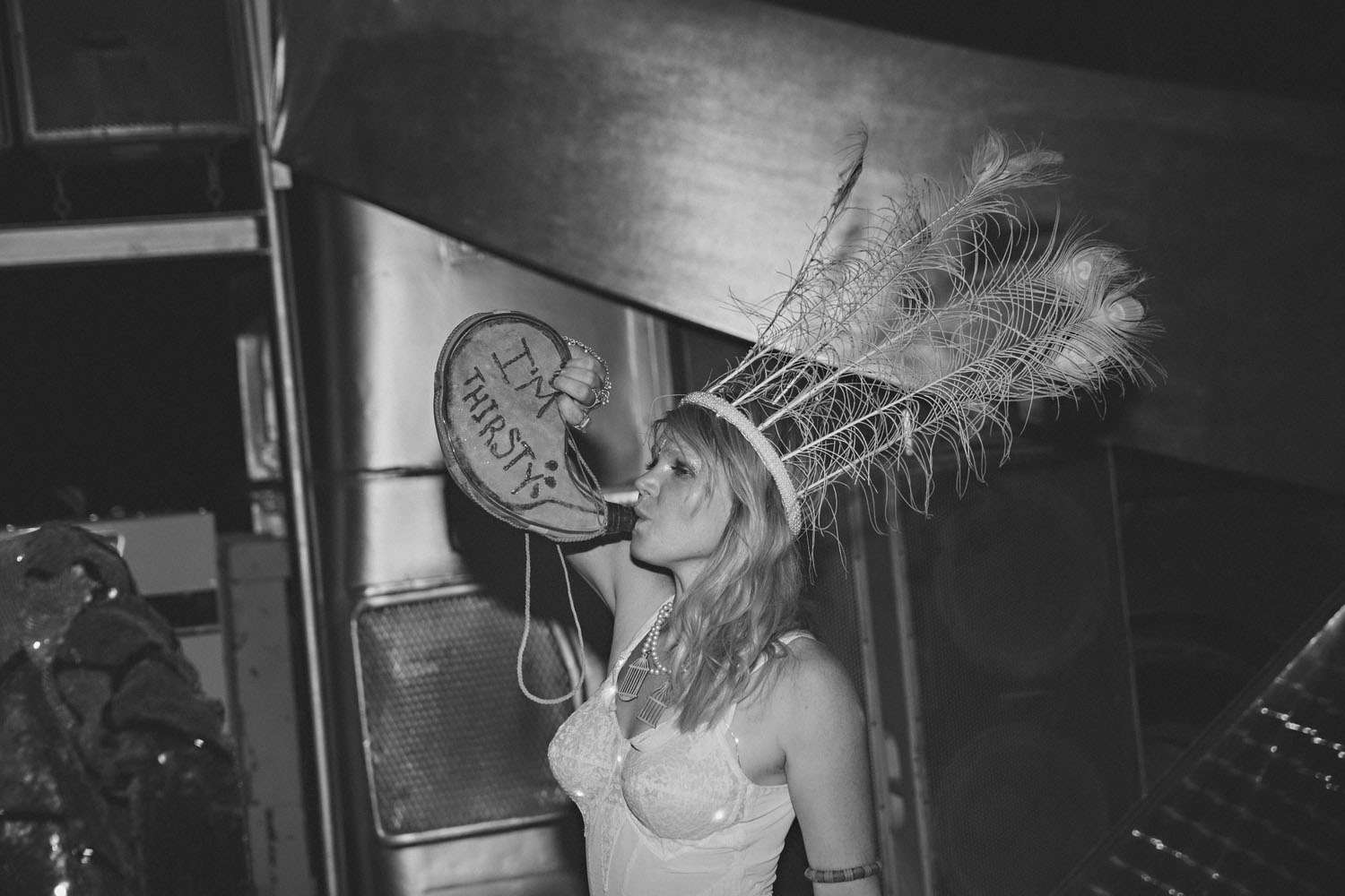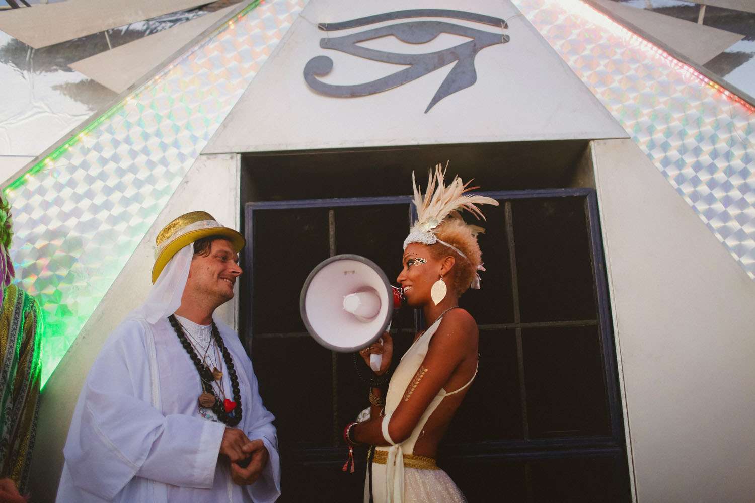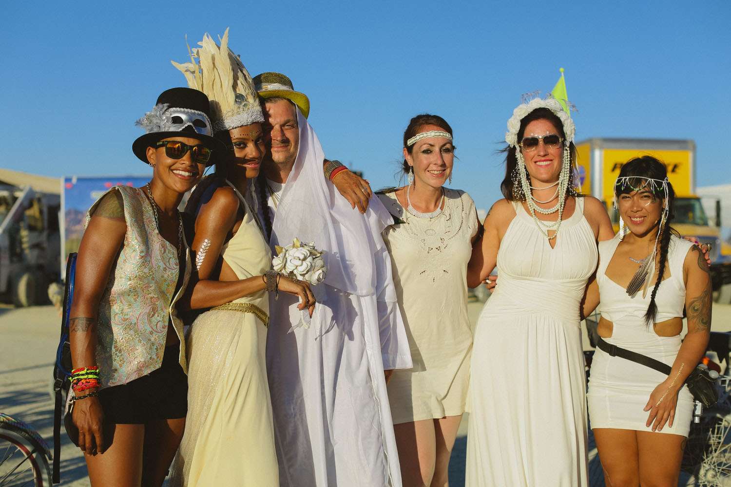 “A big part of getting married at Burning Man is that things happen that you don’t plan for”, the bride concluded. “It’s a completely harsh environment that presents itself with unexpected challenges, even when you think you have planned things well. In our case, our accommodations that were presented to us as a wedding present from very dear friends of ours, turned out to be less than perfect. Long story short our friends, were duped into renting a converted Greyhound bus that had none of the advertised amenities: air conditioning, bathrooms, showers, etc. It basically ended up being a sweat bath plus most of our food for the week going bad within the first few days.”