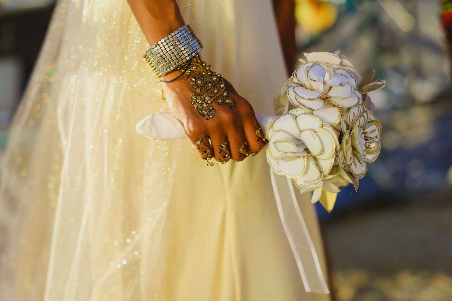“In terms of DIY, My friend Anne Kohlhagen helped me make my wedding train. I drew out what I had in mind, but she made it come to life. The train is made of gold glitter tulle with large gold leaf sequins that were sewn on by hand toward the middle and base of the tar. I also made my bouquet which is made from paper, mostly inspired and as a tribute to my love of paper. I actually have a paper blog I love it so much!”