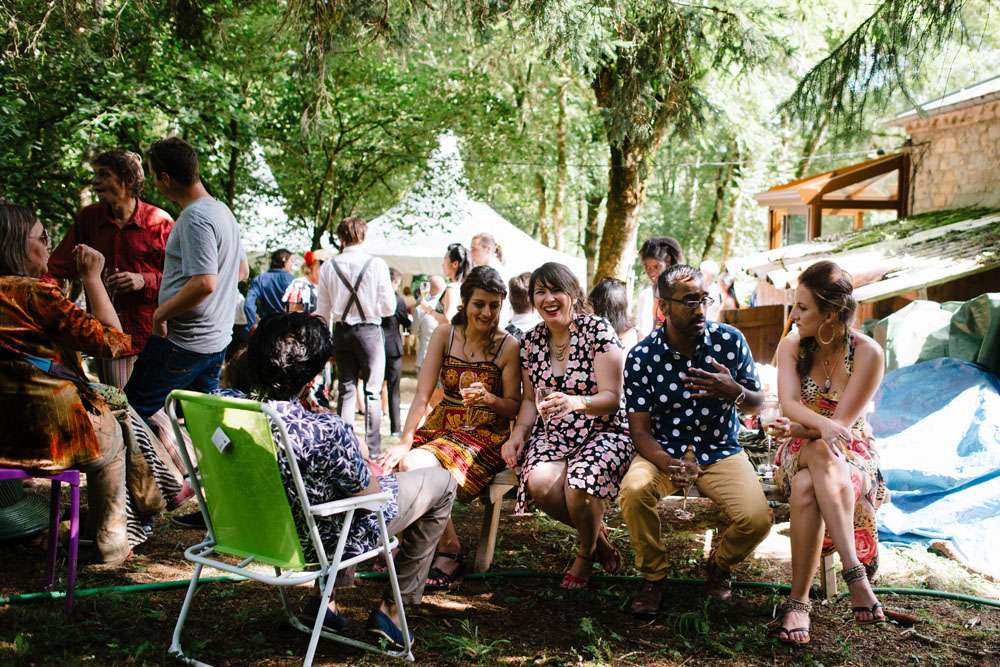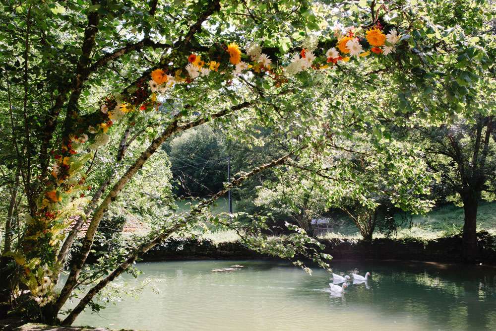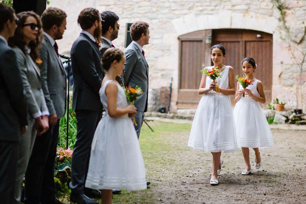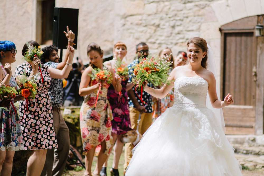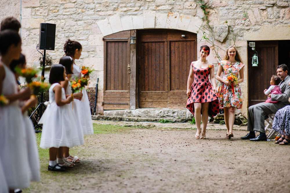 The wedding was held in the family home, a watermill in Loze, Tarn et Garonne, South West France. “We are both very political, and very much on the left”. wrote the bride. “We would also both identify as radical feminists so we really wanted to reclaim the concept of a wedding, out of its problematic patriarchal roots and into something that was meaningful to us. We only followed tradition when it made sense to us. For example, my godfather had really insisted to walk me to the altar (both my parents having passed away), but I had to vehemently refuse, as the symbolism of the bride being taken to her husband by a father figure is rather problematic to us. It was important to me to walk alone, yet surrounded by my chosen family: my bridesmaids and bridesmen.”
