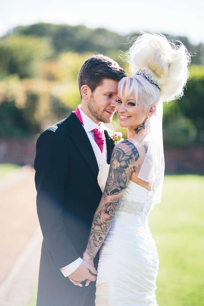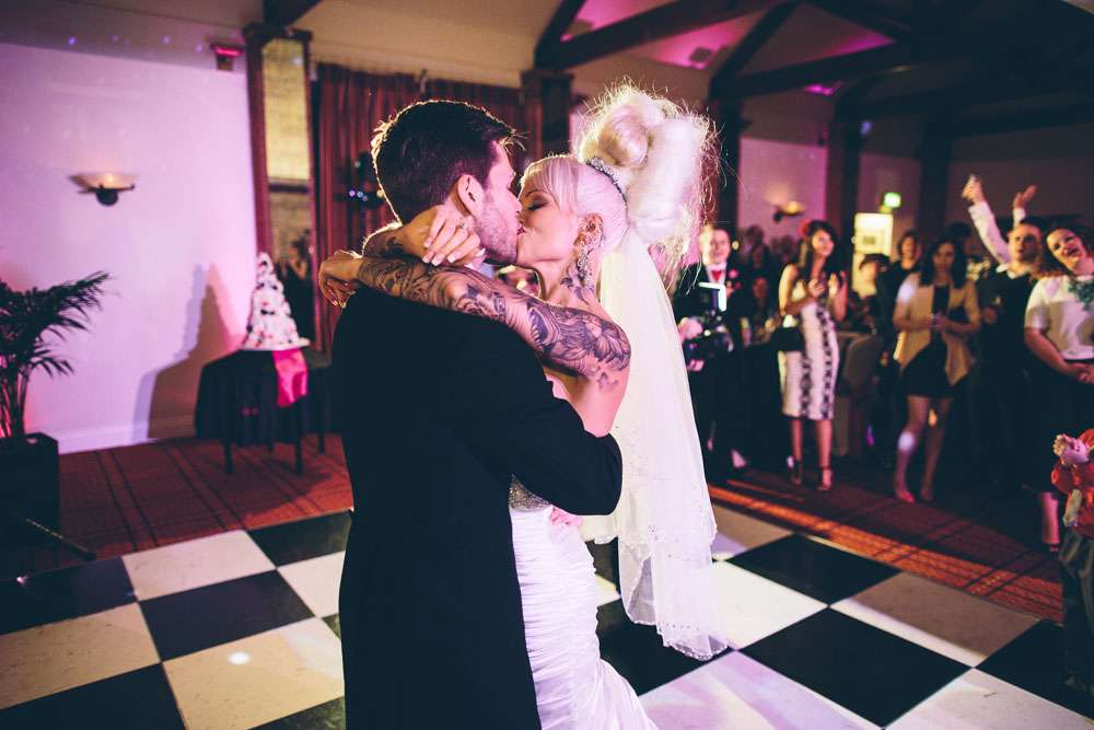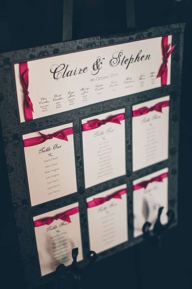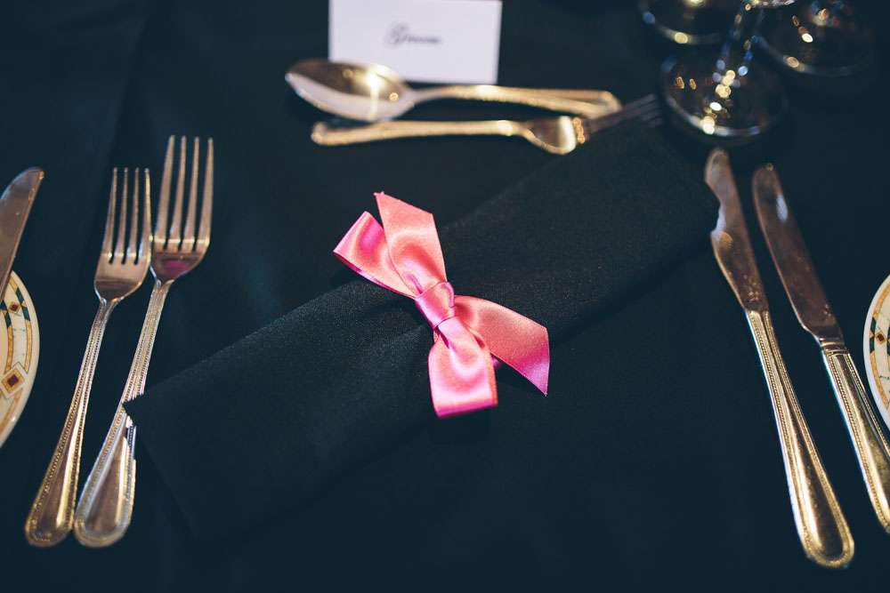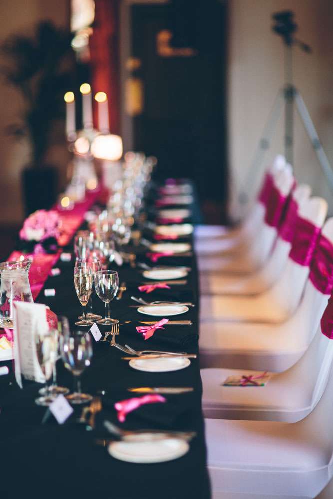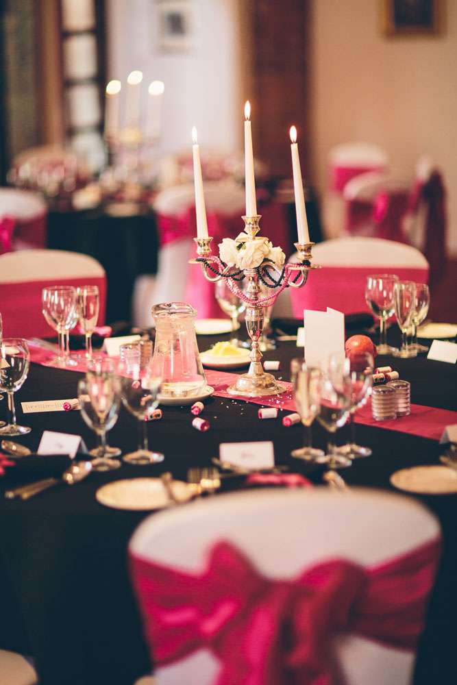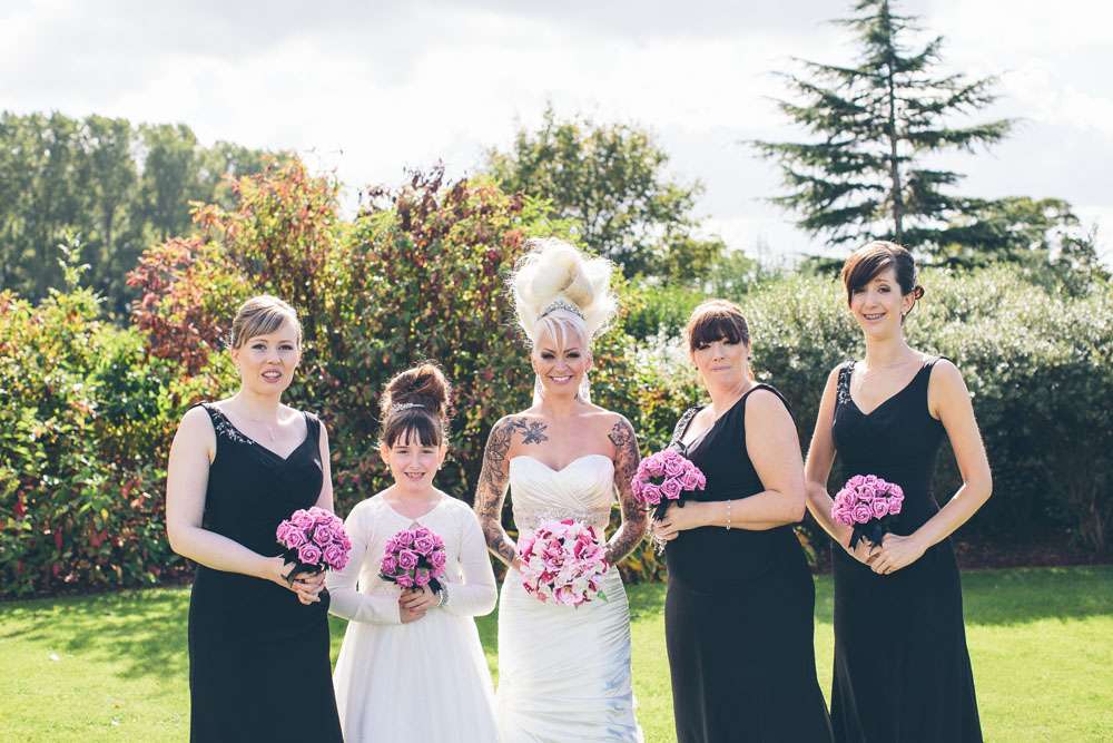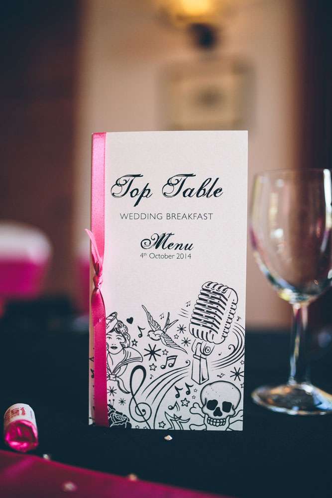 “As music features so heavily in our lives it was important for us to feature this in our wedding day especially rock music! We also had skulls on the tables and fish and chips as our evening meal! We chose a striking colour scheme, black and pink, and wanted to avoid pastels at all costs. I had always wanted my bridesmaids in black (despite the association with funerals and the macabre) and we decided the best way to avoid making the black look too heavy was to team it with bright pink!”