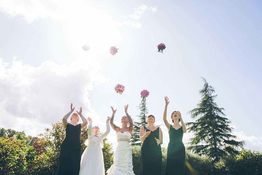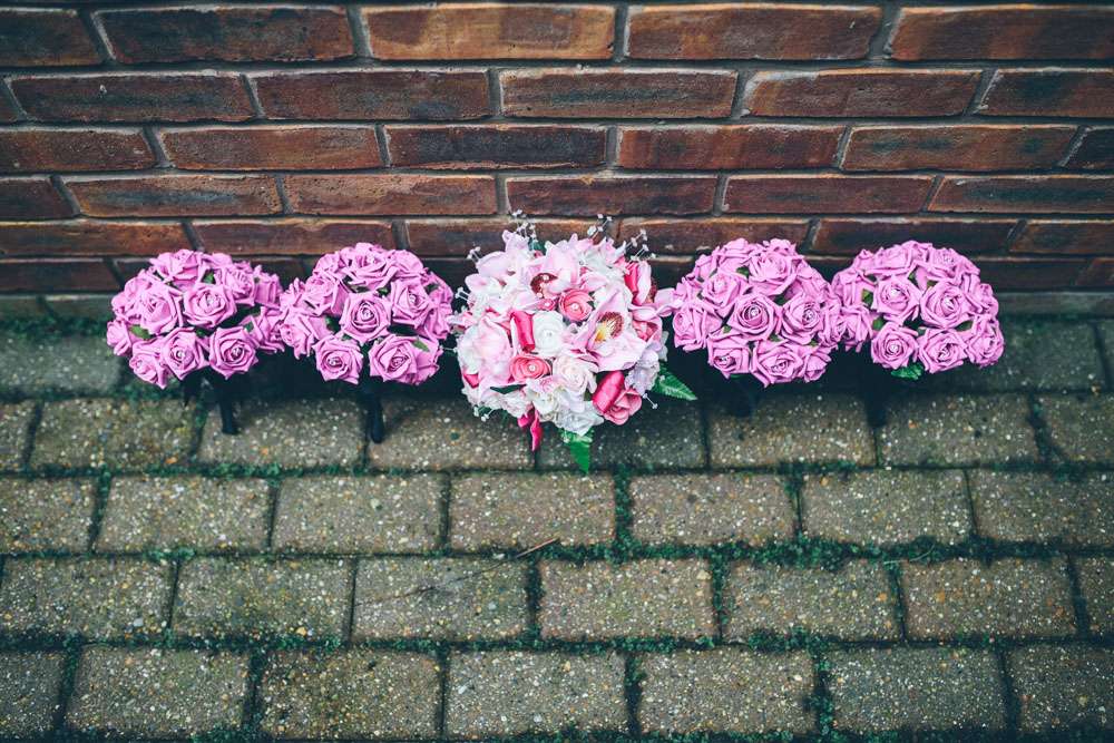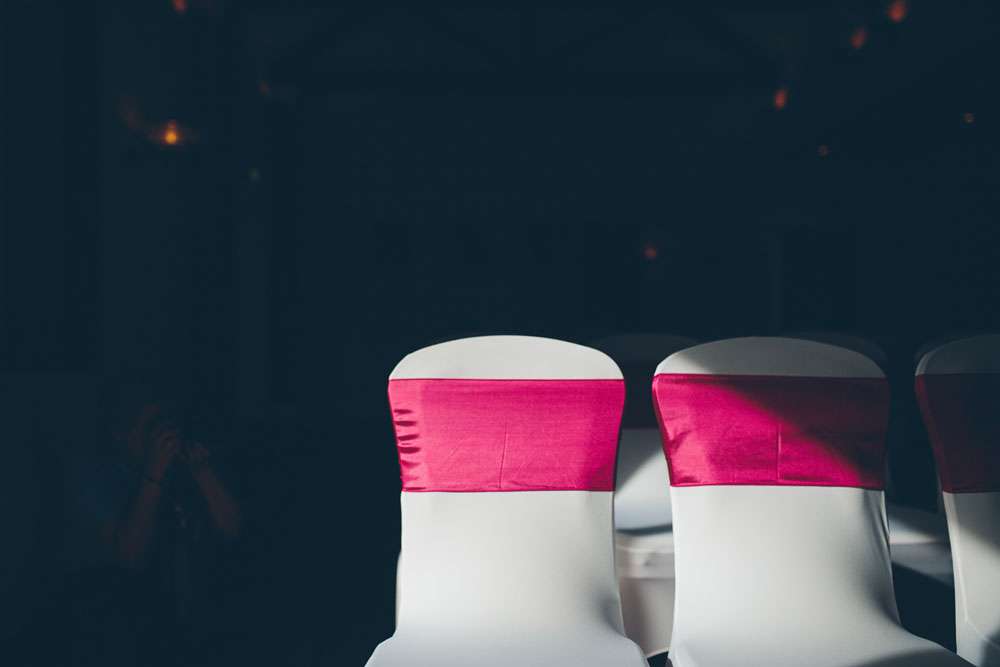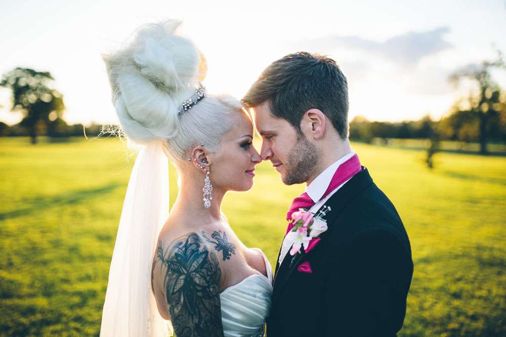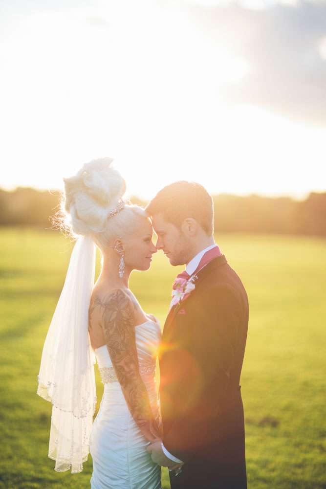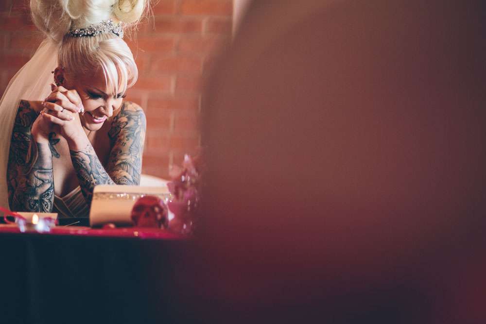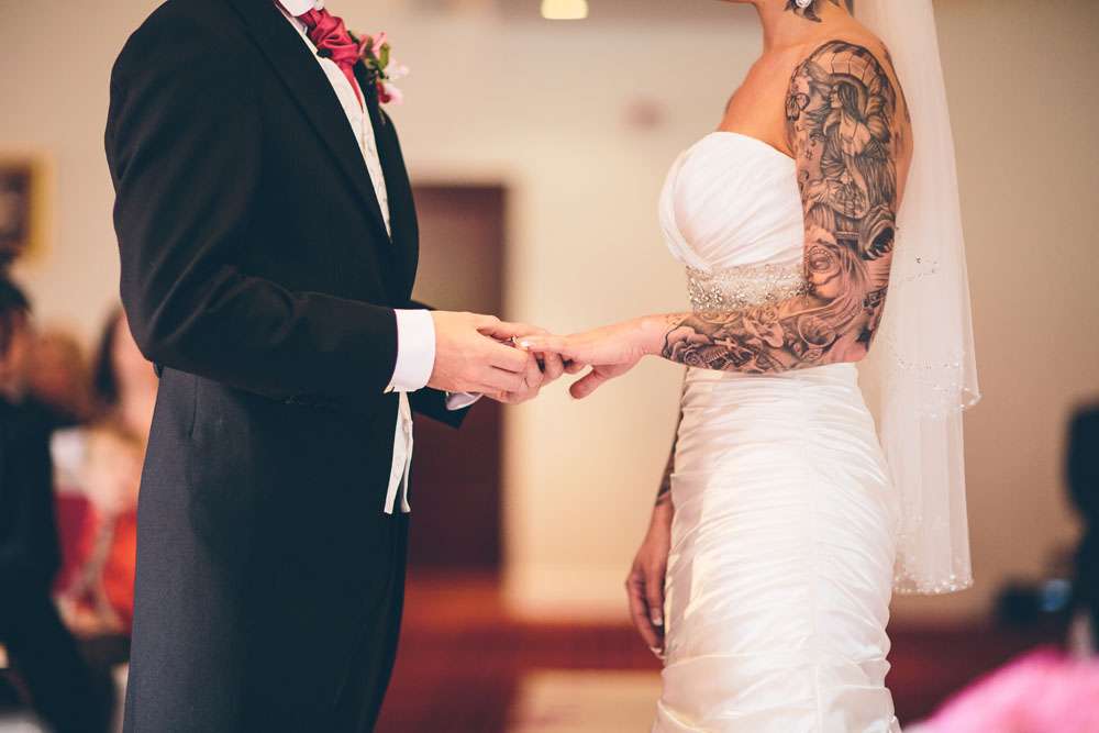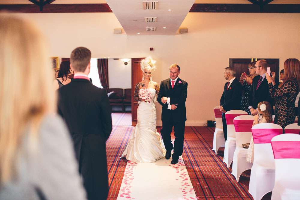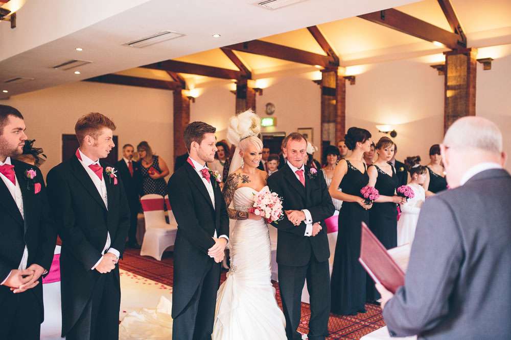 “As music features so heavily in our lives it was important for us to feature this in our wedding day especially rock music! We also had skulls on the tables and fish and chips as our evening meal! We chose a striking colour scheme, black and pink, and wanted to avoid pastels at all costs. I had always wanted my bridesmaids in black (despite the association with funerals and the macabre) and we decided the best way to avoid making the black look too heavy was to team it with bright pink!”