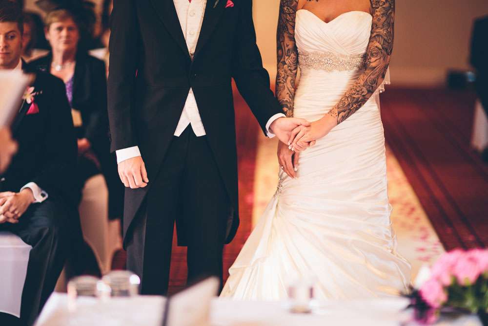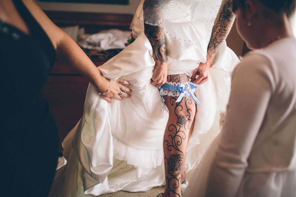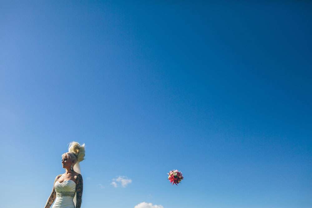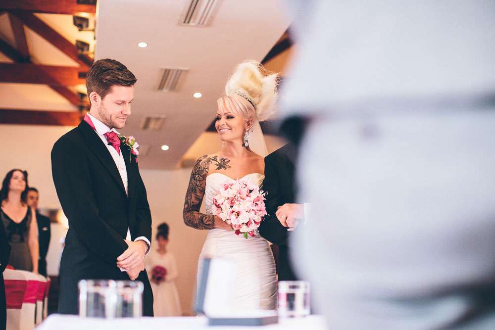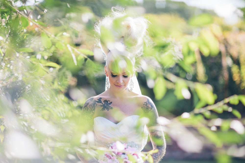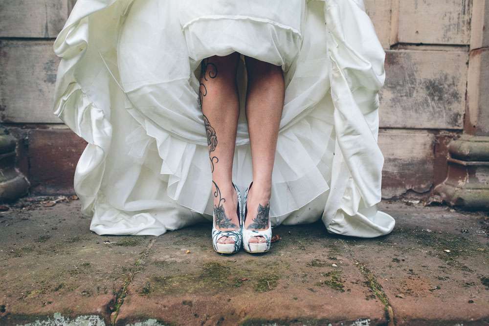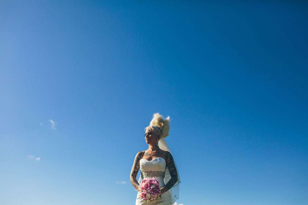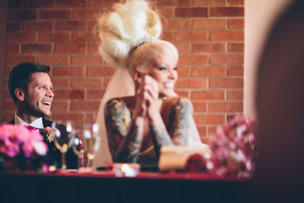 Claire wore a Sottero & Midgley gown and Iron Fist shoes. “I knew straight away that I wanted to wear something elegant, and something very fitted to accentuate my new figure (we had both recently just lost a lot of weight). While the dress ended up being quite traditional, I added some quirk and wow factor with my massive hair and rock chick shoes!”