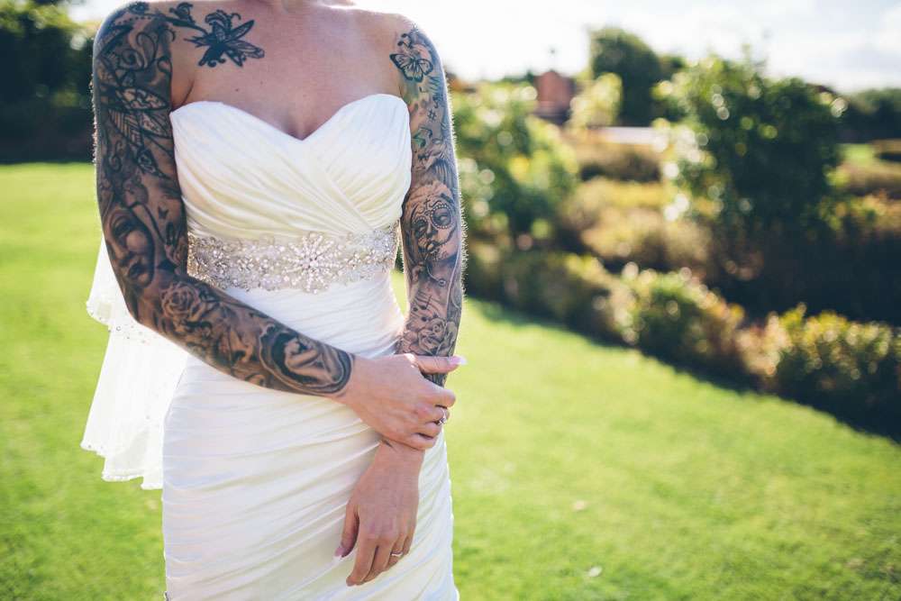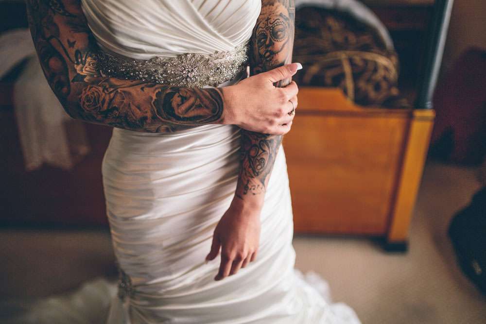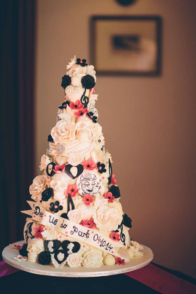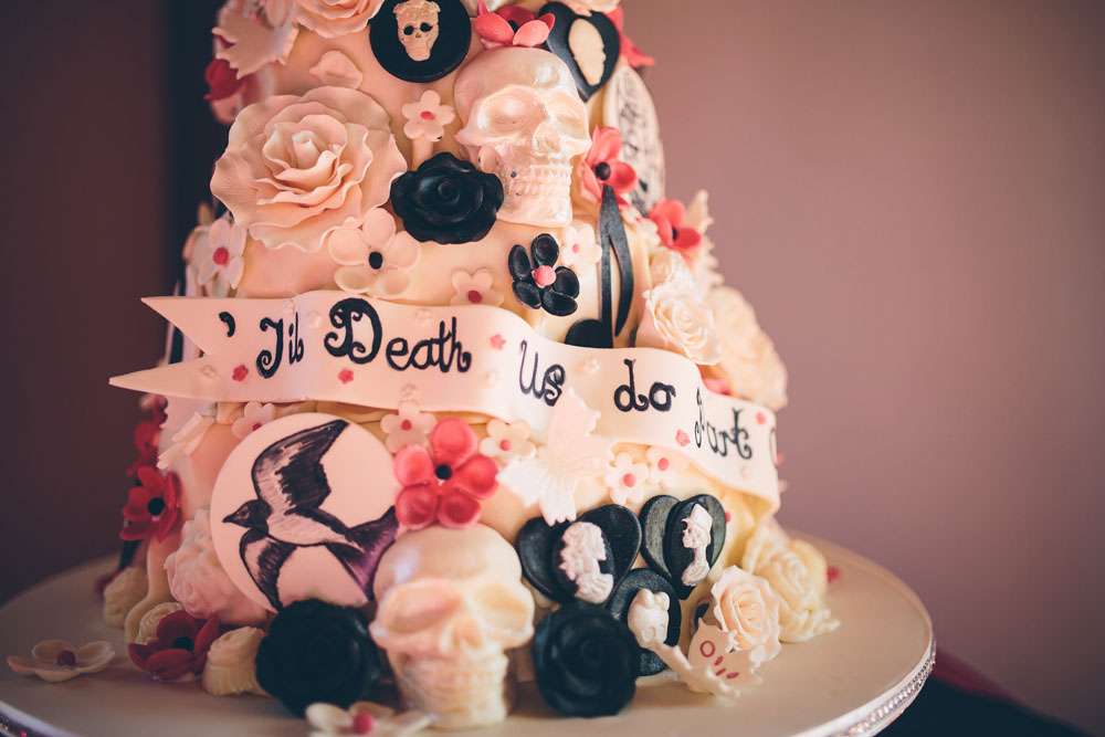 “One of the things we splurged on the most was our beautiful wedding cake. Whilst visiting a wedding fayre I found a cake decorator making the most individual the cakes I had ever seen! I knew straight away that I needed a cake like that at my wedding. We discussed our colour scheme and what makes us tick and we wanted our cake to mirror our personalities so it meant a lot to have things in it that would be so very ‘Ste and Claire.’ I certainly didn’t want a traditional 4 tier cake that could be at anyone’s wedding and I certainly didn’t get that! The cake was a work of art, it was 6 tiers of various flavours covered in sugar paste embellishments that mirrored details in my dress. It also had copies of my tattoos, had the words ‘till death do us part’ etched on it and was covered in skulls! It was breathtaking to look at and devastating to cut!”