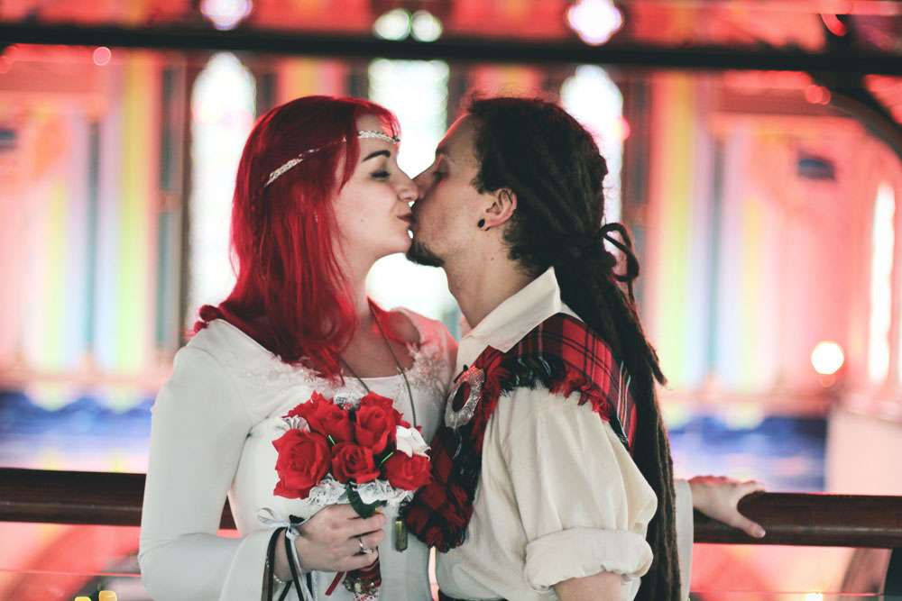 The bride wore a medieval inspired wedding dress which was from Dragonfly Dress Design. Her amazing ‘Don’t Panic’ tights were from Tattoo Socks on Etsy. “My dress was vintage from the 1970s. At Dragonfly Dress Design they not only sell vintage pieces but also create vintage style dresses to your specifications. This was something I was considering until I tried on this dress and fell in love! They changed the lacing at the back to red ribbon and added some beaded embellishments for me to make it extra special. My headpiece was beautifully crafted by Thyme2Dream on Etsy. The circlet was perfect for me as it incorporated pearls to match my other jewellery, autumn leaves, and celtic style twists!”