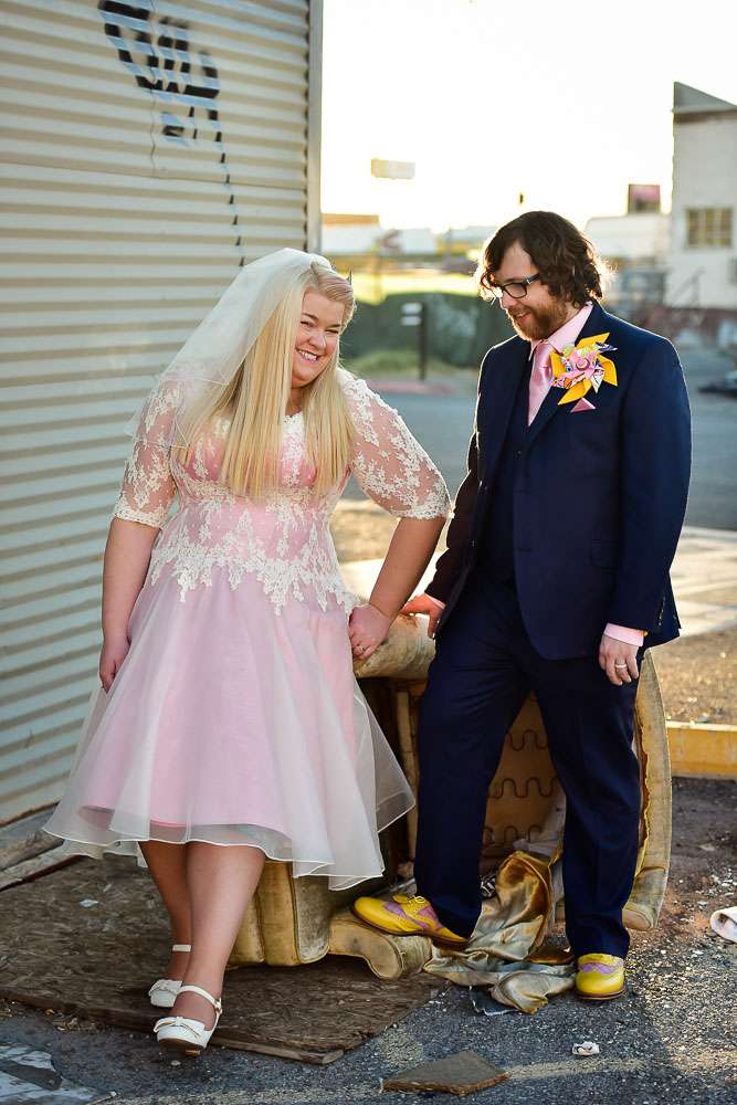 Katie had her pink wedding dress and rainbow unicorn headpiece (!!) made by The Couture Company in Birmingham. “The rest of the ideas kind of just developed from there”, she continued. “I knew pink had to be included in my wedding dress because pink is just the best and I kind of just landed on yellow for Pam, my maid of honour. It wasn’t until we were looking for Richard’s shoes that things really clicked in to place. I wanted him to have something amazing so obviously Vivienne Westwood was one of the only places to look and there they were. They were pink and yellow and fabulous! Richard loved them and even though they would become one of the most expensive things he would ever wear, he had to have them.”