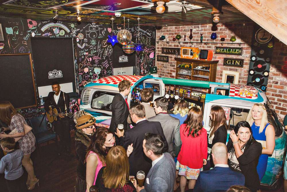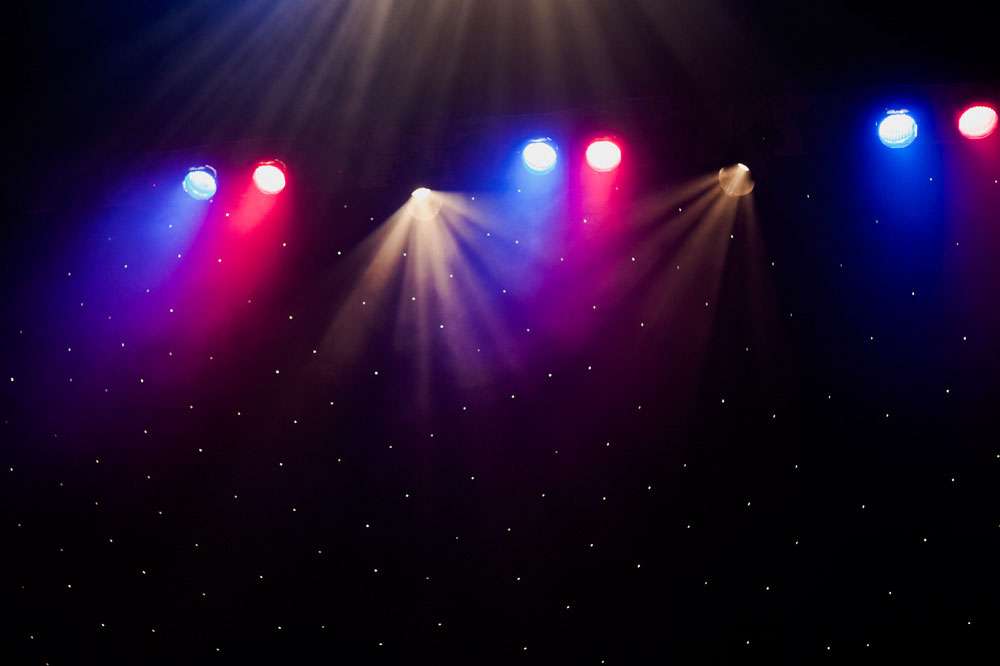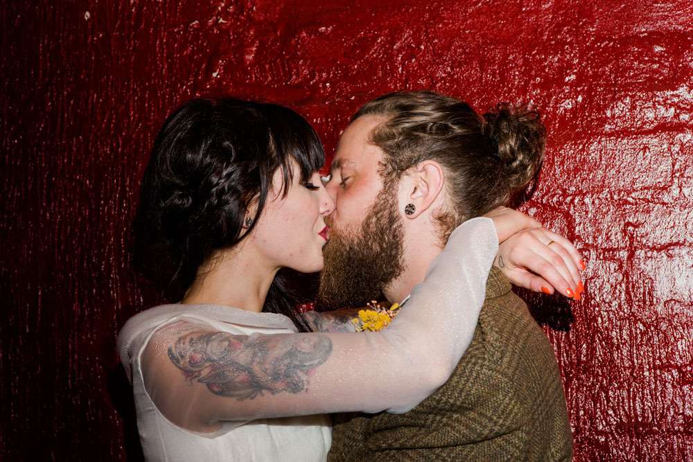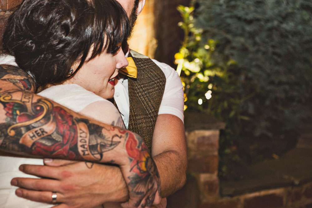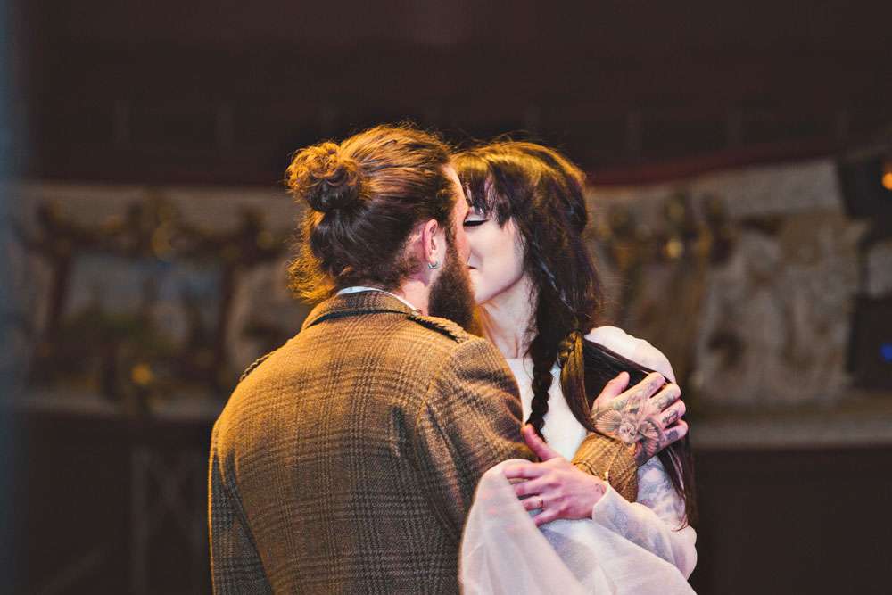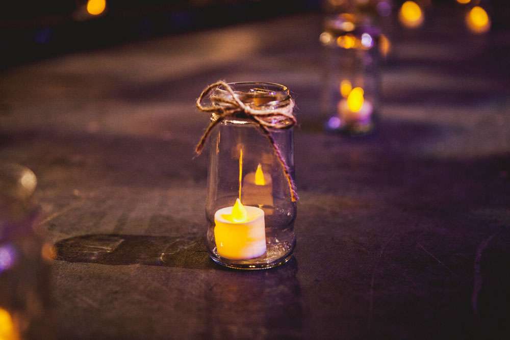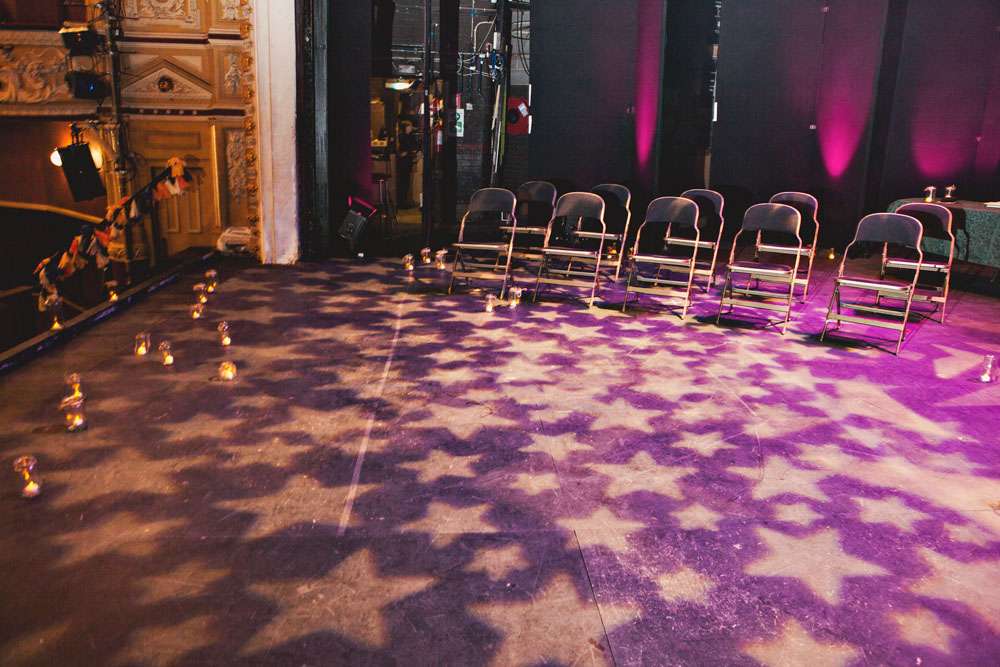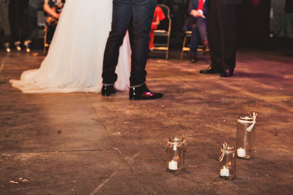 “The stage was set up to have a starry night backdrop and tea lights in jam jars scattered over it”, began the bride. “Someone has commented it was very midsummer’s nights dream, which wasn’t the theme but it did look like that. It felt very romantic and special and because we were on stage away from people it felt actually very intimate. It was exactly what we wanted in a venue; laid back, not overdone, faded but glamorous.”