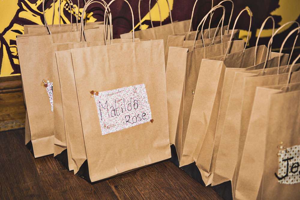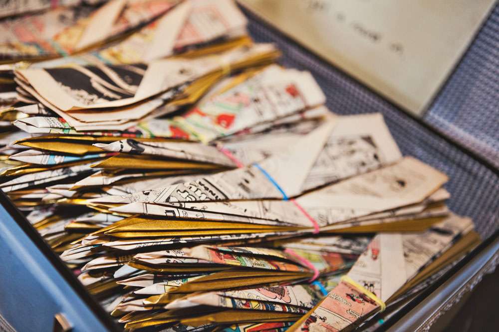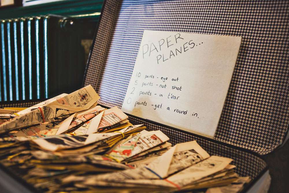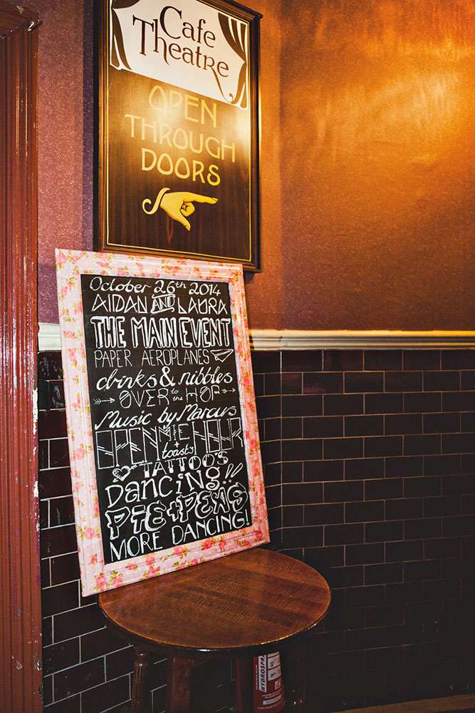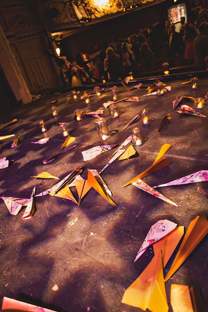 “Another thing we made and loved was the 700 paper areoplanes, which we used instead of confetti! We couldn’t have confetti due to it being in theatre, so we folded them out of gold paper and old copies of The Beano and threw them instead. I also sourced the vintage suitcase to hold them, as well as all the paper tassels and pom poms. Aidan painstakingly chalked up the order of service, which everyone loved. Luckily both our venues were very cool on their own and beautiful enough to not need much added. I love how they look on the pictures.”