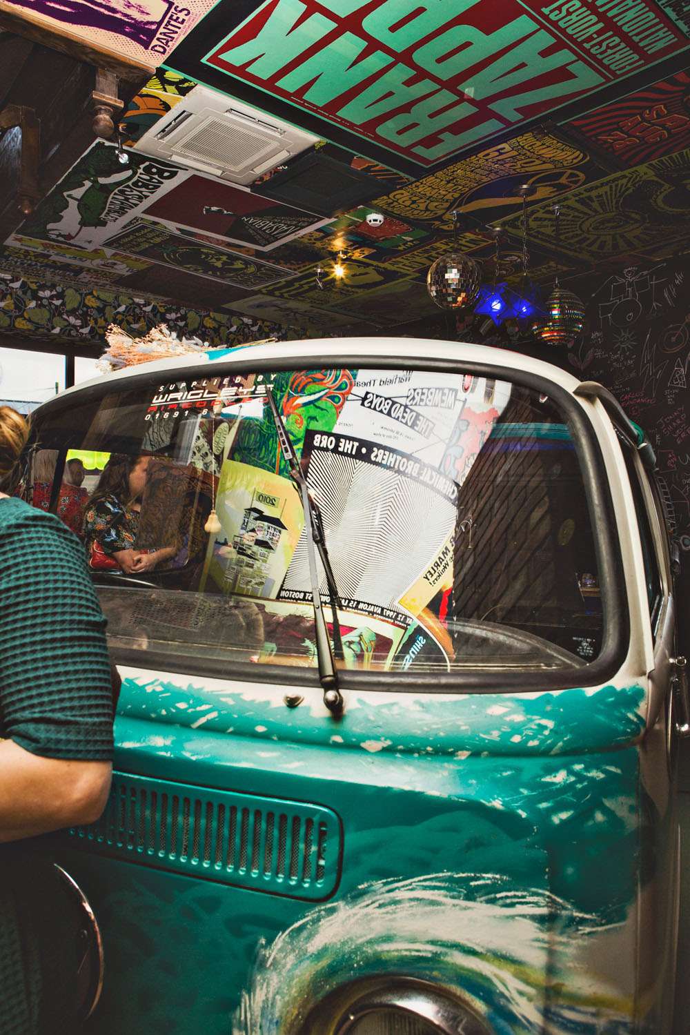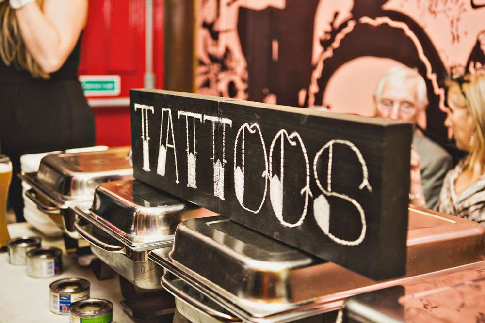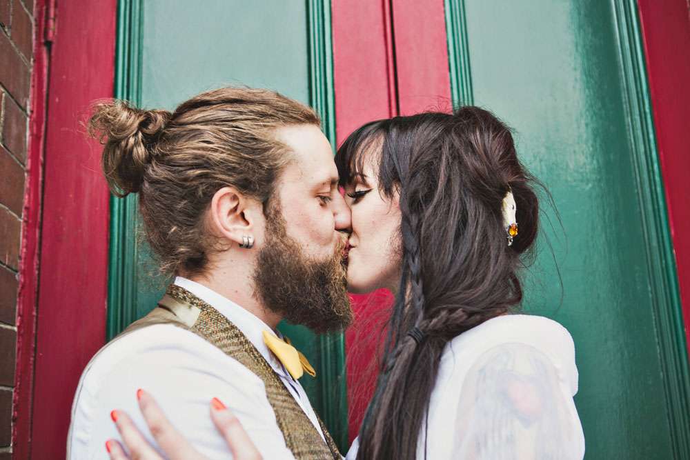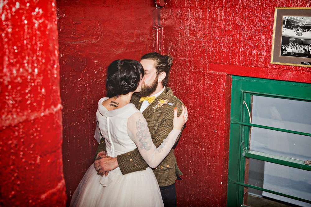 “Another thing we made and loved was the 700 paper areoplanes, which we used instead of confetti! We couldn’t have confetti due to it being in theatre, so we folded them out of gold paper and old copies of The Beano and threw them instead. I also sourced the vintage suitcase to hold them, as well as all the paper tassels and pom poms. Aidan painstakingly chalked up the order of service, which everyone loved. Luckily both our venues were very cool on their own and beautiful enough to not need much added. I love how they look on the pictures.”