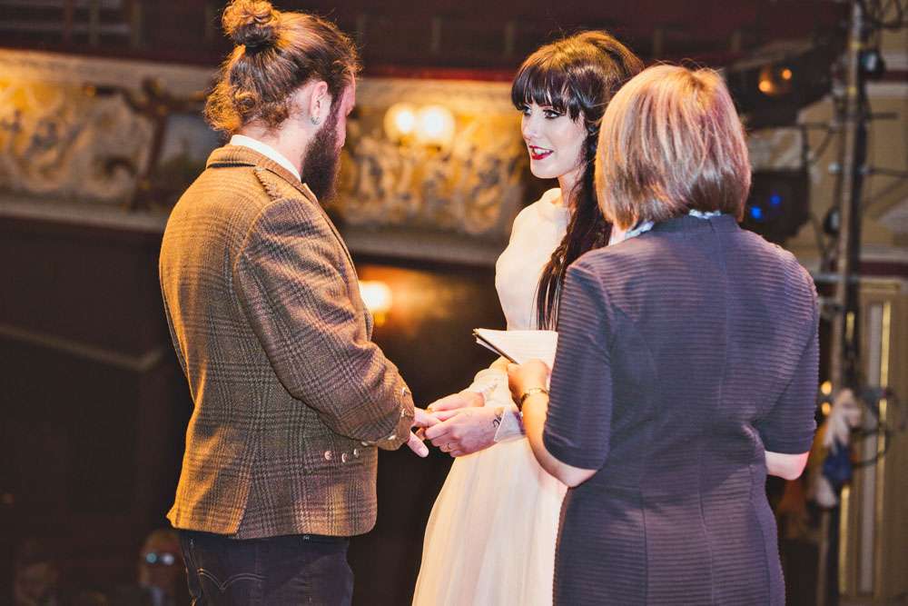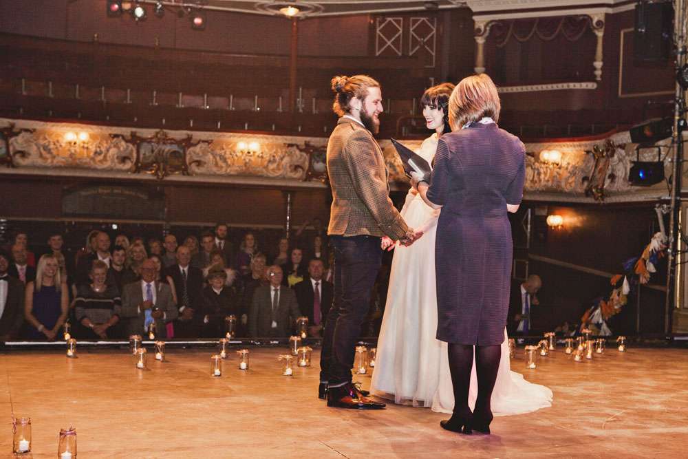 Laura and Aidan were married on the stage at Wakefield Theatre. They had a small wedding budget, spending just £3,500, but their wedding was every bit as special as one with 10 times the money in the pot!