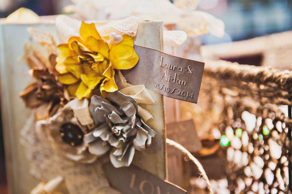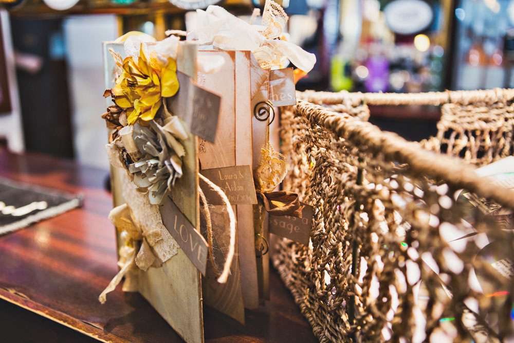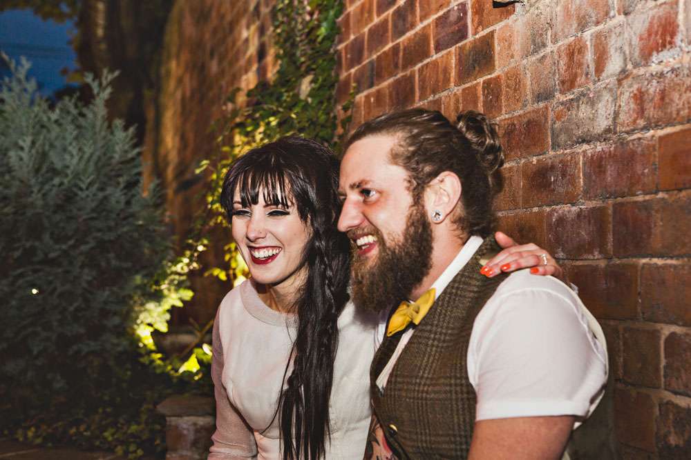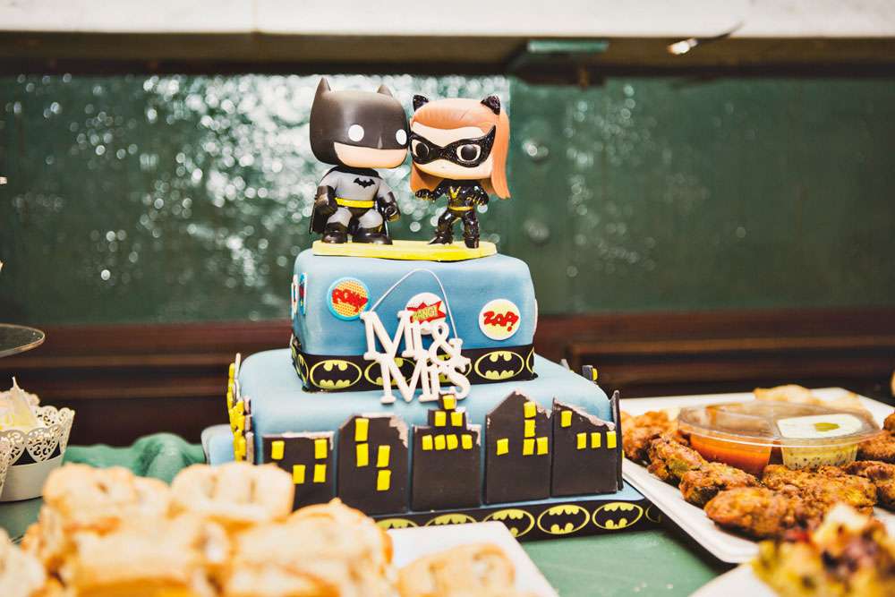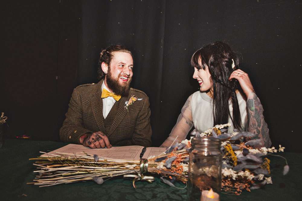 A lot of this wedding was do-it-yourself, including the Gotham City cake which was made by the bride’s aunt. “The cake was fabulous and had a batman and catwoman on the top as a nod to the fact that Aidan loves comics. Other decorations included dried flowers that I arranged myself and tied with twine and ribbon. I wanted something to keep and I wanted something muted that mimicked autumnal colours. We also made our invitations ourselves. They included theatre tickets for each guest inside that the theatre kindly personalised and printed out for us.”
