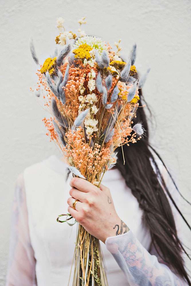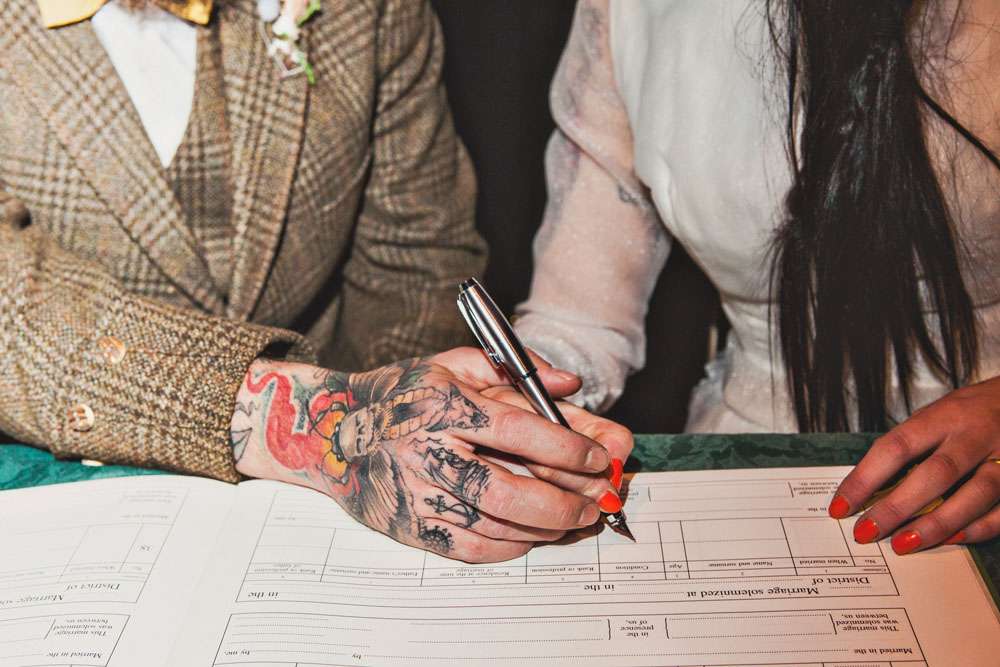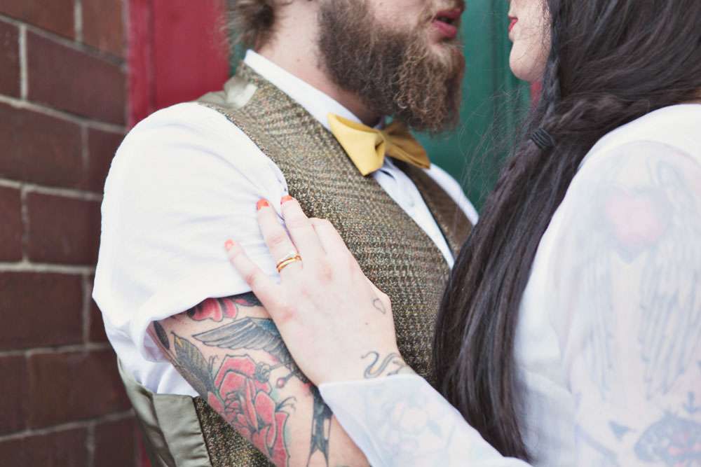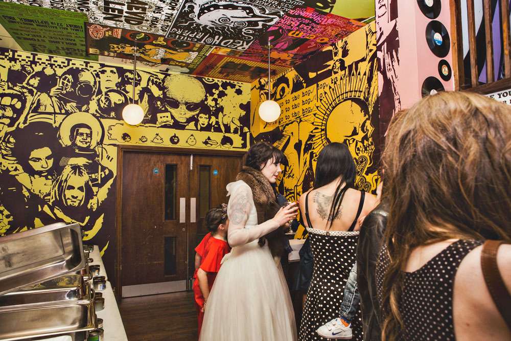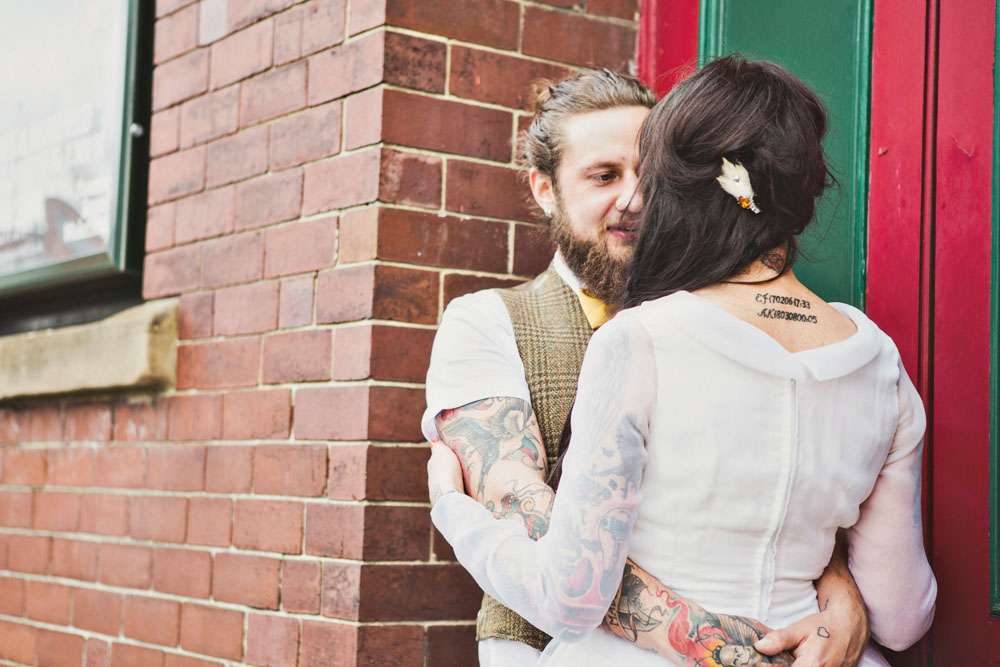 A lot of this wedding was do-it-yourself, including the Gotham City cake which was made by the bride’s aunt. “The cake was fabulous and had a batman and catwoman on the top as a nod to the fact that Aidan loves comics. Other decorations included dried flowers that I arranged myself and tied with twine and ribbon. I wanted something to keep and I wanted something muted that mimicked autumnal colours. We also made our invitations ourselves. They included theatre tickets for each guest inside that the theatre kindly personalised and printed out for us.”