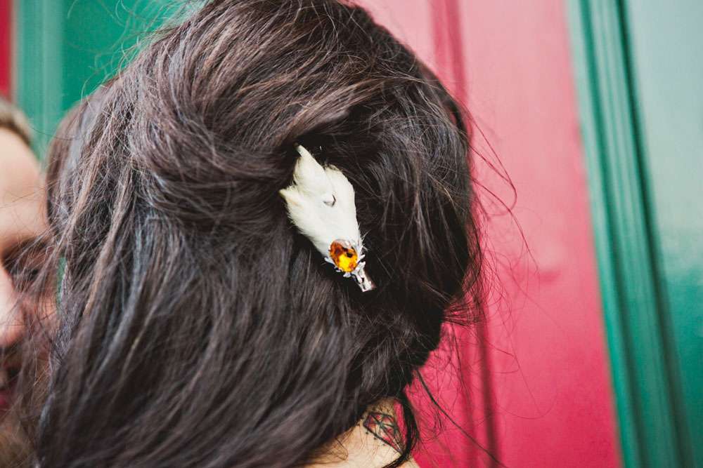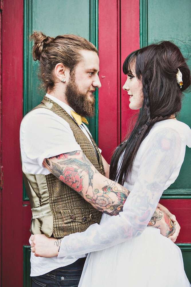 The bride wore a vintage wedding dress which she found on eBay, “My dress was a stunning princess style gown with a touch of Audrey Hepburn. My shoes were vintage Manolo Blahnik with a kitten heel in a brogue style in pale blue and white. My bridesmaids were my daughters, aged 6 and 8, and they were orange jumpsuits from Monsoon and stripy black and white pointy shoes. My cousin, Alice, was also a bridesmaid but wore whatever she wanted. She looked great and helped out so much.”