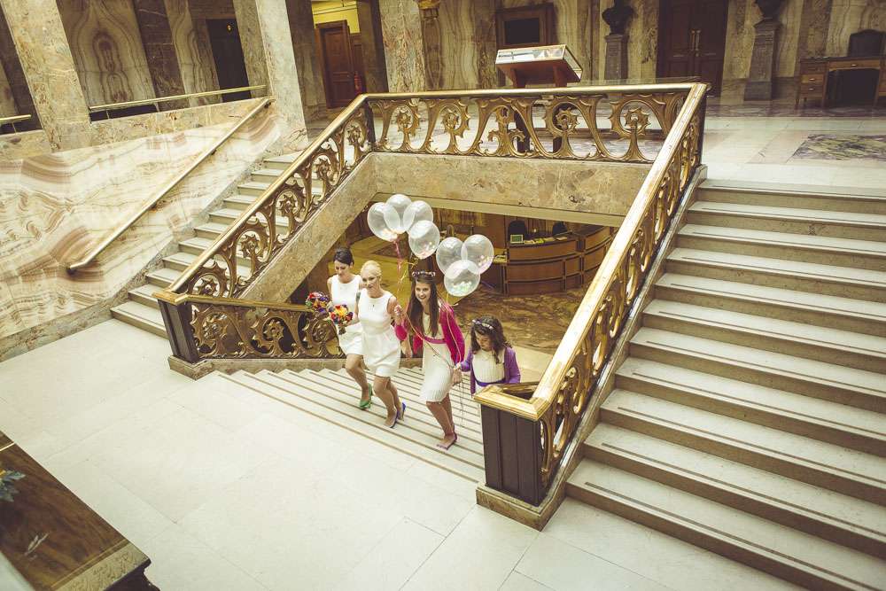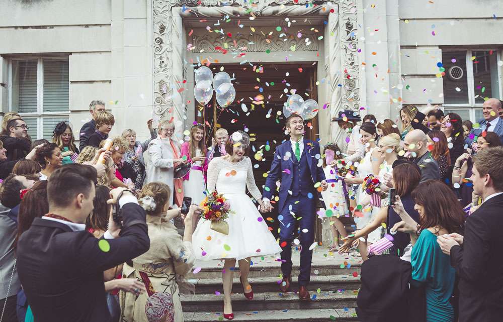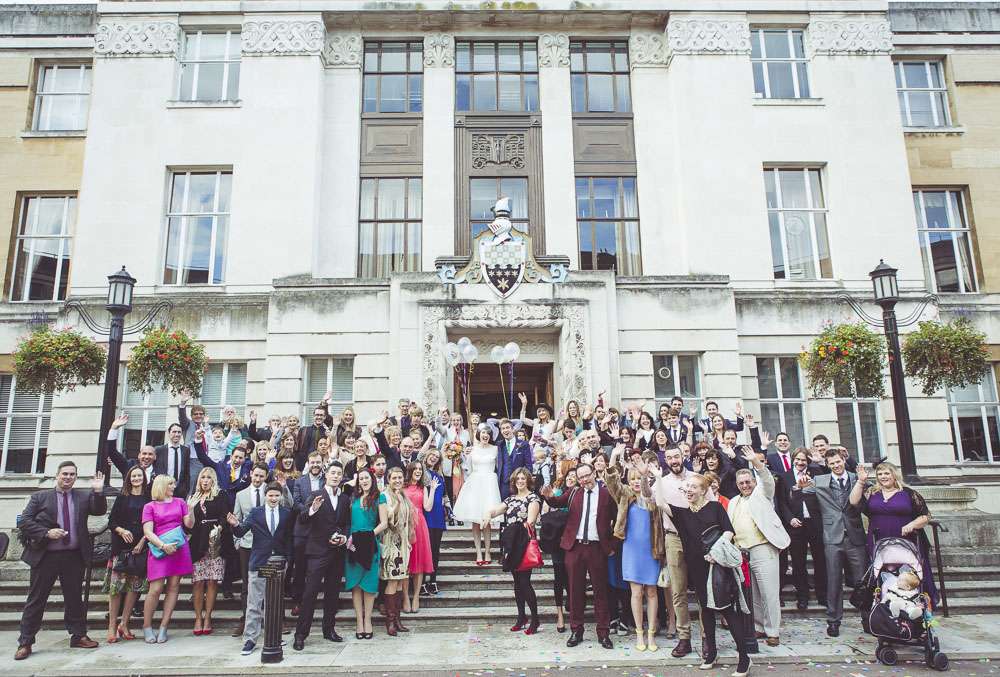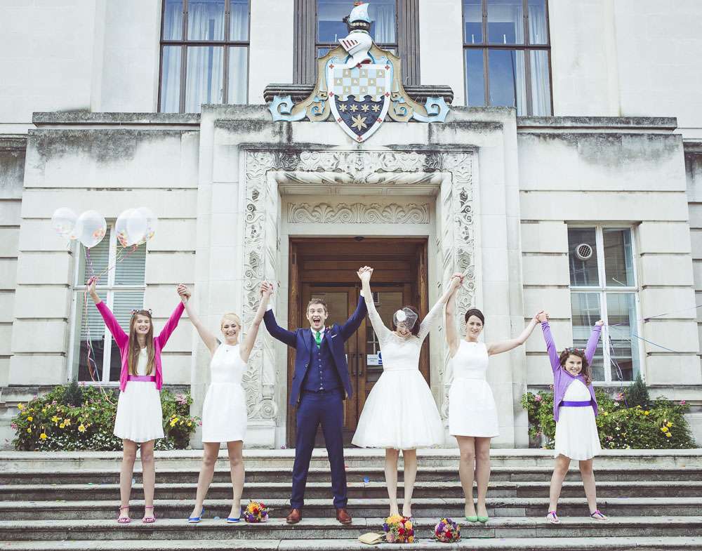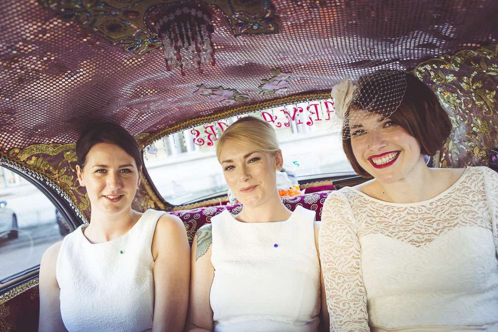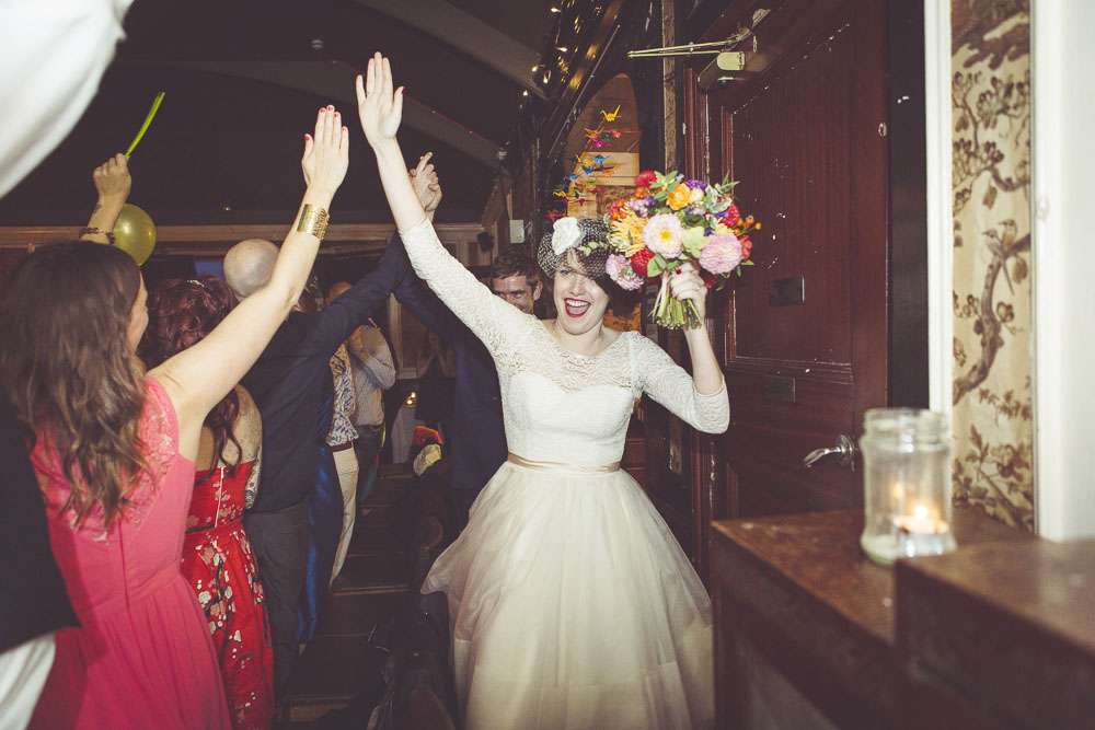 “One of my biggest worries about the wedding was that I would just cry the whole way through the ceremony, not get any words out and generally look disgusting”, she said. “In the car on the way my bridesmaids Googled ‘techniques to stop crying’ and discovered that apparently if you recite song lyrics it can help. We ended up singing Bon Jovi ‘Living on a Prayer’ at the top of our voices all the way to the ceremony – I think the driver thought we were drunk! And I managed not to cry through the ceremony (mostly)! We were actually both quite surprised at how much we loved the ceremony part, even all the photos outside beautiful Wandsworth Town Hall. Walking into the reception to cheers from our friends and family was pretty amazing too. It was really overwhelming to see everyone in there!”
