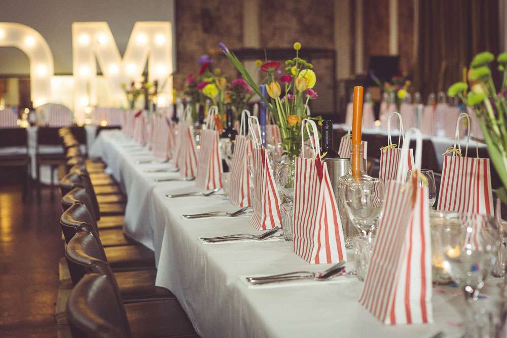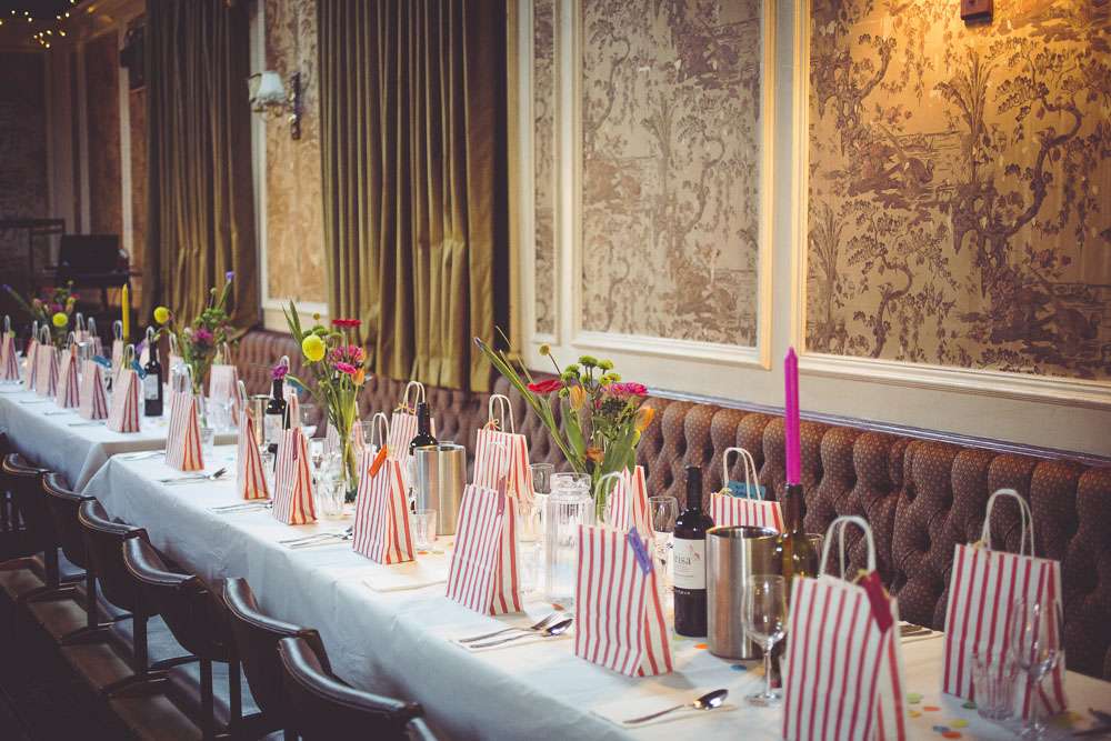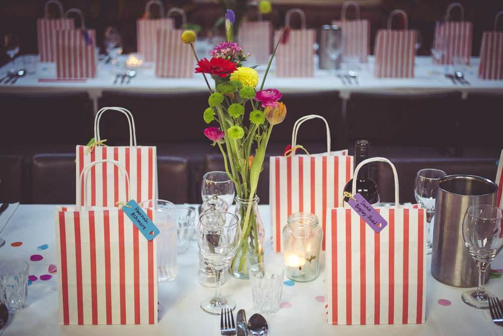 However the couple saved money by DIYing a lot and having their reception in a pub. “Having the reception in the pub was brilliant, not only because it’s the place we met, but it also doesn’t have a hire charge, just a minimum spend. Although we had to get all our food and drink through them we still saved around £4000 compared to other venues we saw. We tried to do as much ourselves (or with the help of friends) as possible, and we discovered lots of talents along the way! We got up super early two days before the wedding to get the table flowers from the flower market, and arranged them in our kitchen the day before the wedding. Etsy and eBay were great for loads of things, including wedding bands, although we probably didn’t need the tiny heart-shaped hole punch… I hand wrote all of the place card labels and the seating chart, and we enlisted friends and family to help pack the goody bags! The house was like a production line the week before the wedding!”