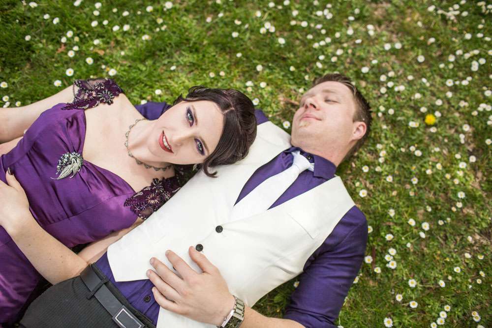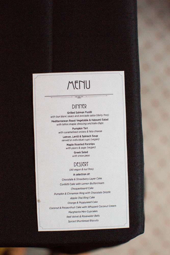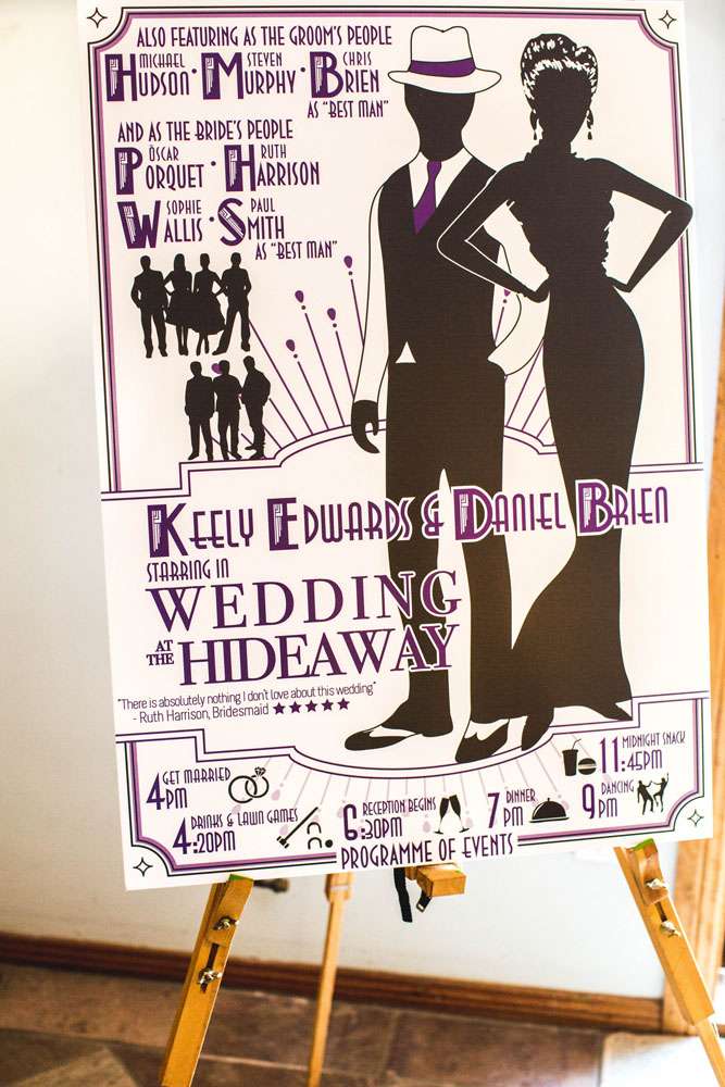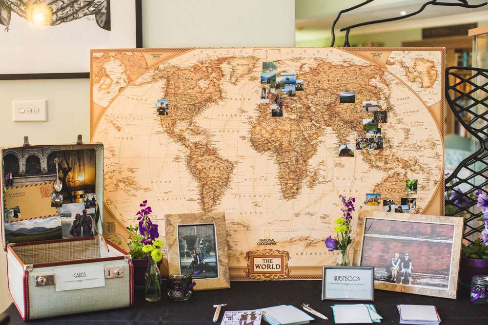 “I think really our theme was ‘us’, as obvious as it sounds. We had a mixture of different inspirations because we have a range of different interests. I would say the overall themes were colour (I wanted everything as bright and colourful as possible!), travel (we love travelling, so we decorated a big sepia map with pictures of us all over the world and used a vintage suitcase as a wishing well), games, and vintage art deco (my dress was 1920s inspired, we used a vintage style movie poster instead of paper programs and we kept all the stationary in an art deco style). Sounds like a mish mash of themes when you look at it like that, but it all came together because they’re all things that we love.”