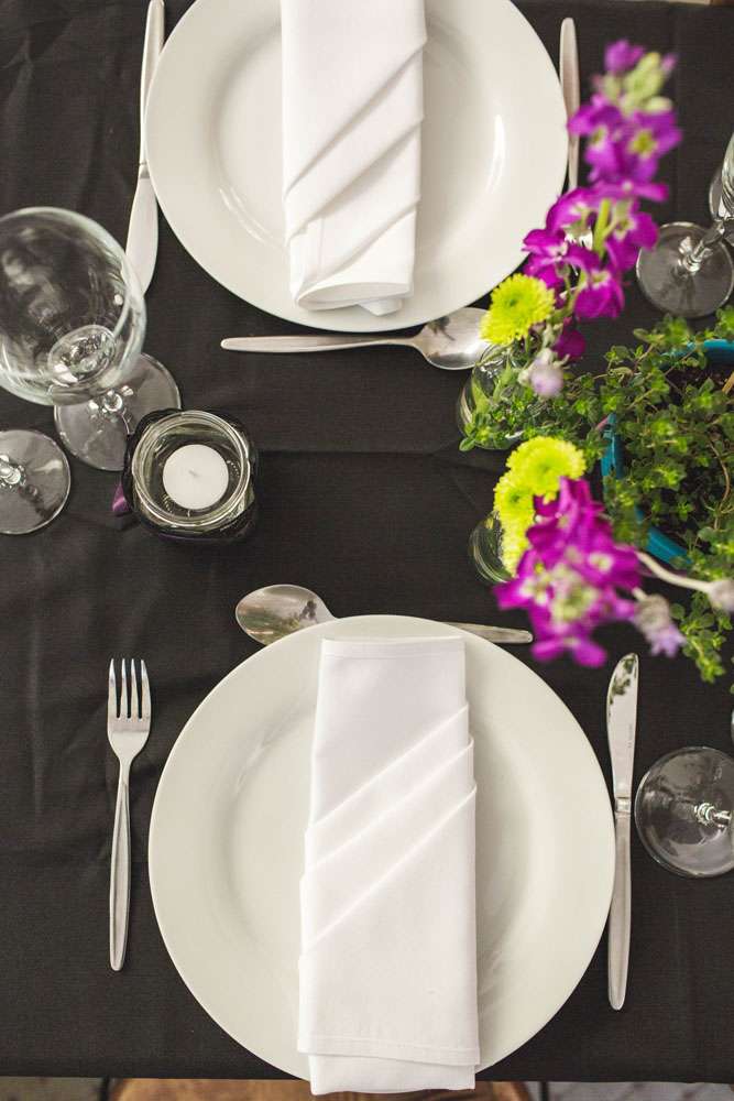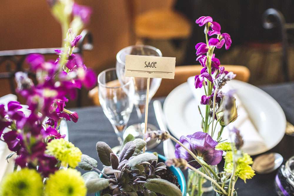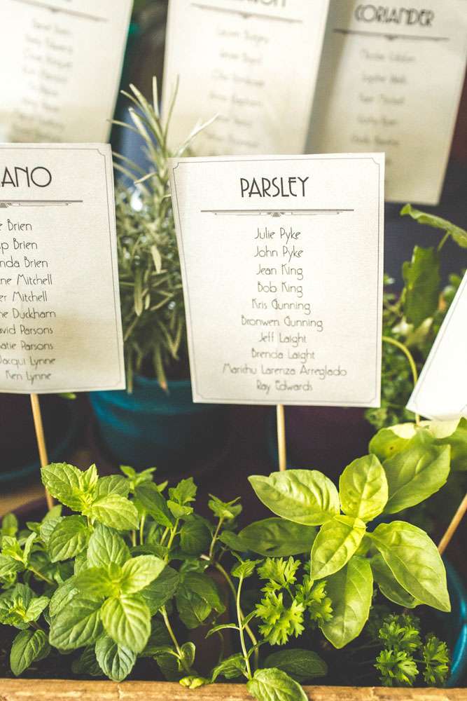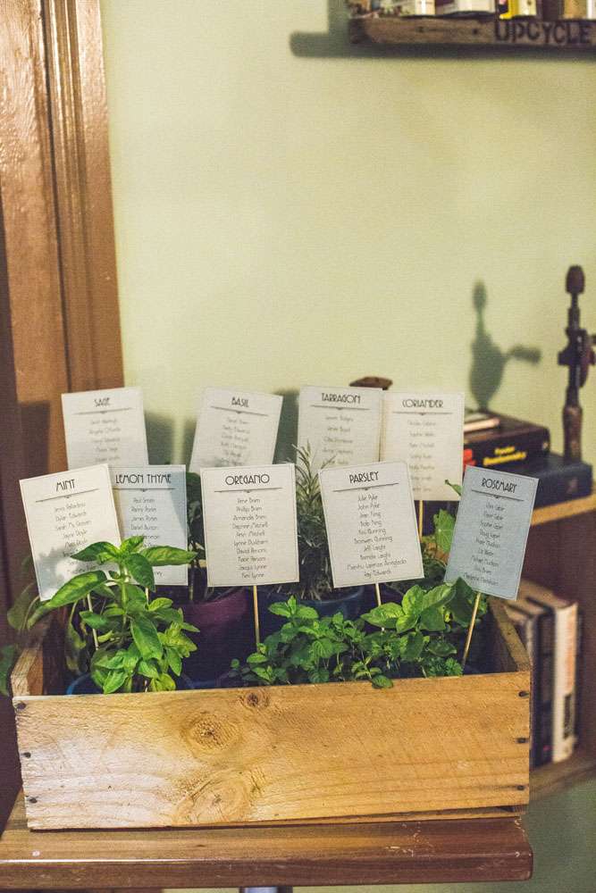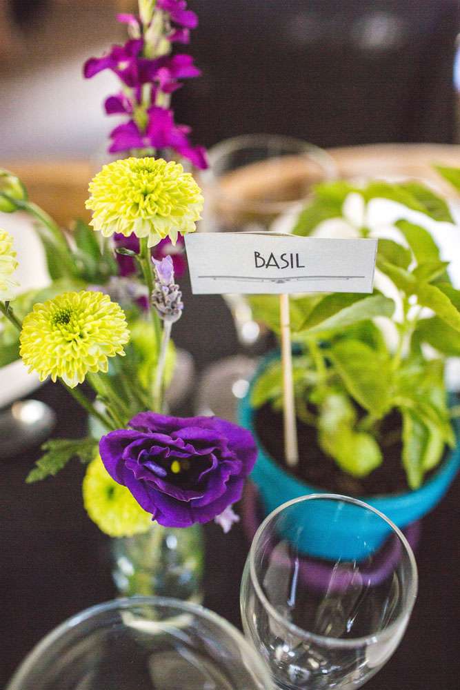One of the biggest considerations for this couple was to not be wasteful. The bride concluded, “We tried to avoid any plastic packaging on things. Our favours were homemade vegan chocolate puddings in recycled glass jars for example. This was why we used a poster as a program instead of lots of bit of paper, most of which would have been left behind and thrown away. For table centrepieces we used potted herbs, which meant we got to keep them and use the herbs rather than throwing away floral centrepieces after they died.”