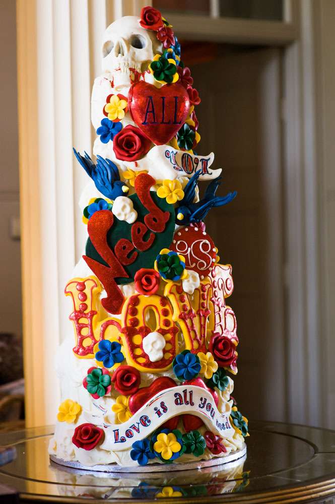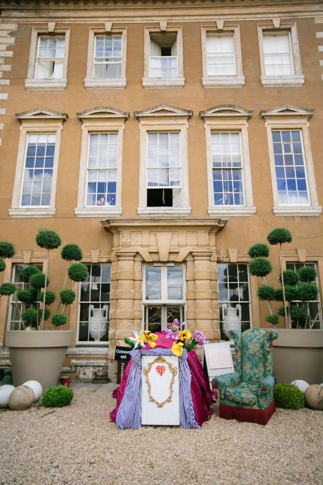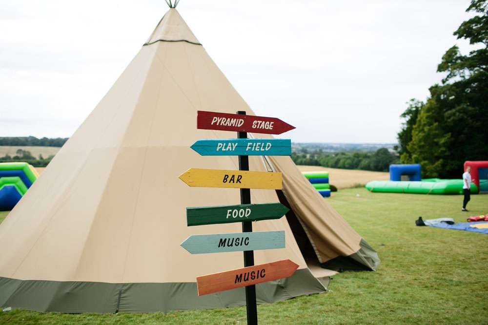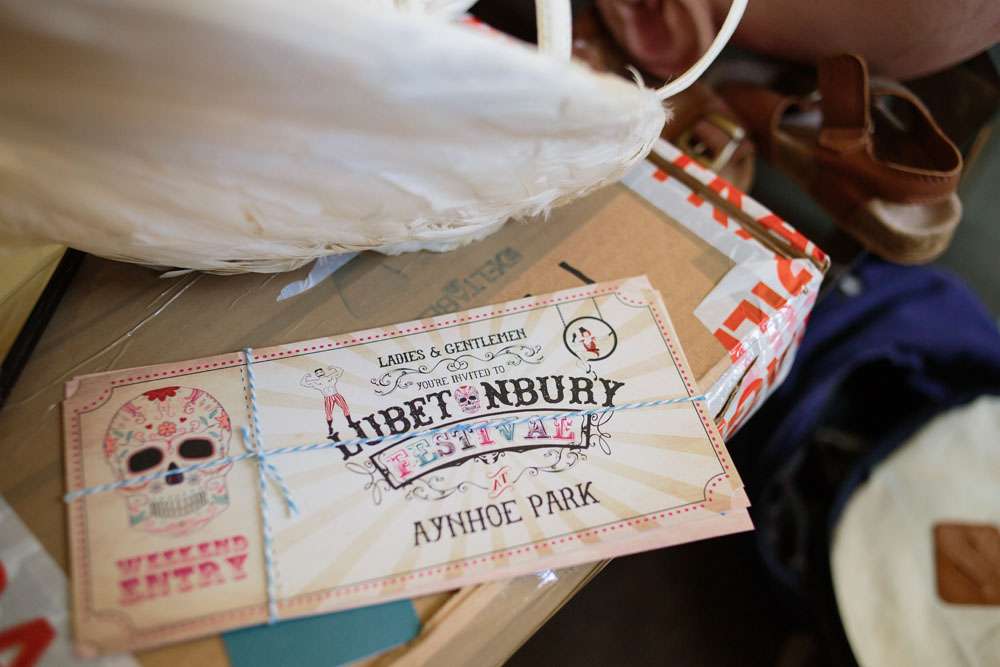 “We met at a friend’s BBQ and the week after went to Reading Festival together so we wanted our wedding to have a festival feel”, explained the bride. “We wanted people to feel like they had been on a weird acid trip that couldn’t have been real when they left! It sort just took shape over time. We met Hamish Guerrini, the Druid Minister who officiated our ceremony, at his stage, The Rabbit Hole, at Glastonbury two months before the wedding. After we met him we completely changed the wedding theme to include him! We added the tunnels and different rooms for guests to be led into.”
