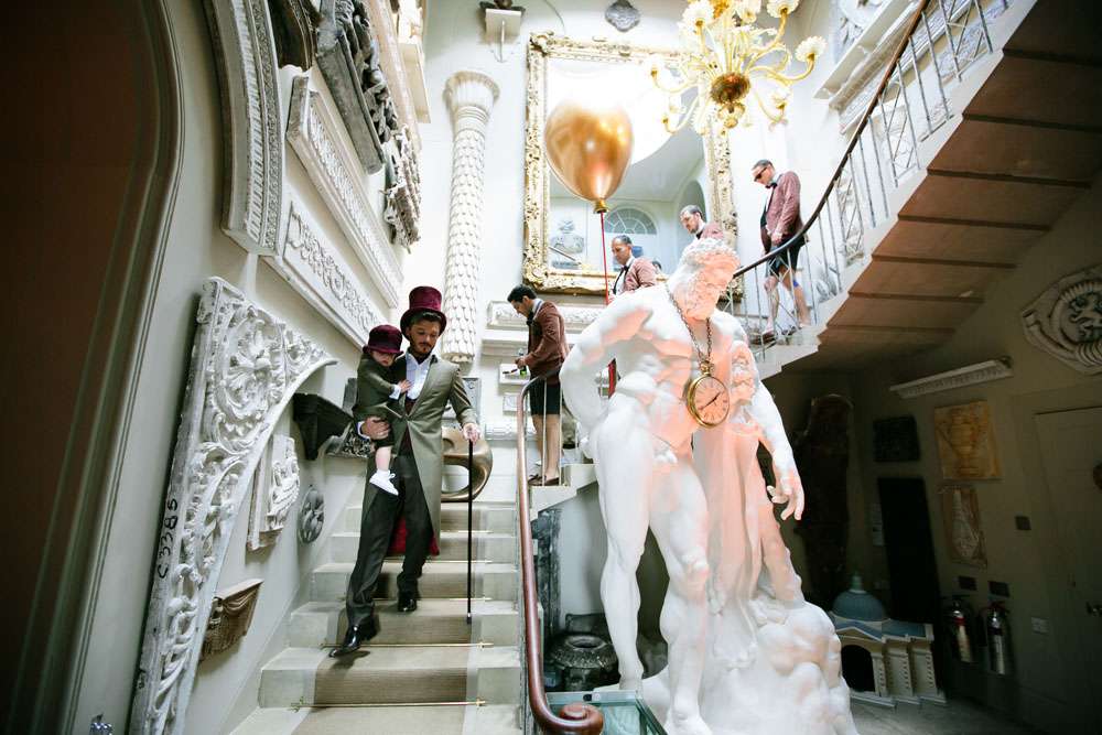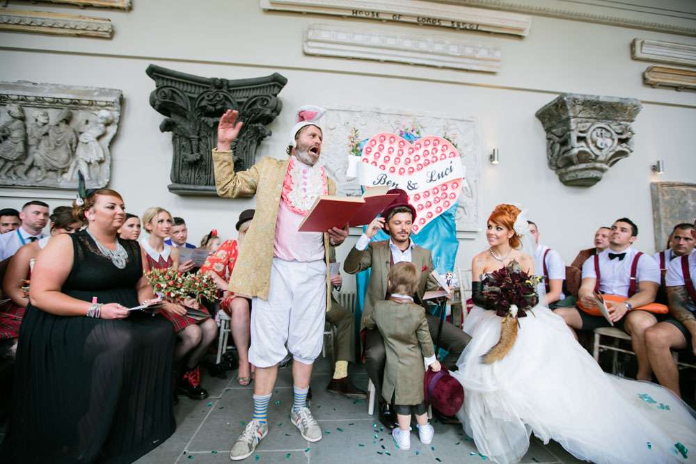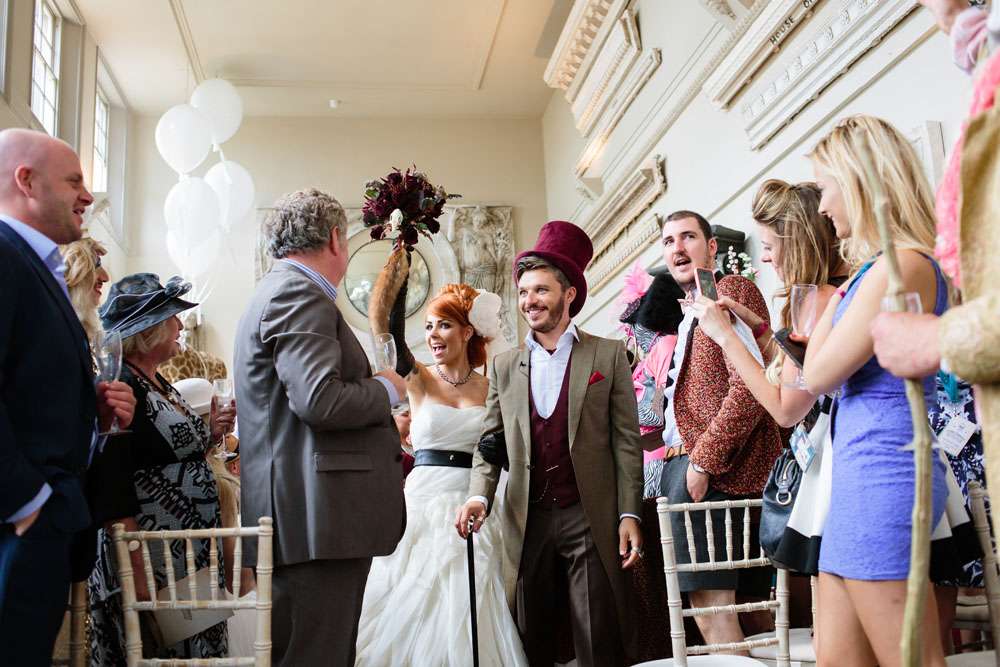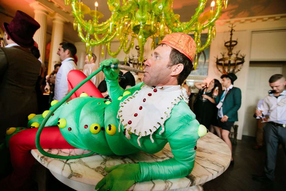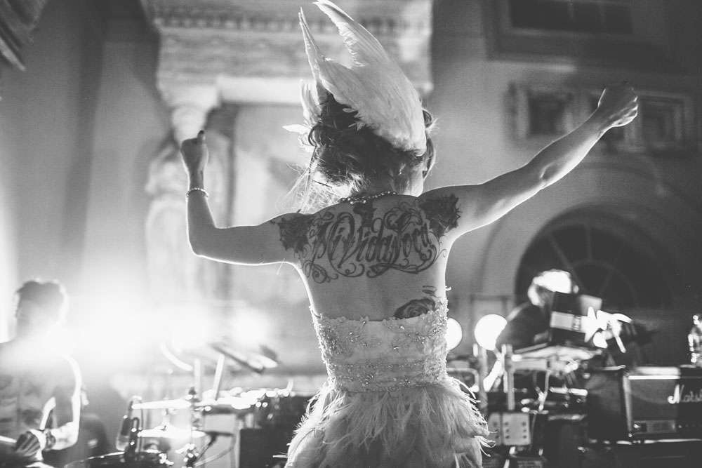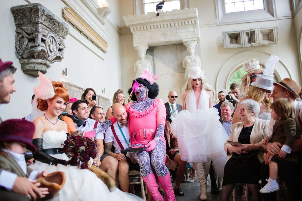 “After the ceremony there was finger food served by comedy waiters, sword swallowers, jugglers, and drag queens. We then had music and walking dinosaurs, and real tattoos being done in the “Tea-Quilla room”! The drag queens did a fashion show which ended in a bundle of drags and guests on the floor and we then lead everyone back inside the house for CHRISTMAS!! We had dancing presents, Elfs, Santa, and a walking rude yeti! We had a snow machine and mulled wine and mince pies. To finish the night off we had our favourite tribute band, Jilted Generation playing, steampunk clowns on stilts, and human disco balls!”