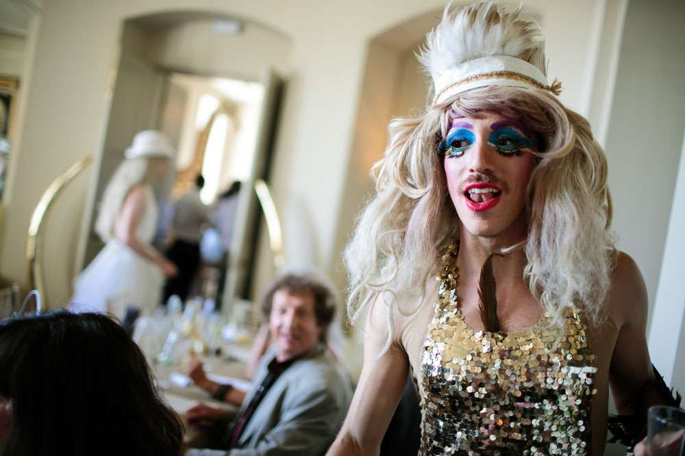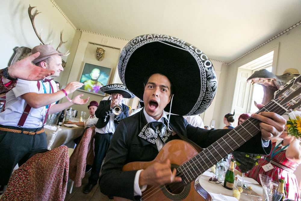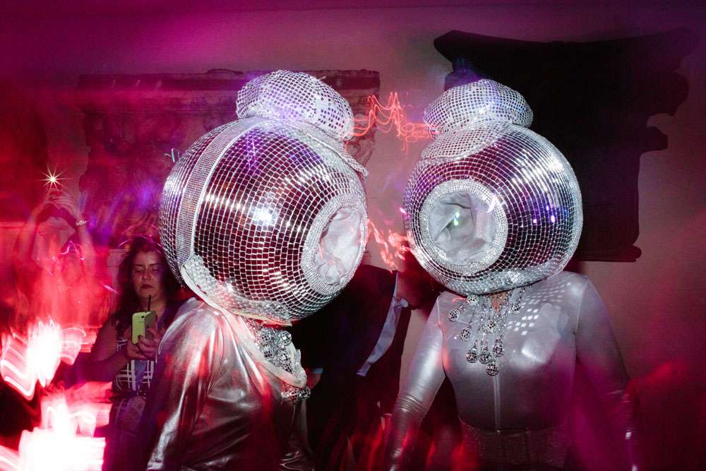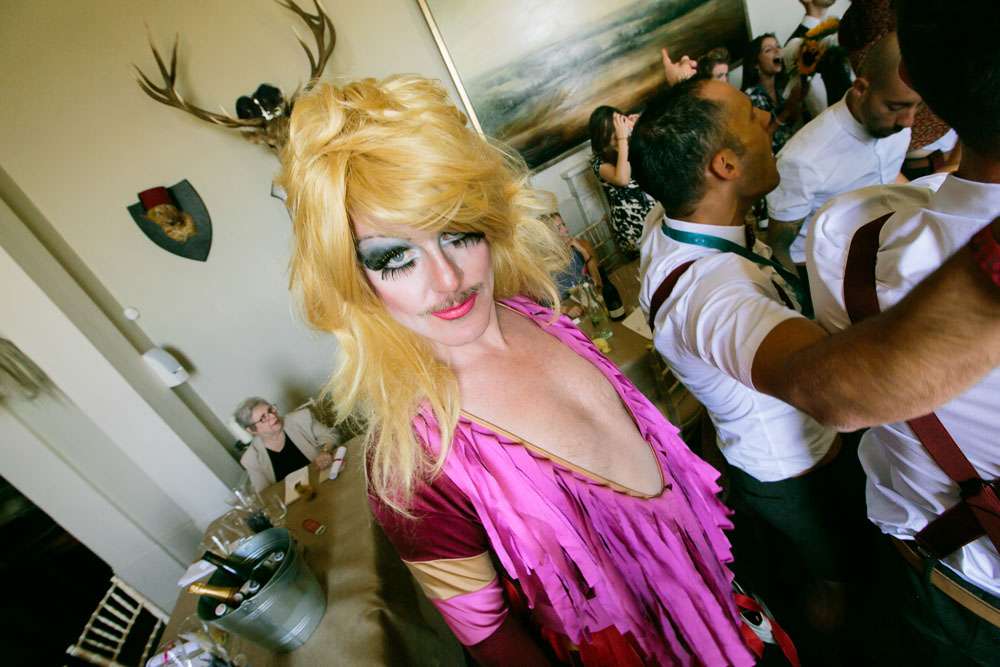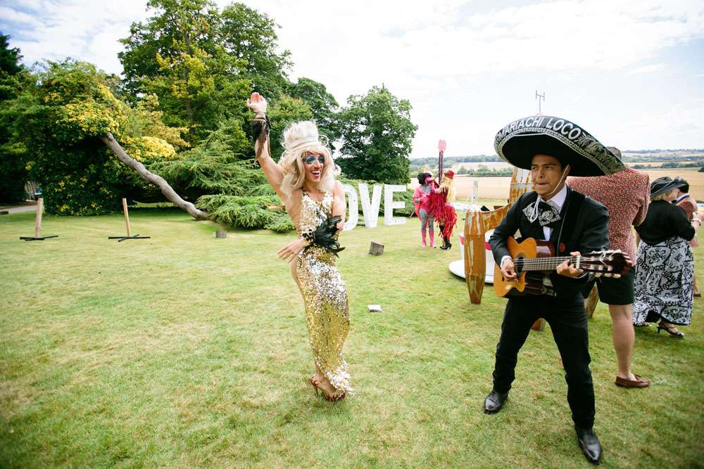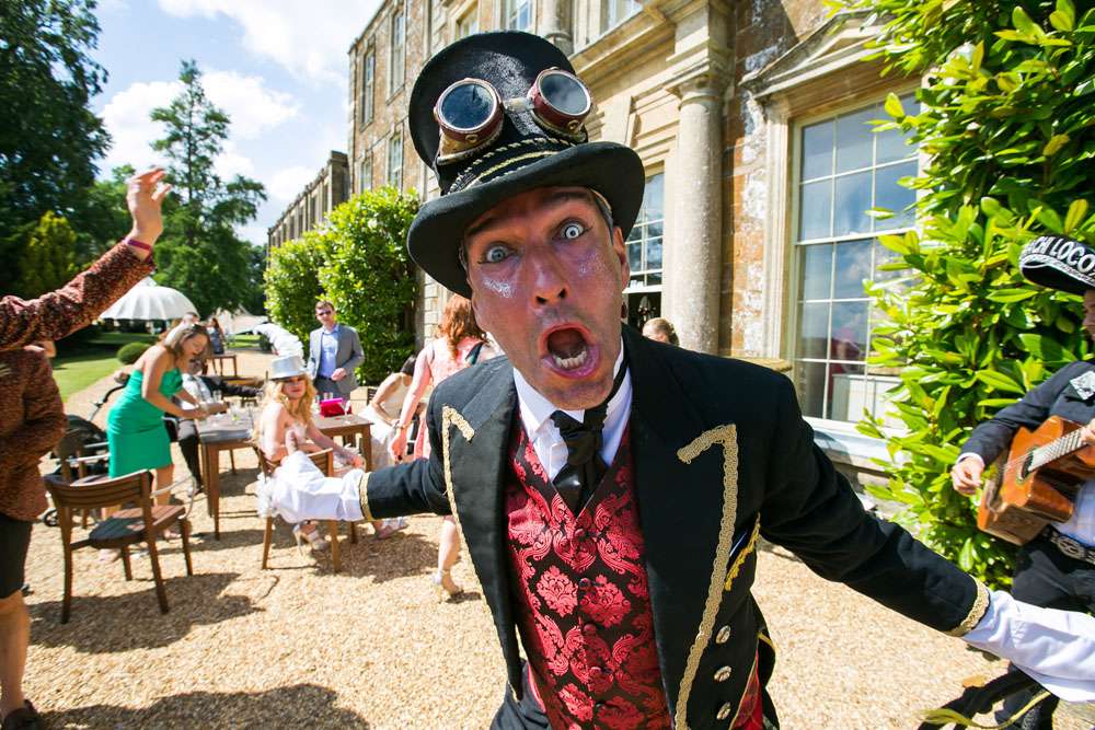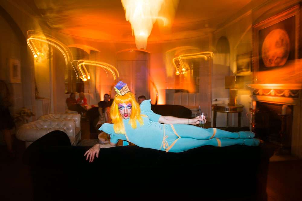 “After the ceremony there was finger food served by comedy waiters, sword swallowers, jugglers, and drag queens. We then had music and walking dinosaurs, and real tattoos being done in the “Tea-Quilla room”! The drag queens did a fashion show which ended in a bundle of drags and guests on the floor and we then lead everyone back inside the house for CHRISTMAS!! We had dancing presents, Elfs, Santa, and a walking rude yeti! We had a snow machine and mulled wine and mince pies. To finish the night off we had our favourite tribute band, Jilted Generation playing, steampunk clowns on stilts, and human disco balls!”