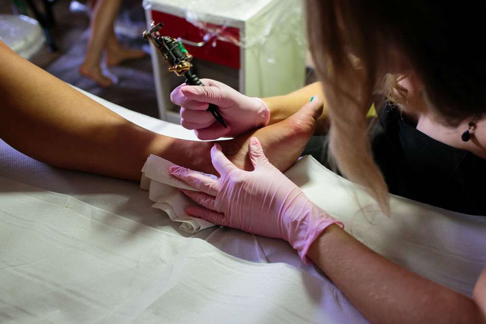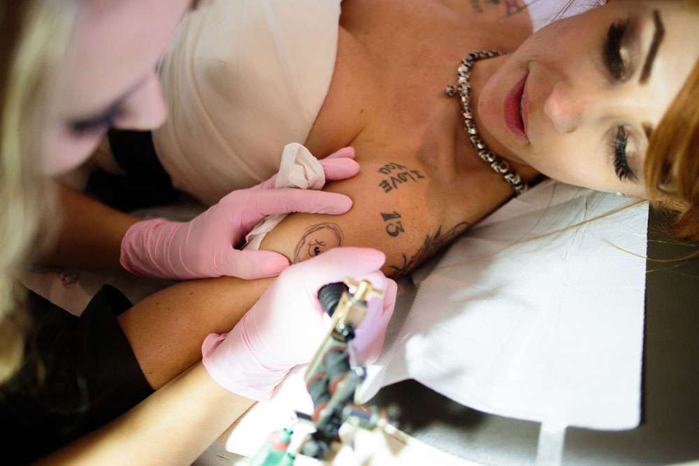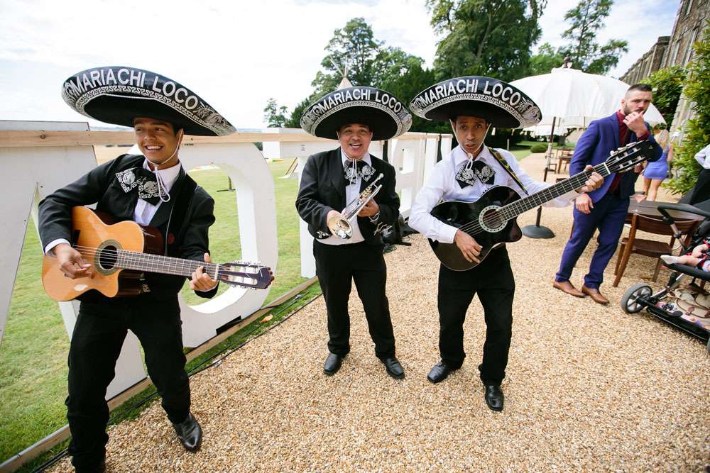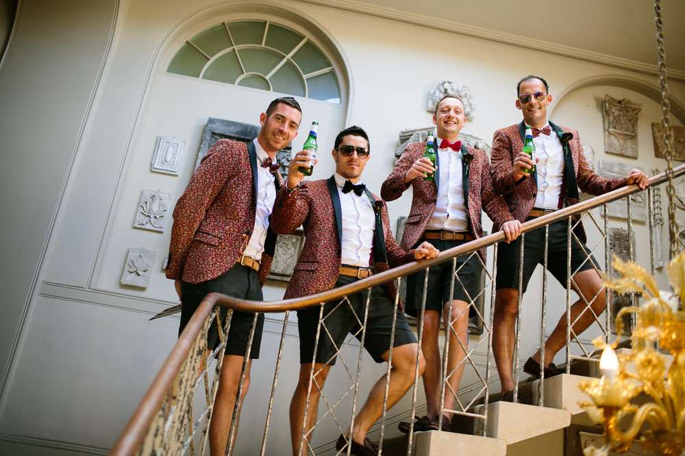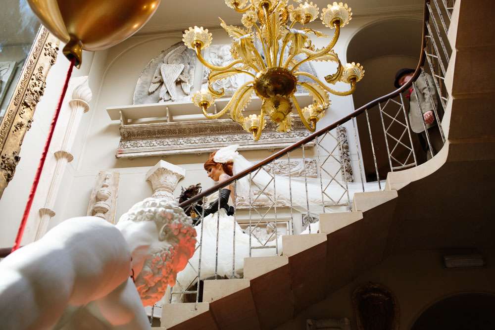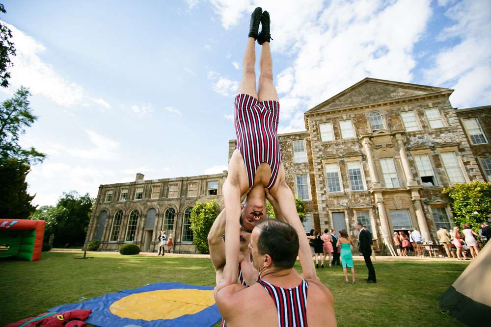 “After the ceremony there was finger food served by comedy waiters, sword swallowers, jugglers, and drag queens. We then had music and walking dinosaurs, and real tattoos being done in the “Tea-Quilla room”! The drag queens did a fashion show which ended in a bundle of drags and guests on the floor and we then lead everyone back inside the house for CHRISTMAS!! We had dancing presents, Elfs, Santa, and a walking rude yeti! We had a snow machine and mulled wine and mince pies. To finish the night off we had our favourite tribute band, Jilted Generation playing, steampunk clowns on stilts, and human disco balls!”