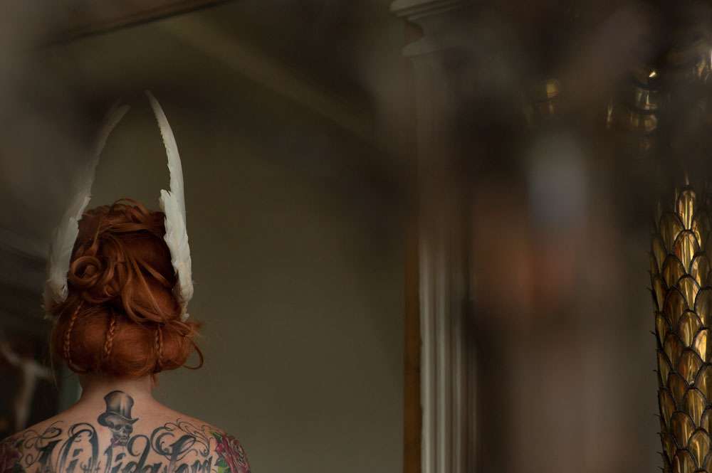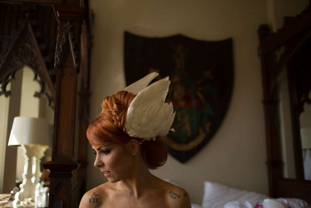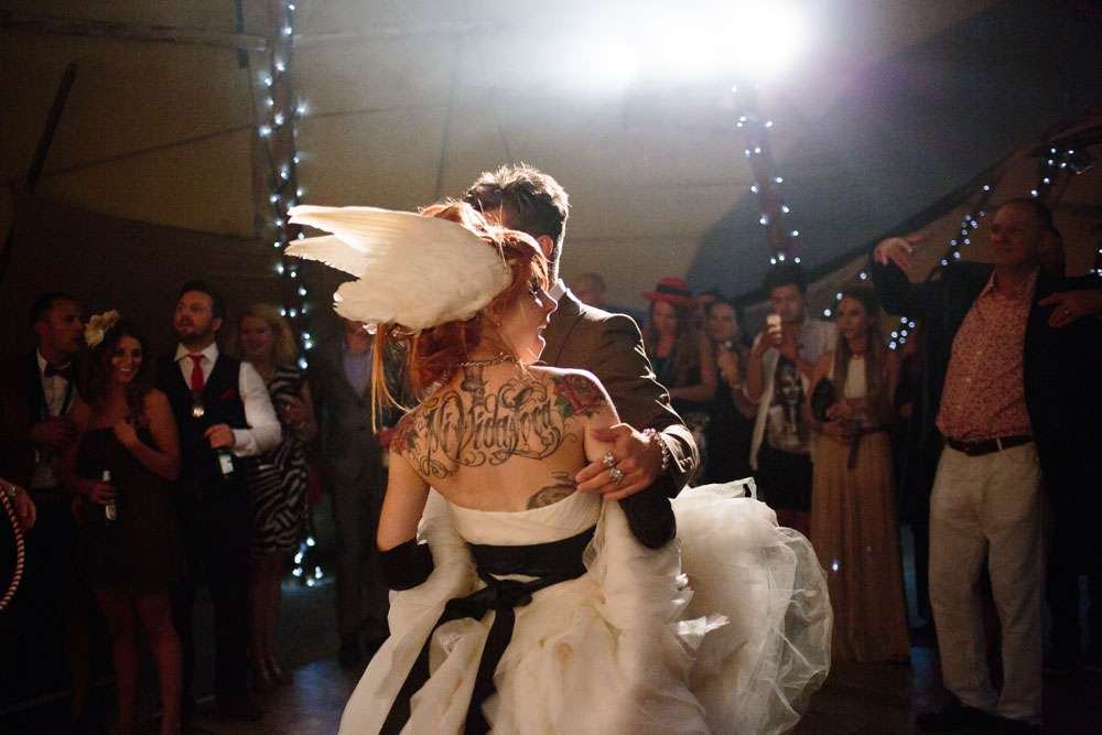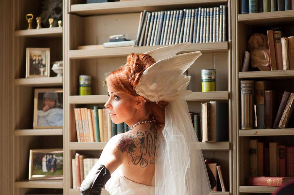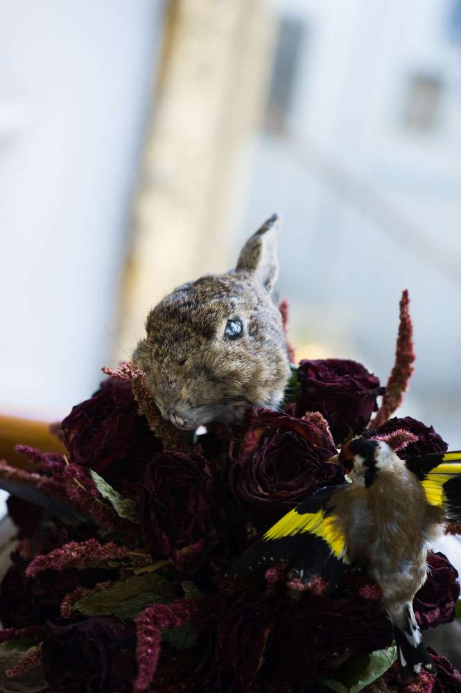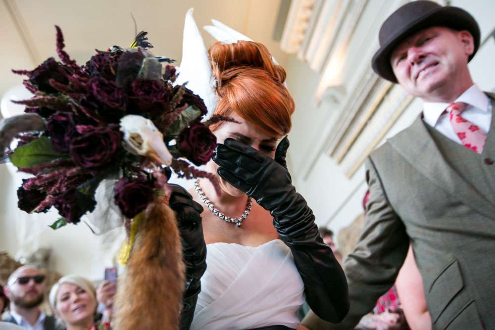 “The bridesmaids wore headbands adorned with magpie feathers and skulls, my bouquet had a rabbit skull, a rabbit head, a goldfinch, a mouse and a fox tale, I also wore a swan wing headdress that I picked up in Portobello Market, and the ‘box’ containing the rings was actually a badger skull laced with white rabbit fur. Ben also wore a matching goldfinch as his button hole garment rather than the usual flower!”