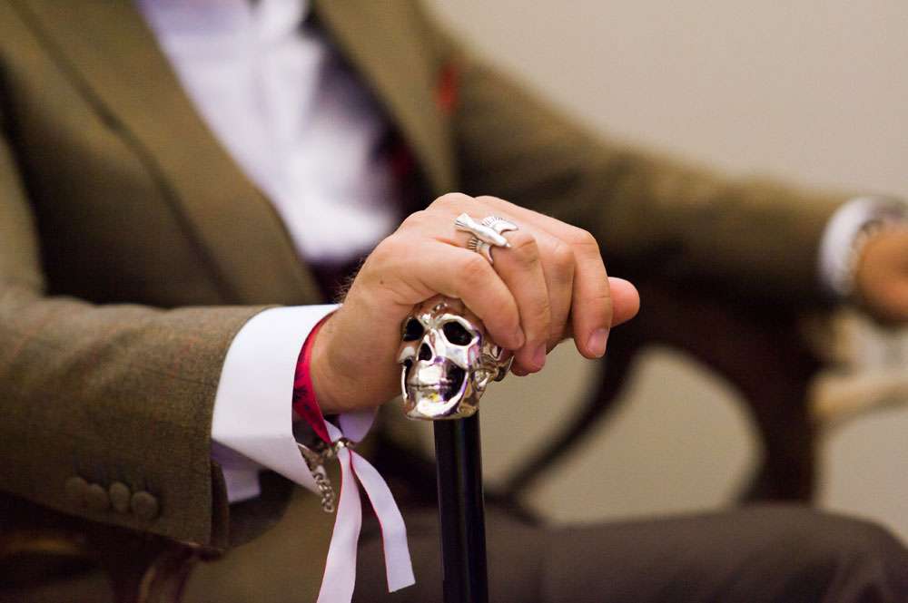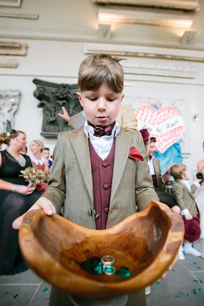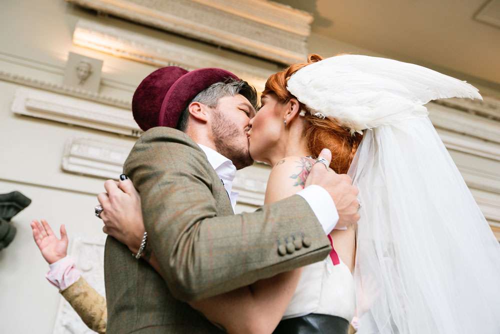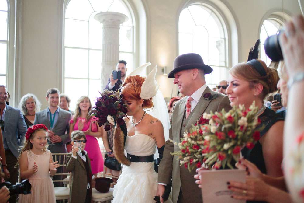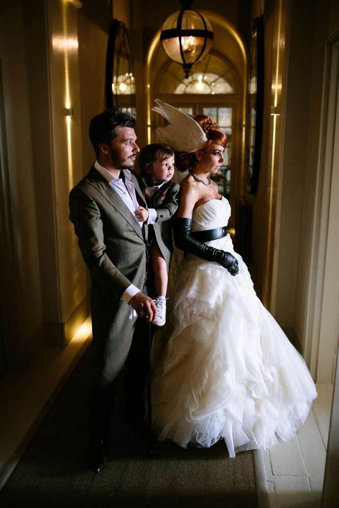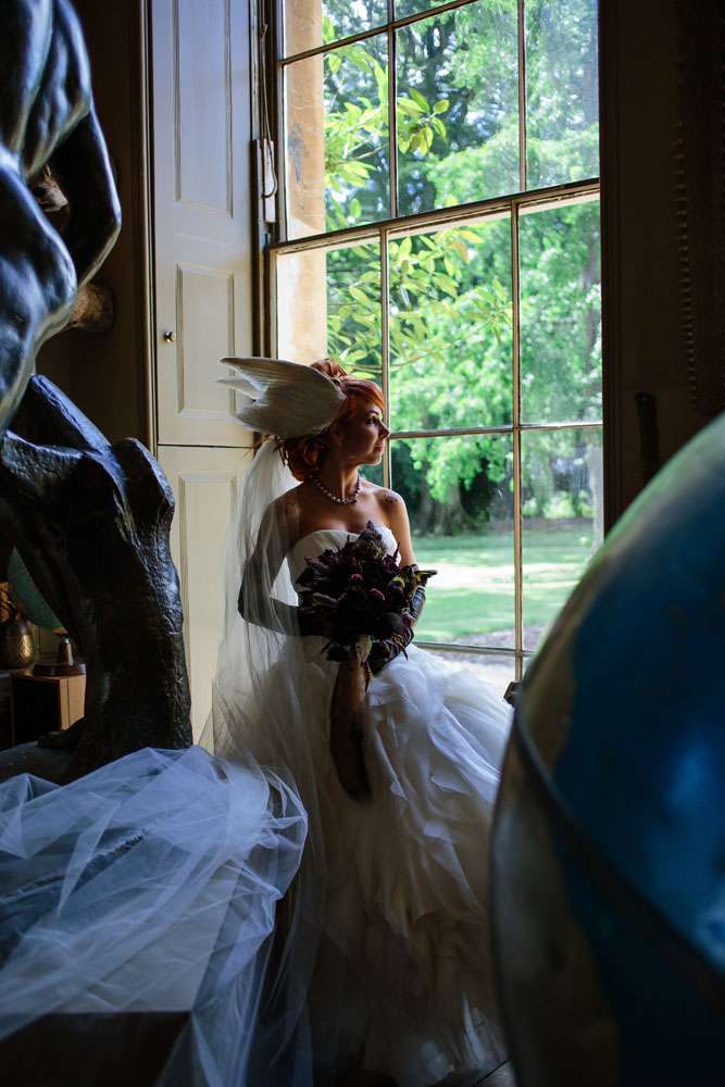 “The bridesmaids wore headbands adorned with magpie feathers and skulls, my bouquet had a rabbit skull, a rabbit head, a goldfinch, a mouse and a fox tale, I also wore a swan wing headdress that I picked up in Portobello Market, and the ‘box’ containing the rings was actually a badger skull laced with white rabbit fur. Ben also wore a matching goldfinch as his button hole garment rather than the usual flower!”