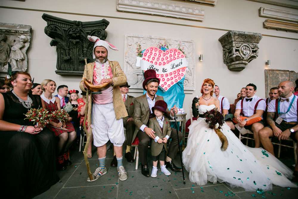 There really is no other way to explain Lucy and Benjamin’s wedding. There are Alice in Wonderland weddings… and there are festival weddings… but mash them both together and imagine everyone in attendance has dropped acid and you’re maybe halfway there to how bonkers this wedding was! Their wedding photographer Lee Allen described it as the maddest wedding he’s ever been involved with… and you know what, I can totally see why!