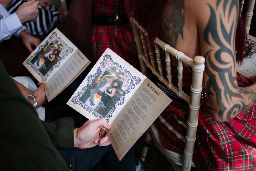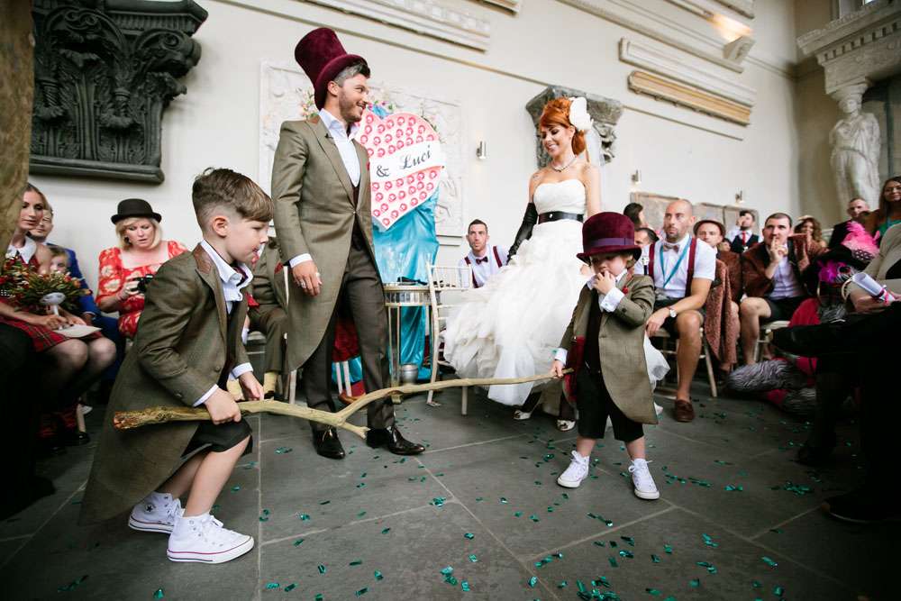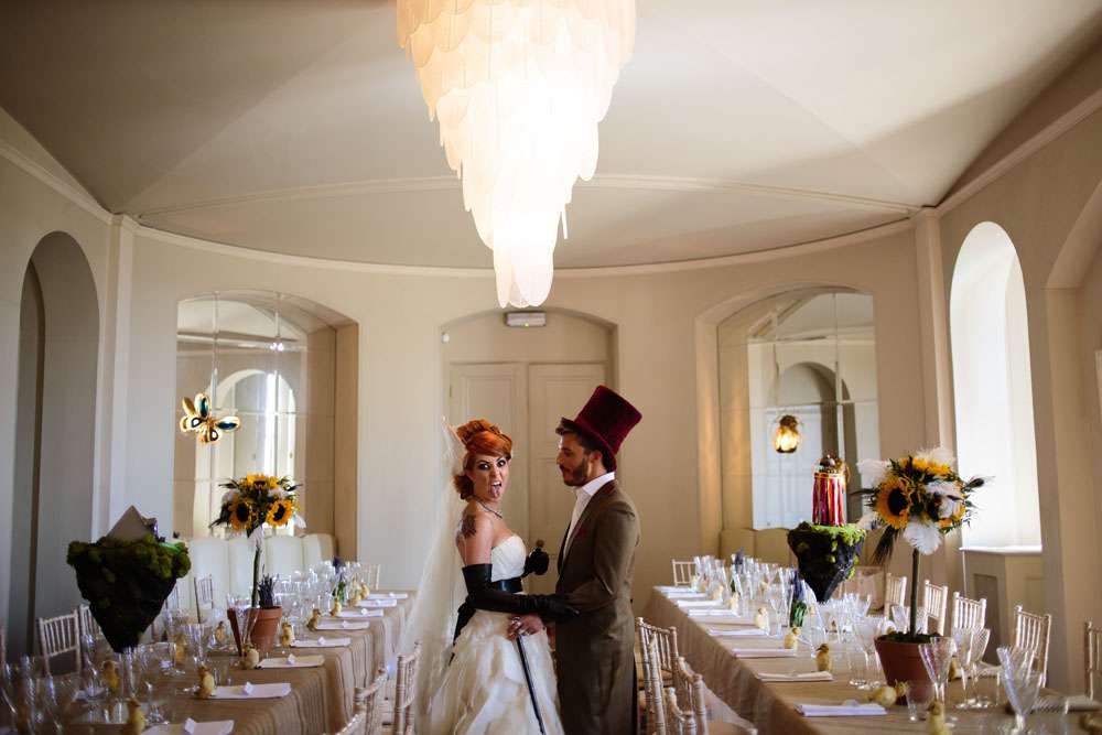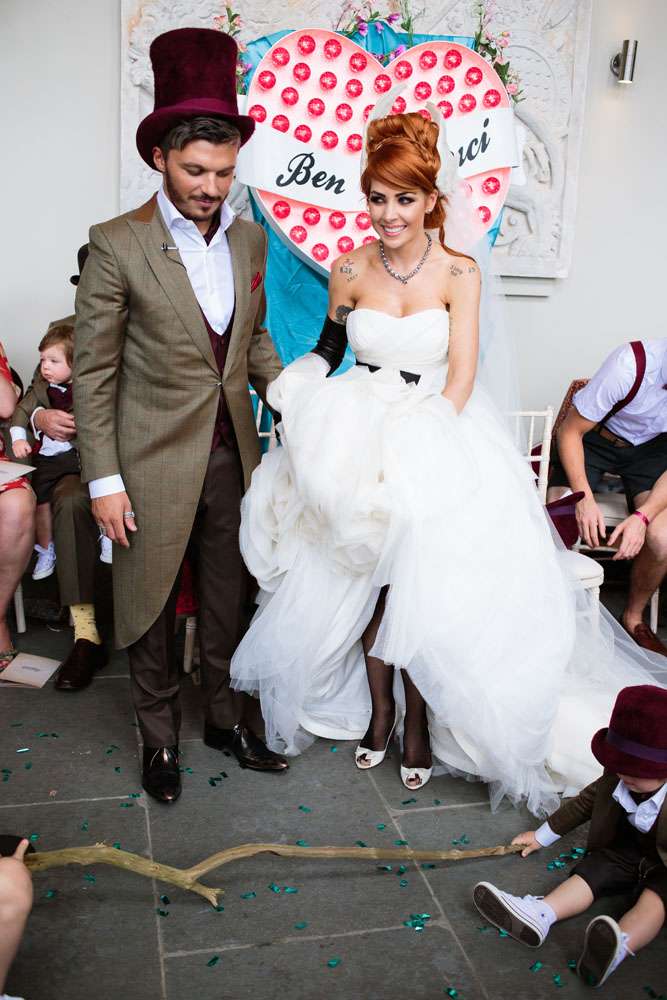 “I think we can safely say that our wedding was definitely a one off”, she continued. “Our guests arrived on double decker buses and we then lead them through tunnels into the venue. They got given a Tweedle Dum or Tweedle Dee card which told them which was the next tunnel they had to go down to get into the ceremony!”