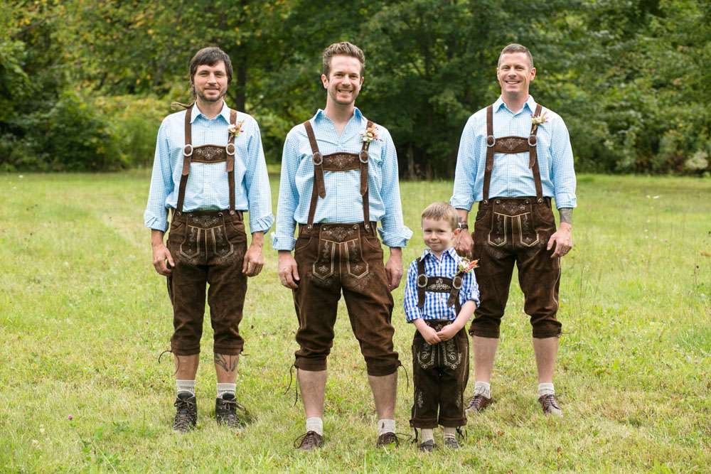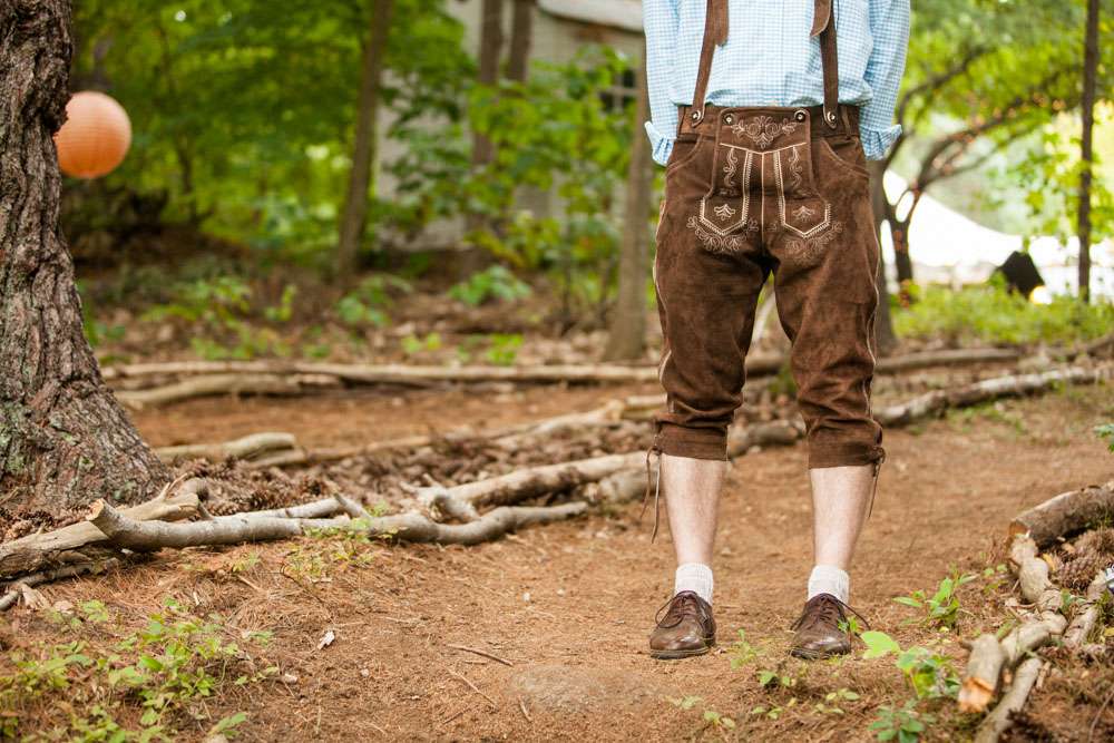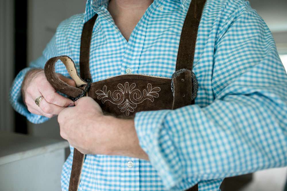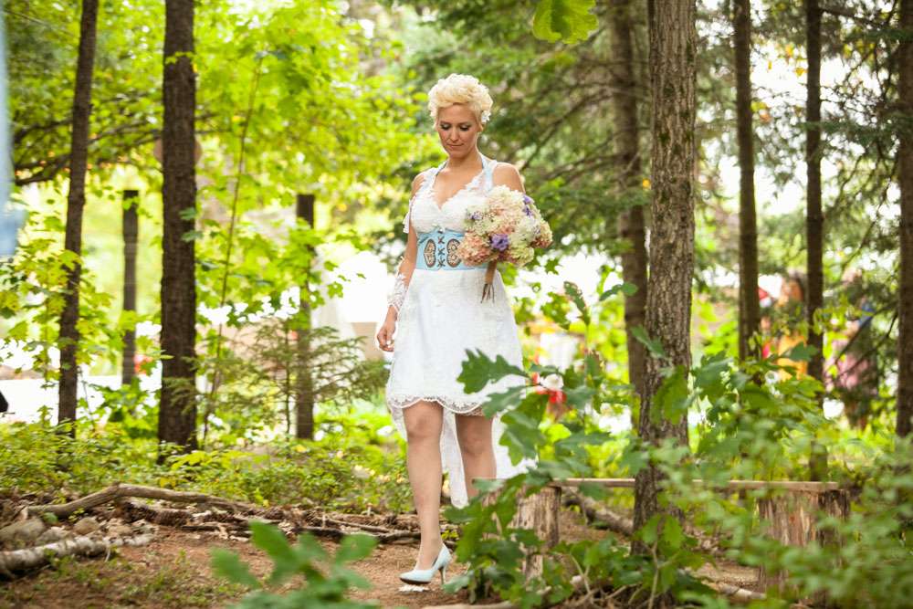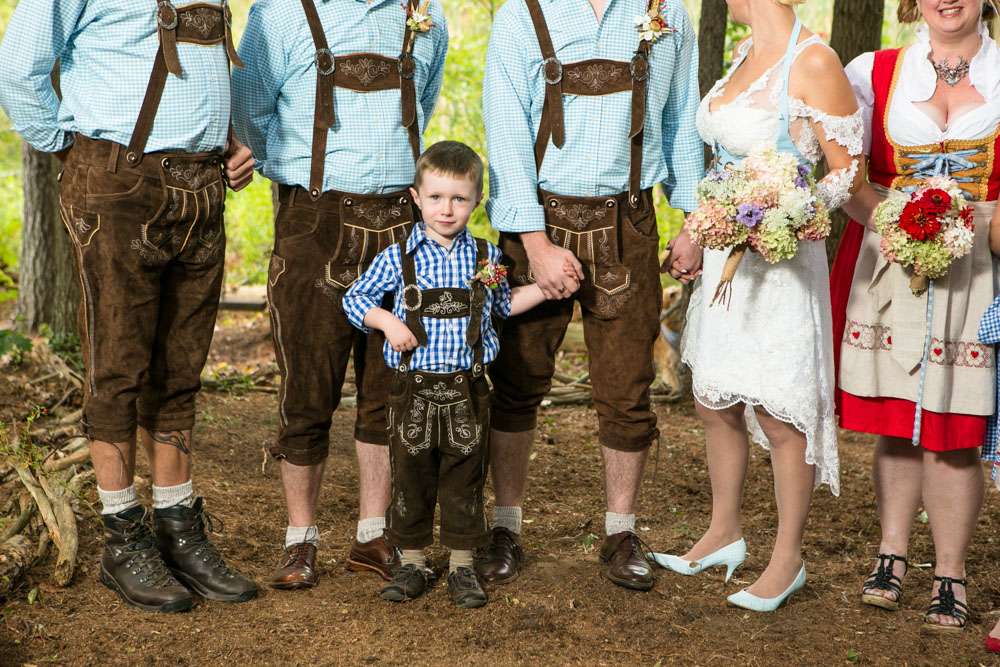 The bride designed her own wedding dress which was then custom made at Prime Thread Alterations. She also hand-painted her shoes with a blue and white gingham pattern. Her jewellery featured pretzels, deer and hearts to fit the theme and was made by her father. The groom and his groomsmen wore authentic lederhosen from Germany and the bridesmaids were in dirndls, also ordered from Germany.