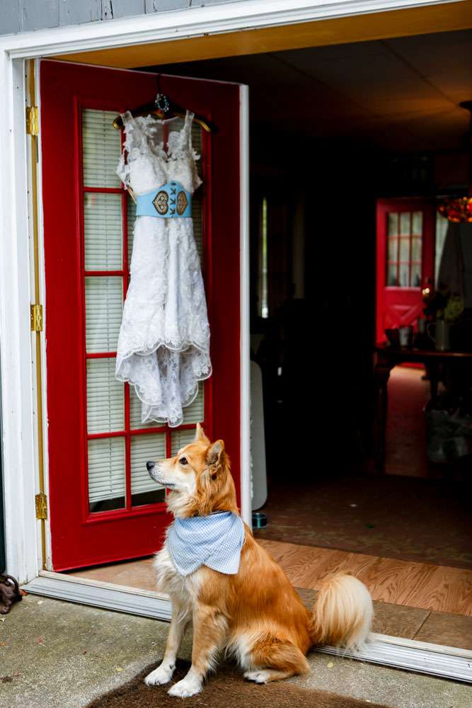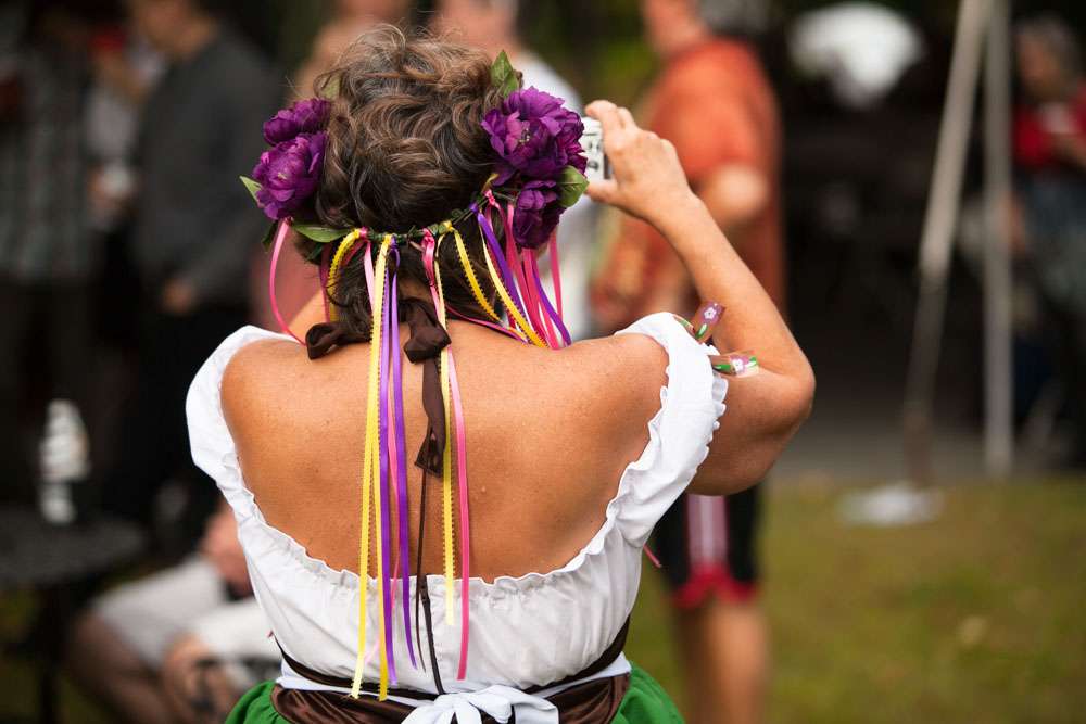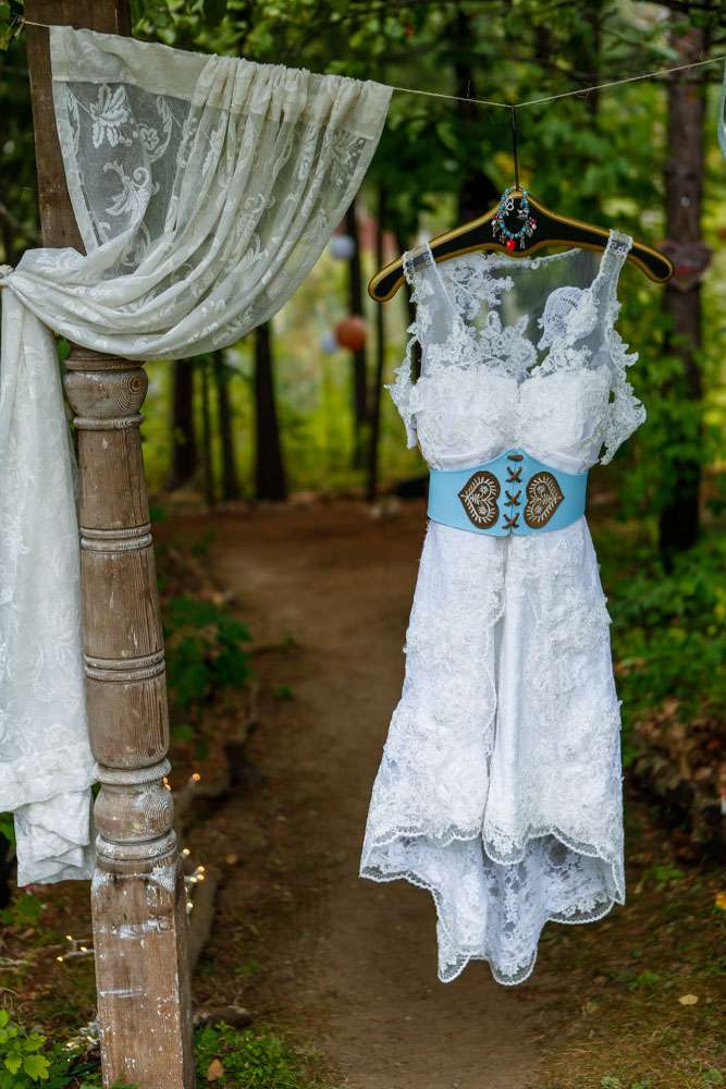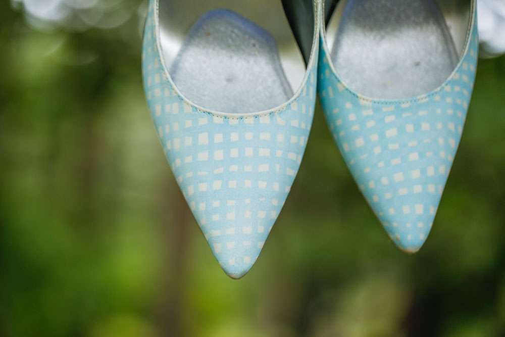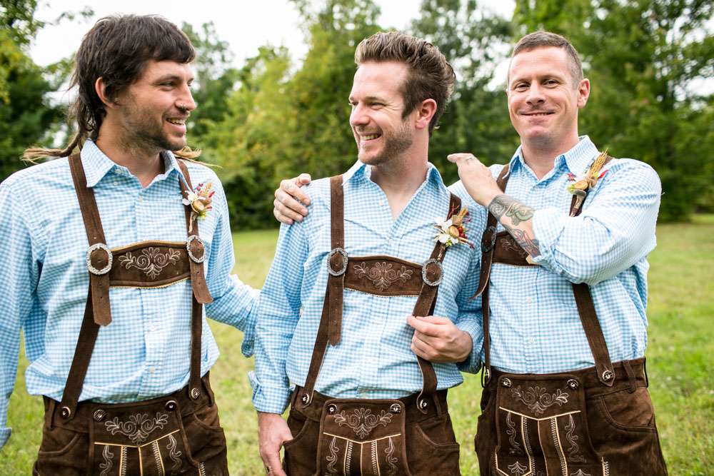 The bride designed her own wedding dress which was then custom made at Prime Thread Alterations. She also hand-painted her shoes with a blue and white gingham pattern. Her jewellery featured pretzels, deer and hearts to fit the theme and was made by her father. The groom and his groomsmen wore authentic lederhosen from Germany and the bridesmaids were in dirndls, also ordered from Germany.