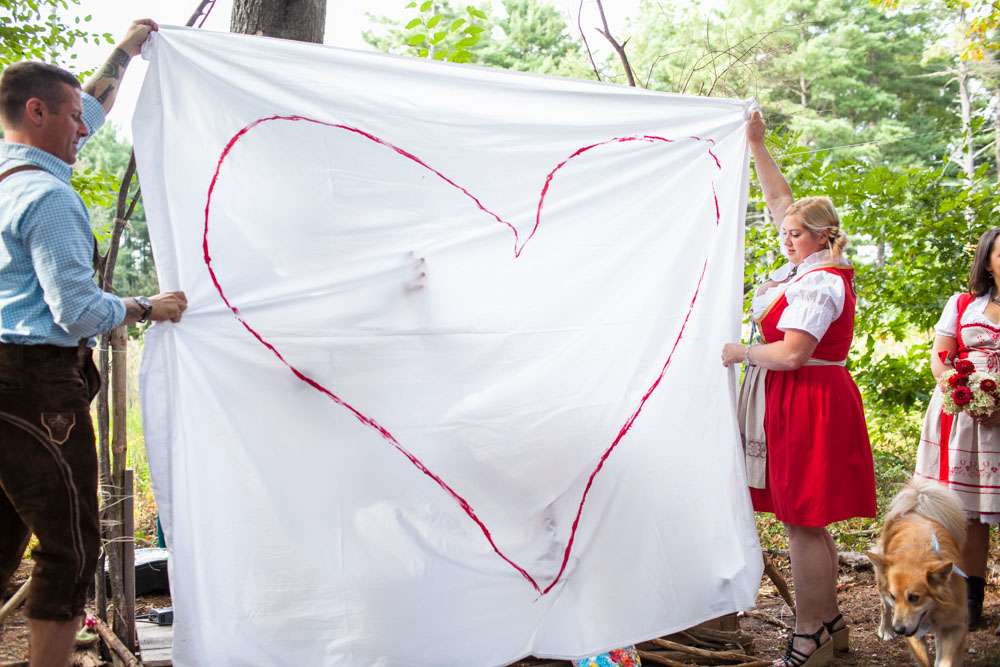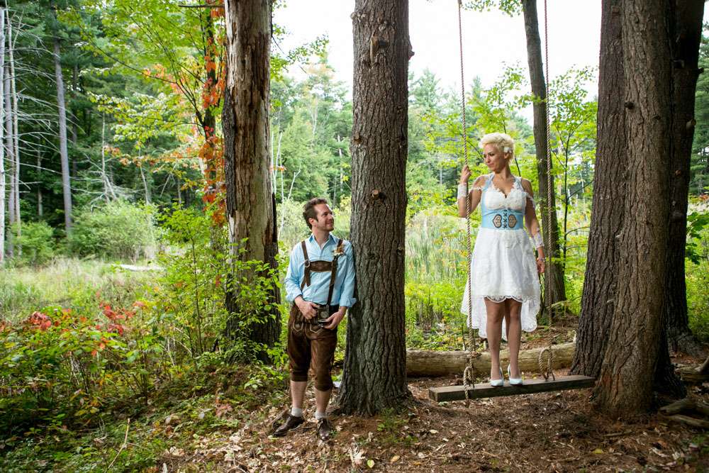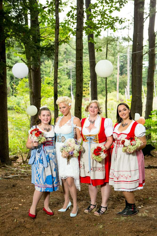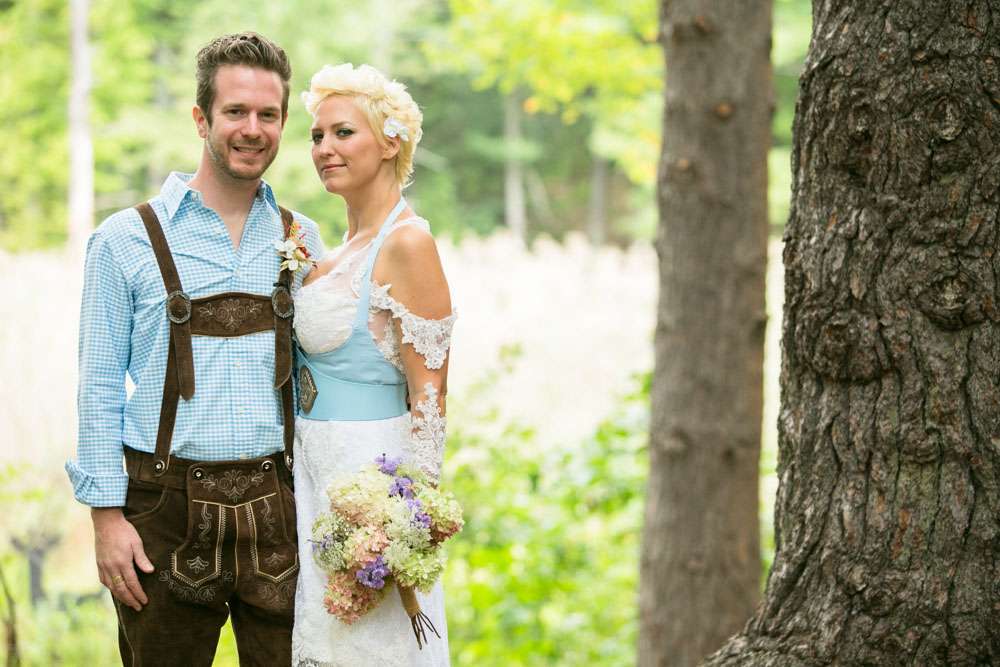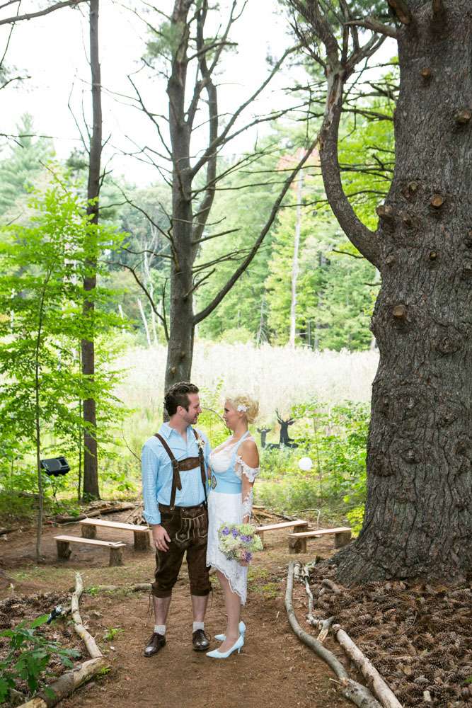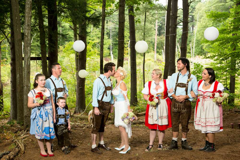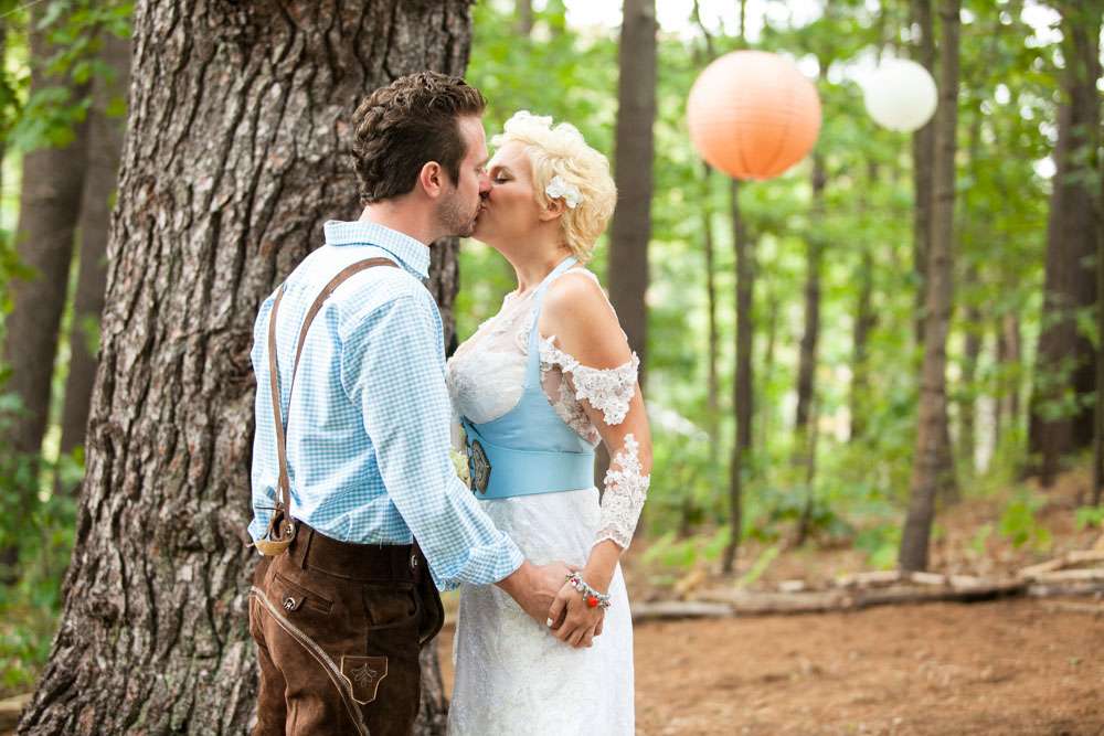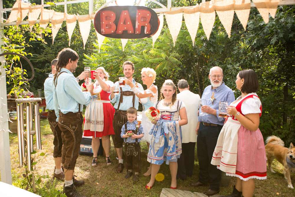 Mike and Emily were married at home. Their September wedding was Bavarian themed, inspired by their many trips to Germany! “We feel our wedding was pretty unique”, began the bride. “It was hard to find resources for a Bavarian wedding in America so we did so much ourselves and really enjoyed every minute of it. We had a biergarten, circus tents and live music from a variety of our talented friends all day and night. We called our theme a Bavarian street fair, and a fairytale meets Oktoberfest!”