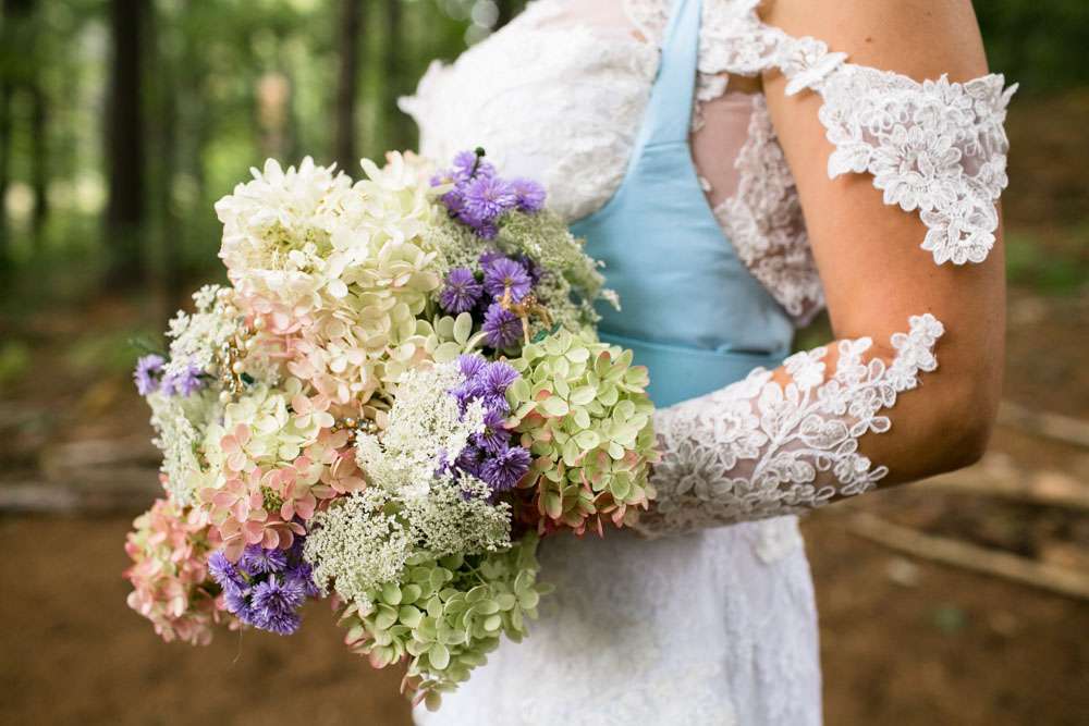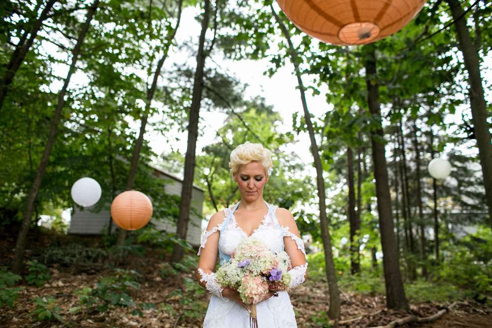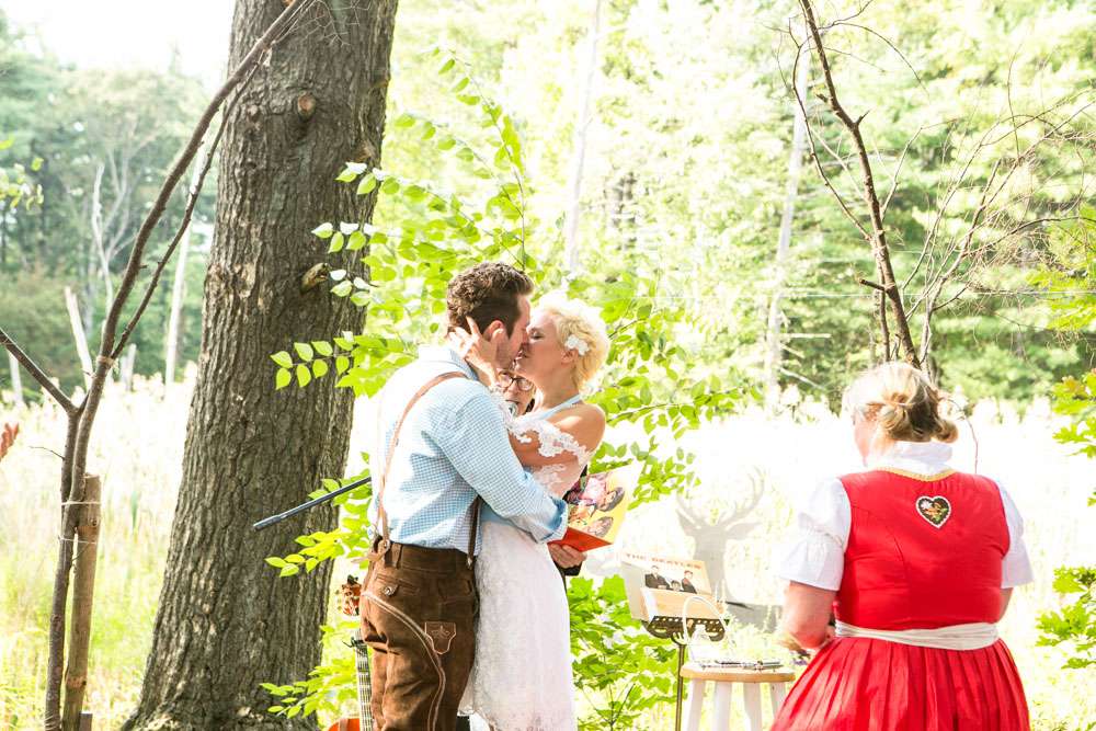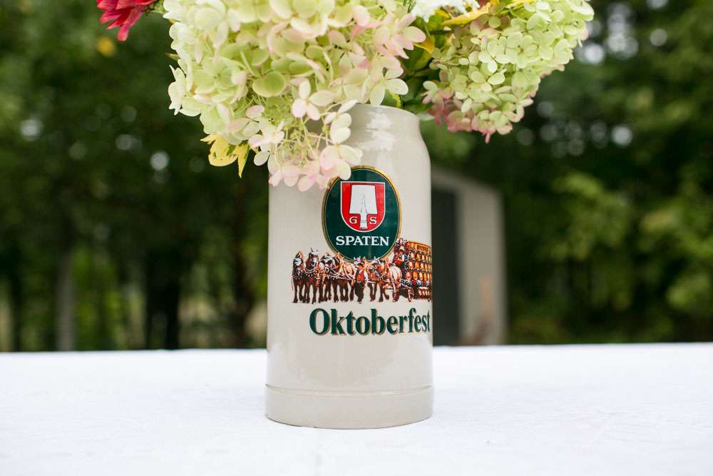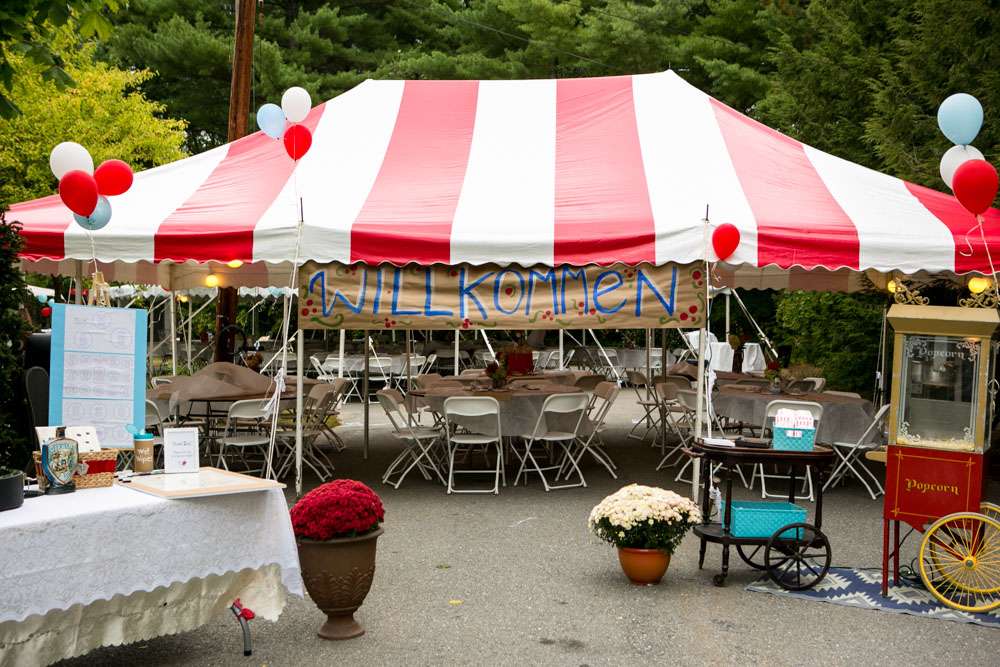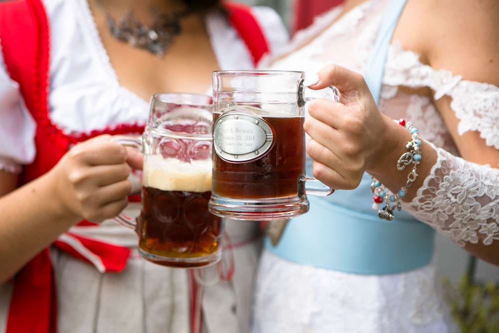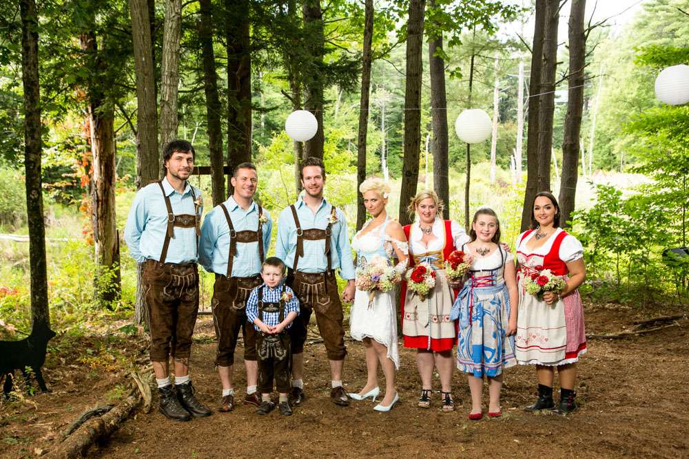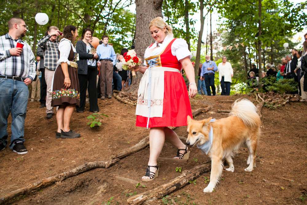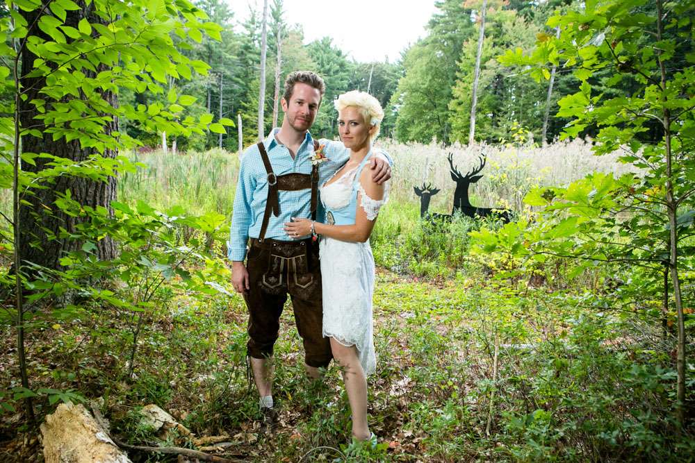 Mike and Emily were married at home. Their September wedding was Bavarian themed, inspired by their many trips to Germany! “We feel our wedding was pretty unique”, began the bride. “It was hard to find resources for a Bavarian wedding in America so we did so much ourselves and really enjoyed every minute of it. We had a biergarten, circus tents and live music from a variety of our talented friends all day and night. We called our theme a Bavarian street fair, and a fairytale meets Oktoberfest!”