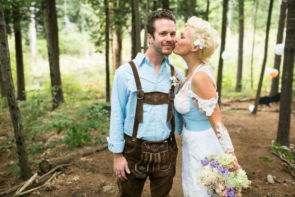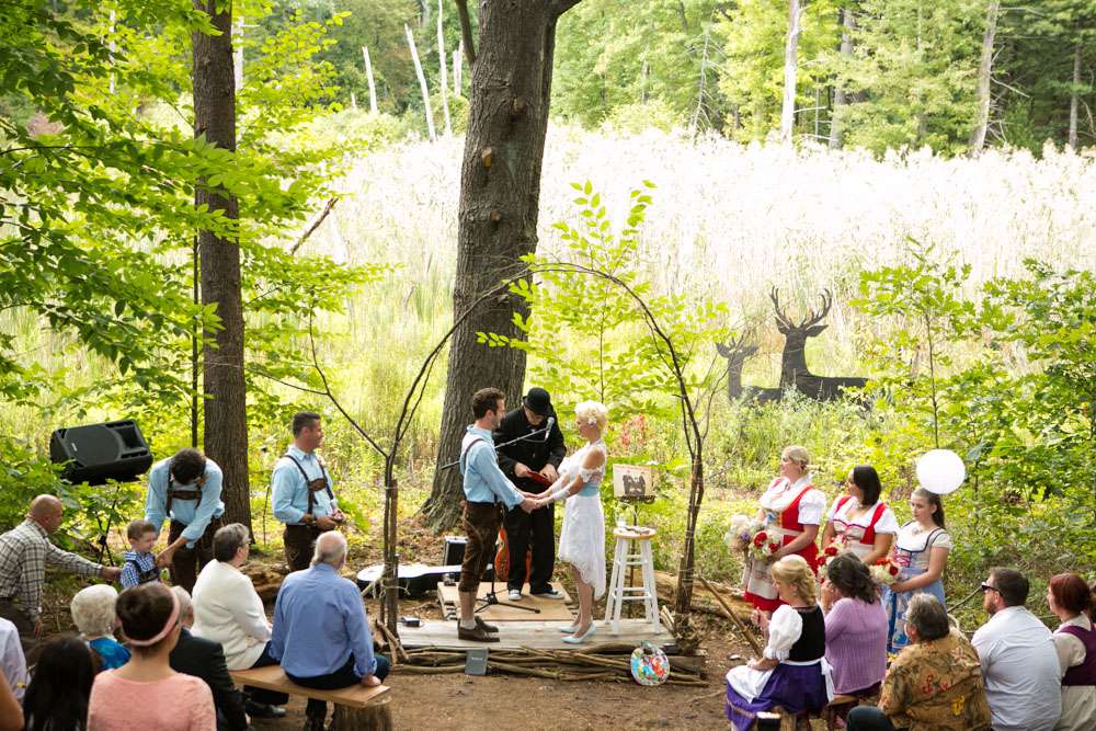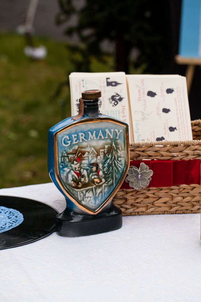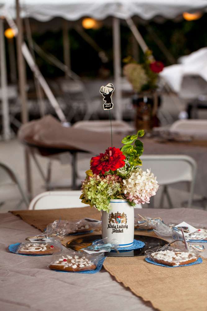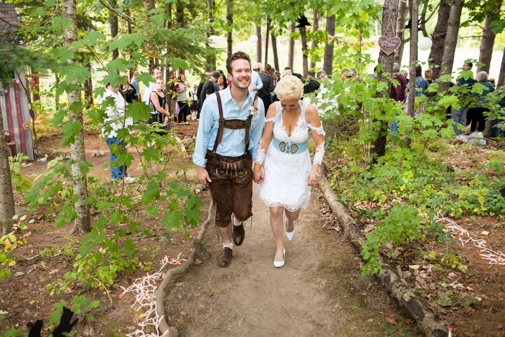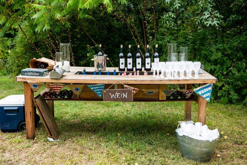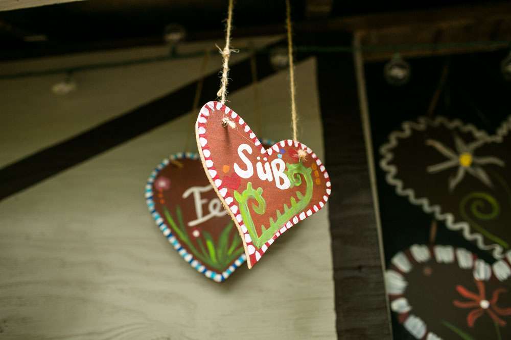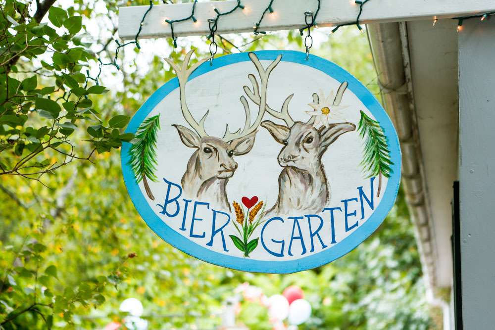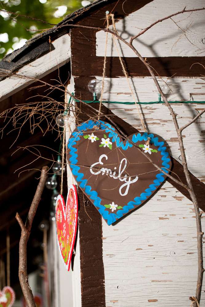 “Pretty much everything was DIY!” Emily said. “We had so much help from my mom and other close family and friends. For decorations we had handmade forest animal silhouettes, painted wooden lebkuchen hearts, tiny painted toadstools, biergarten sign, two bars, and our shed transformed into German candy haus!”