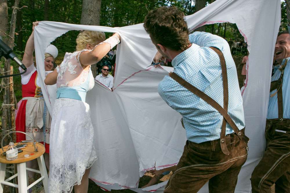 “One of the best moments was the ceremony”, she explained. “As soon as we were pronounced husband and wife we partook in a German tradition of jointly cutting out the shape of a heart from a bed sheet, then jumping through it! Two of our friends played beautiful originals songs and the groom, who is a professional musician, also sang.”