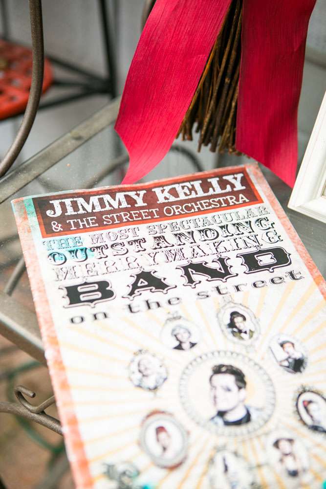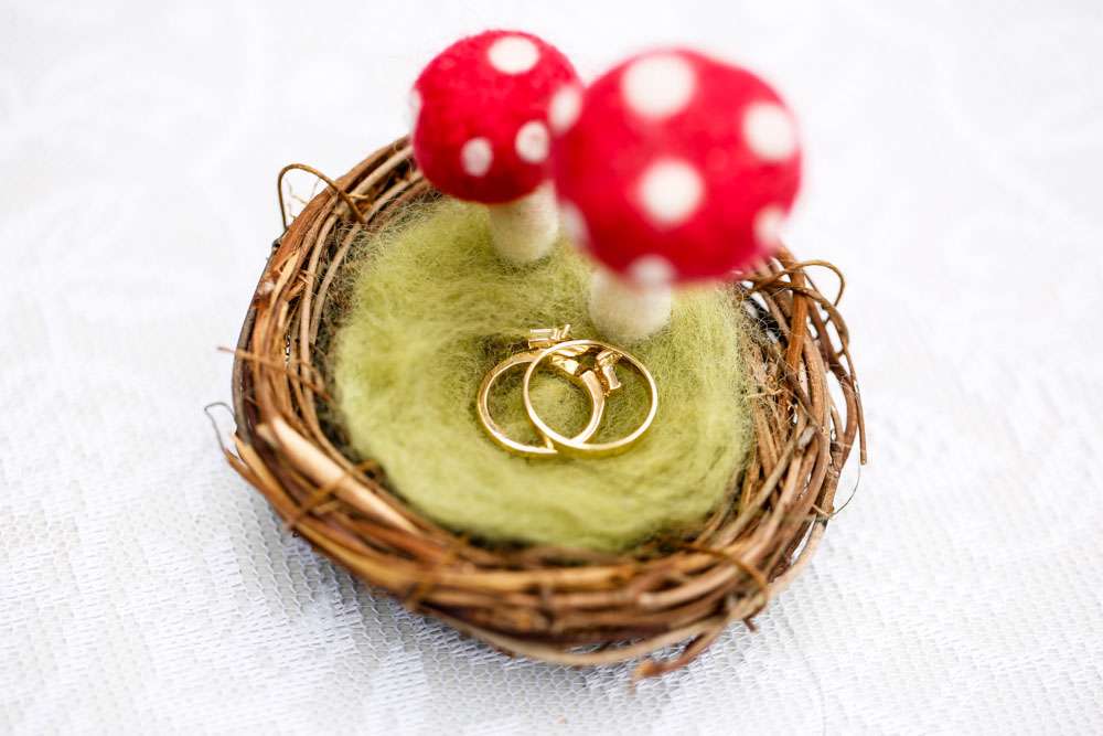 “Our centrepieces were floral arrangements in beer stiens on top of records. The ring bearer, our nephew Cormac, carried the rings in a felt nest with toadstools made by me and my best friend. For dessert, and instead of wedding cake, we served each of our 200 guests a traditional gingerbread lebkuchen heart made by the groom’s mother and cupcakes made by an aunt.”