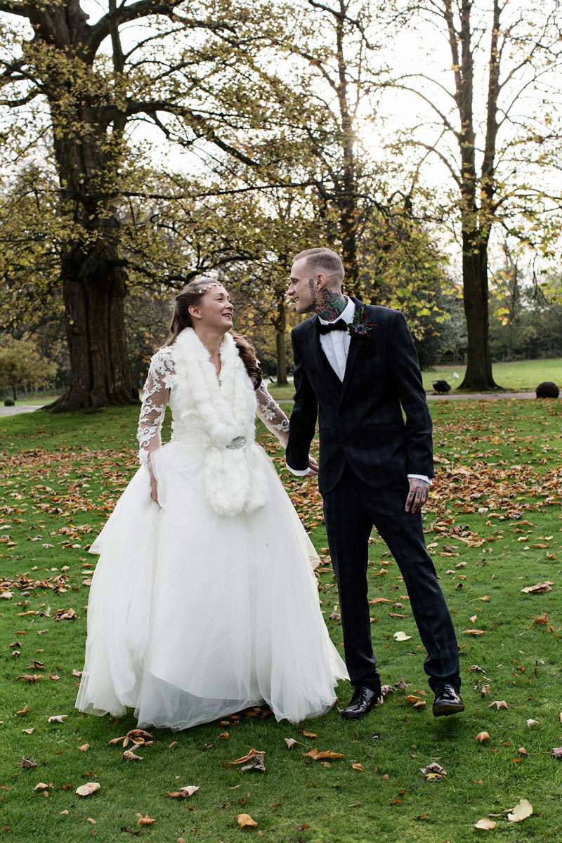 “After a champagne reception we had a dinner party with a woodland, harvest theme. Jim and I love Halloween, but for different reasons – Jim loves horror movies especially ‘Halloween’ and has three different Michael Myers’ tattooed on him. We had Michael Myers mentioned in our ceremony by the officiant as a joke. I love Halloween as this is when it is the Celtic New Year, Samhain, celebrated at sunset on 31st October. This is why I wanted an evening wedding. Samhain marks the end of the harvest and the start of a chapter, new beginnings. Jim and I do not celebrate the traditional New Year of 1st January. Jim also lost his mum recently and so we felt that Halloween being traditional for the dead to be closer to the living to be a touching time to think of his mum being there with us when exchanging our vows.”