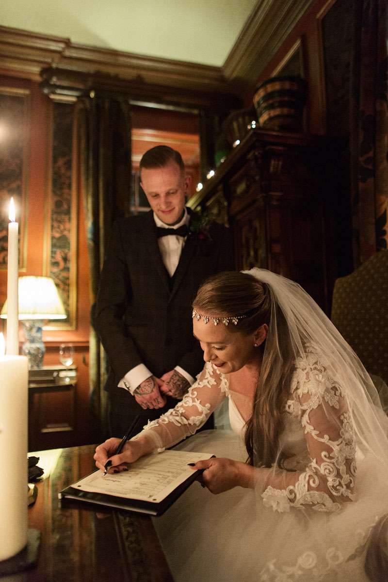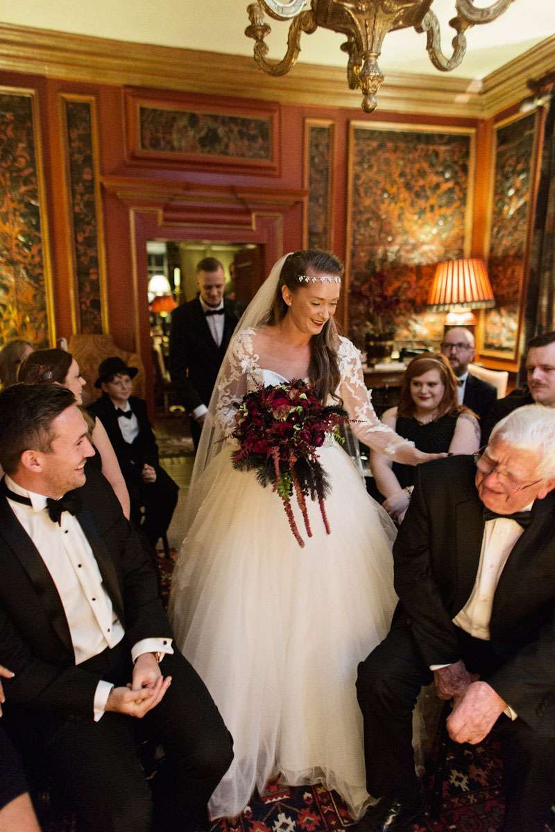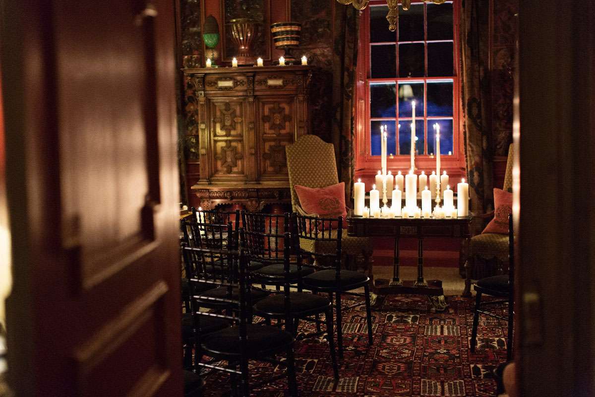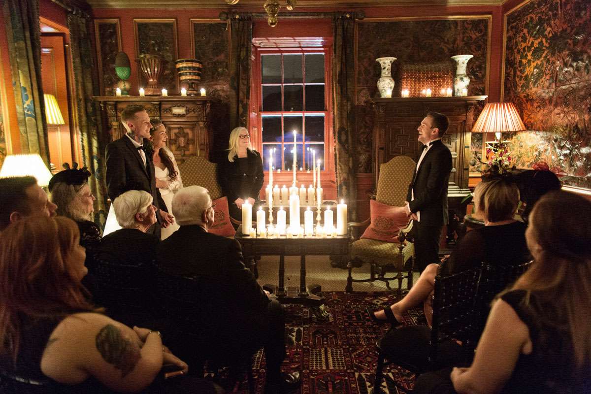 “The idea behind our wedding was to have a small intimate candle lit ceremony at night with an open fire”, began the bride. “We wanted all our guests and officiant to be dressed in black – black evening dresses and black evening suits with bow ties. There was a gothic touch and a spiritual element which all tied in with Halloween.”