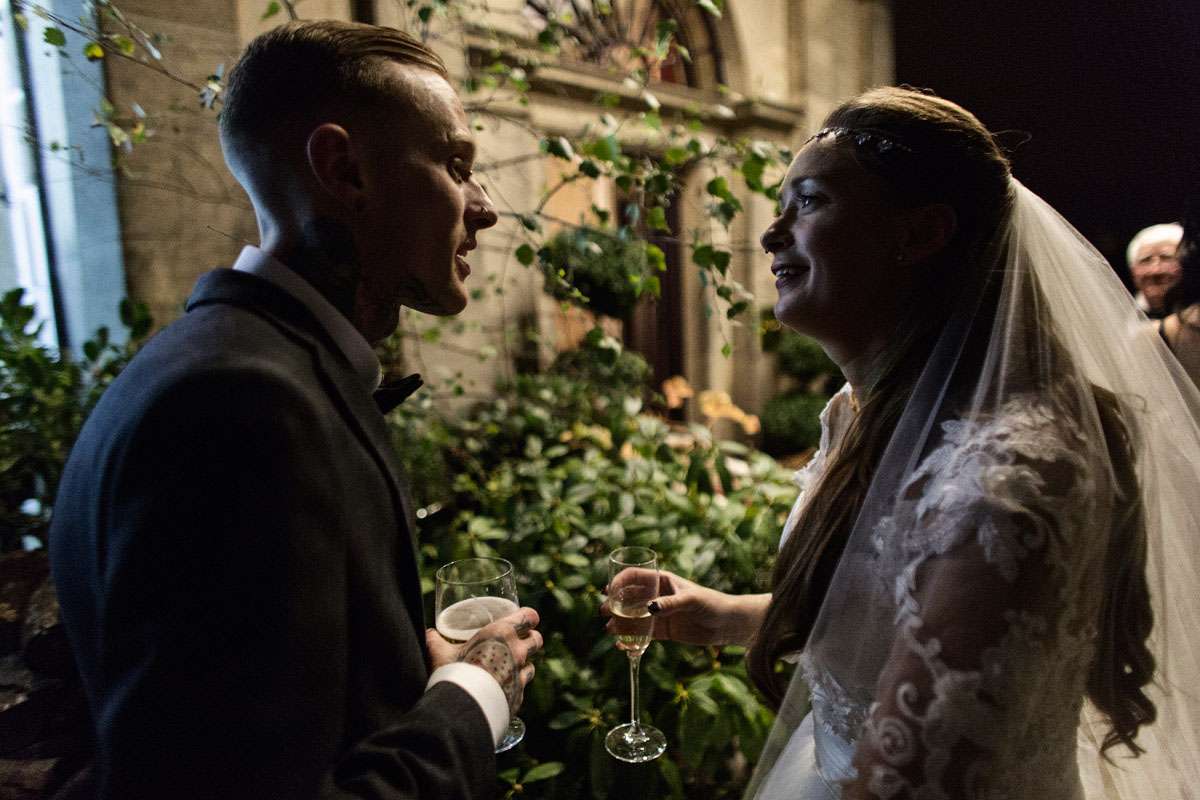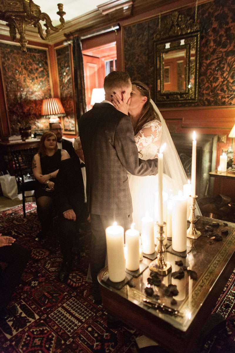 In terms of décor, the couple bought 80 candles of various sizes for their ceremony from places like eBay and TK Maxx. “A friend brought along black rose petals to scatter on the ceremony table too. Several incense sticks were also lit to add to the atmosphere along with open fires burning in the ceremony and wedding breakfast rooms.”