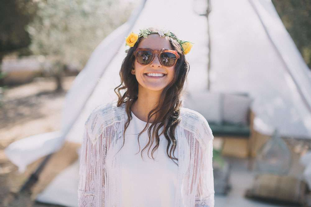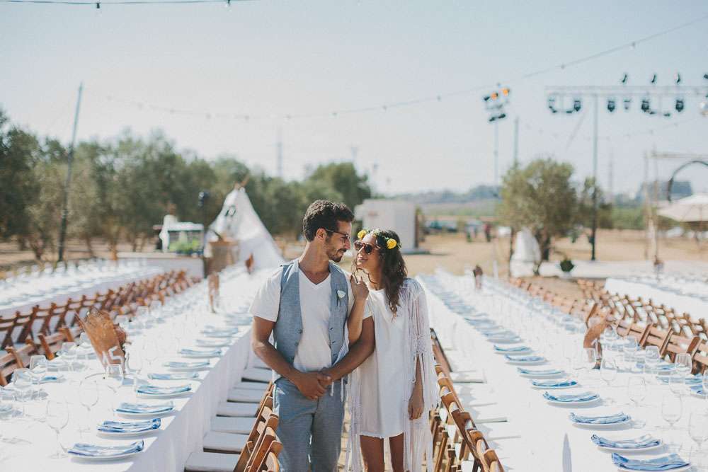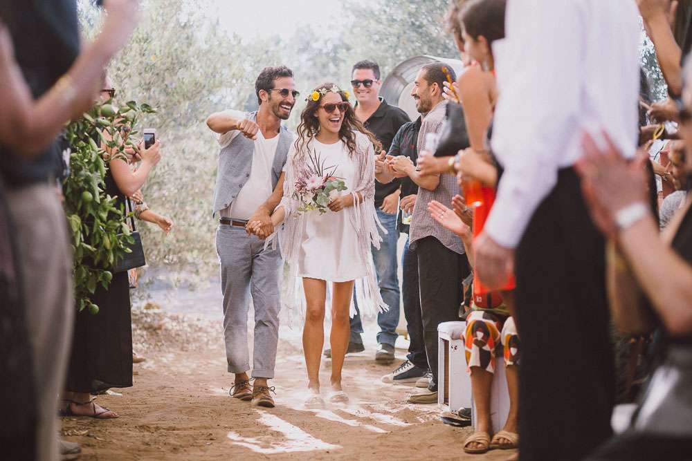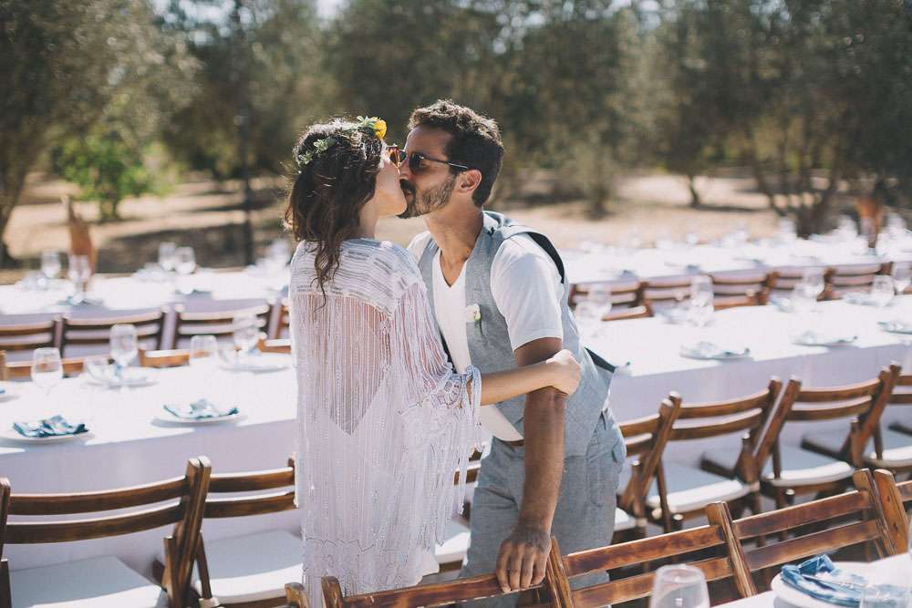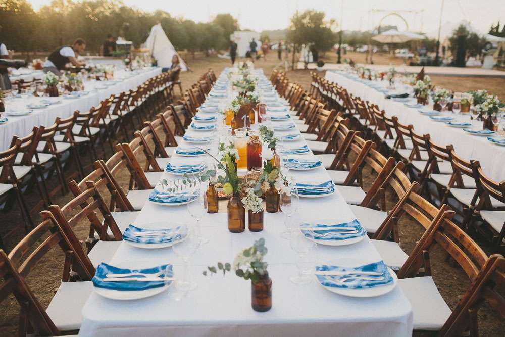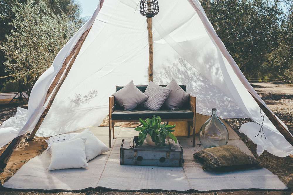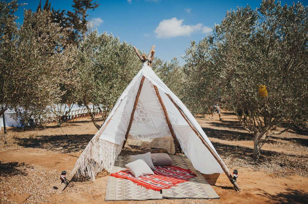 “We’ve been to Burning Man, we’ve been to Love Festival… we love festivals!”, Emma continued. “So we wanted our wedding to reflect that too. The overall styling looked like a desert resort plopped in an olive grove, with tipis strewn across the entire space.”