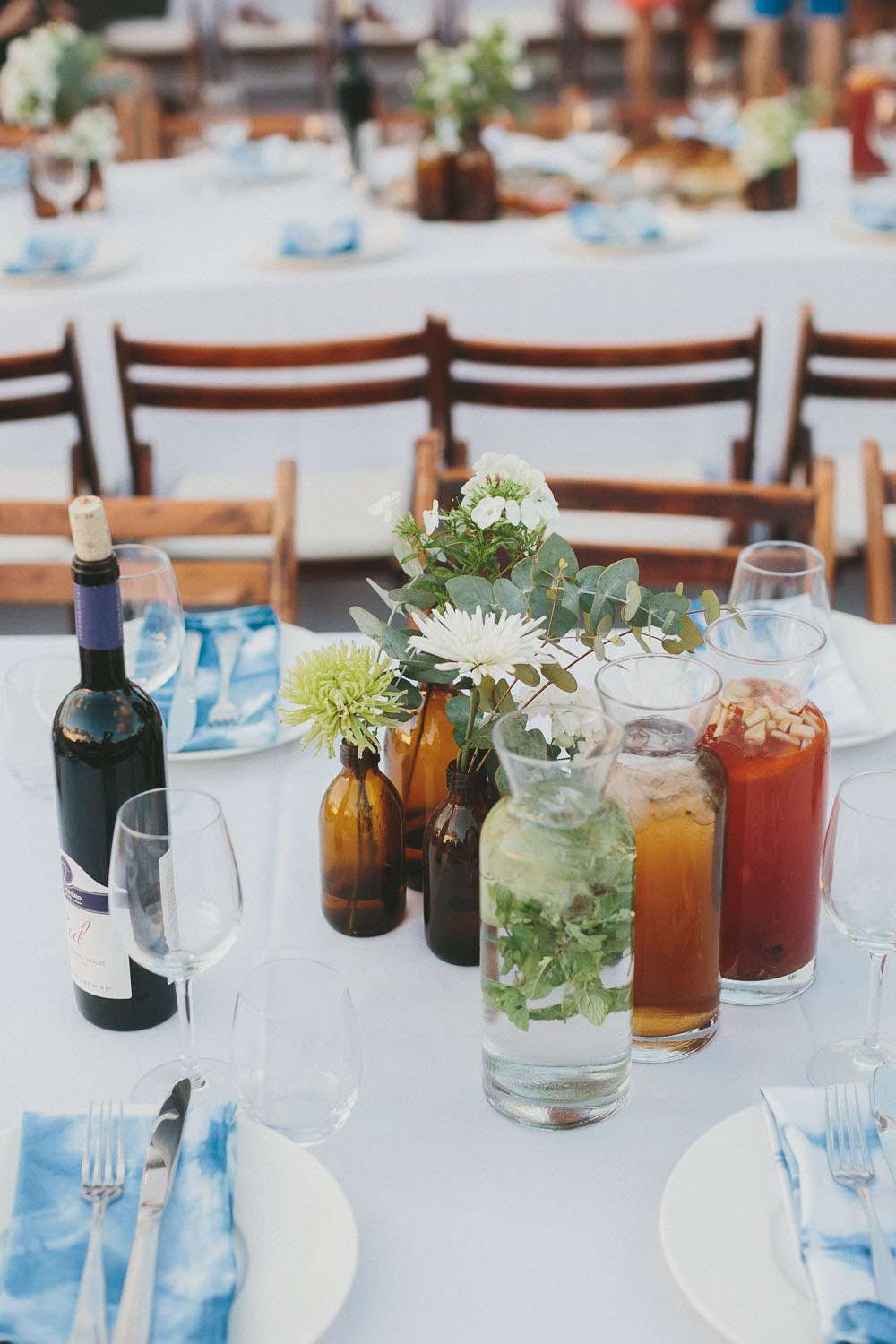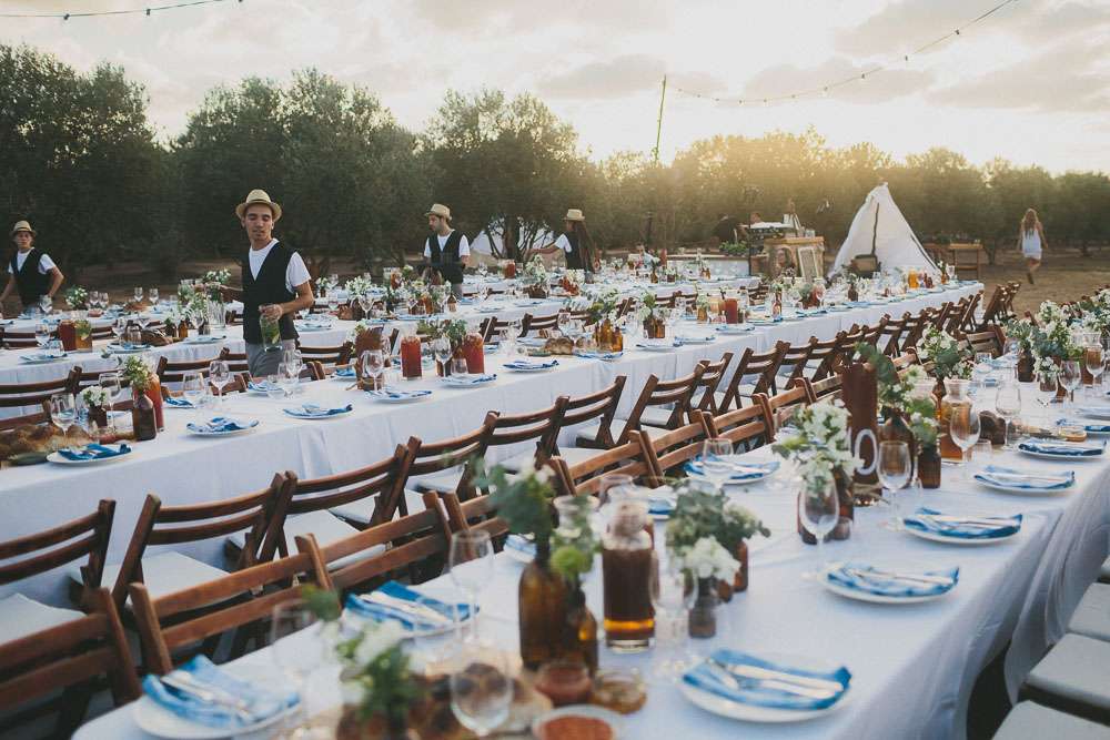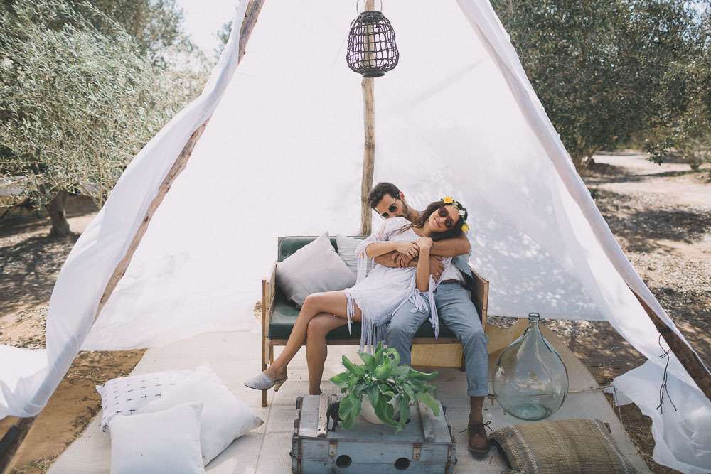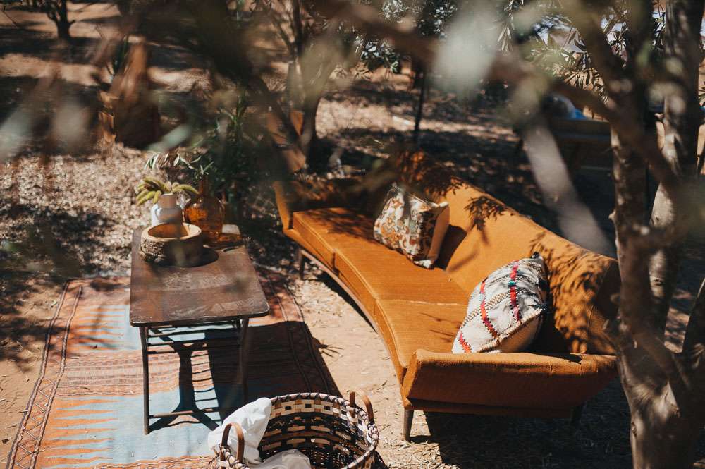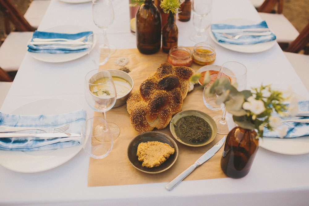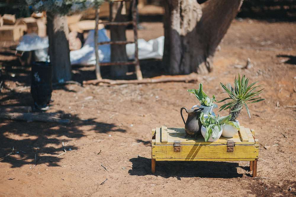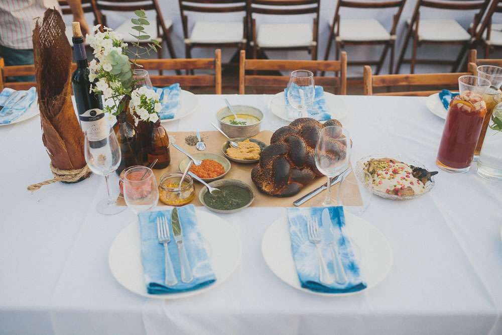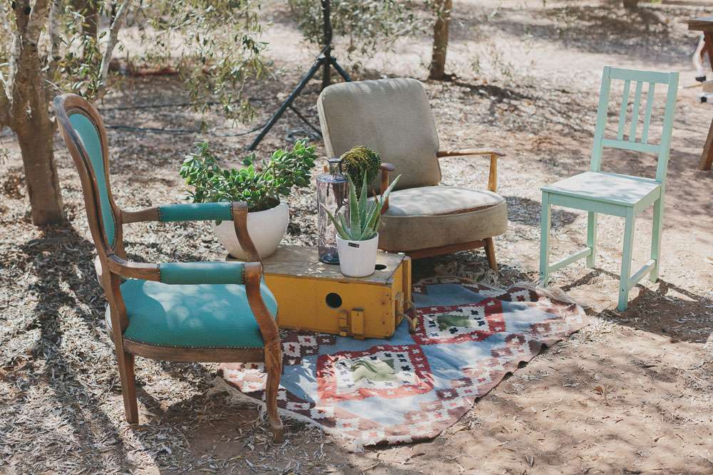 The reception setting was a mixture of boho chic and some native American Indian touches. Eclectic living room furnitures from Tel Aviv’s flea market along with cactus and aloe plants were laid out. The whole set up took three days! The couple also brought along their own furniture which they built themselves.