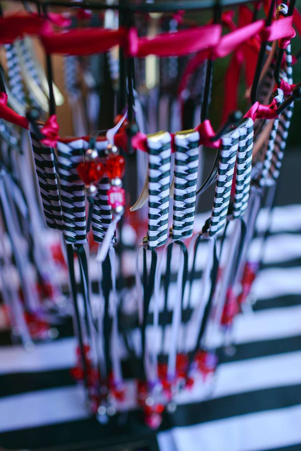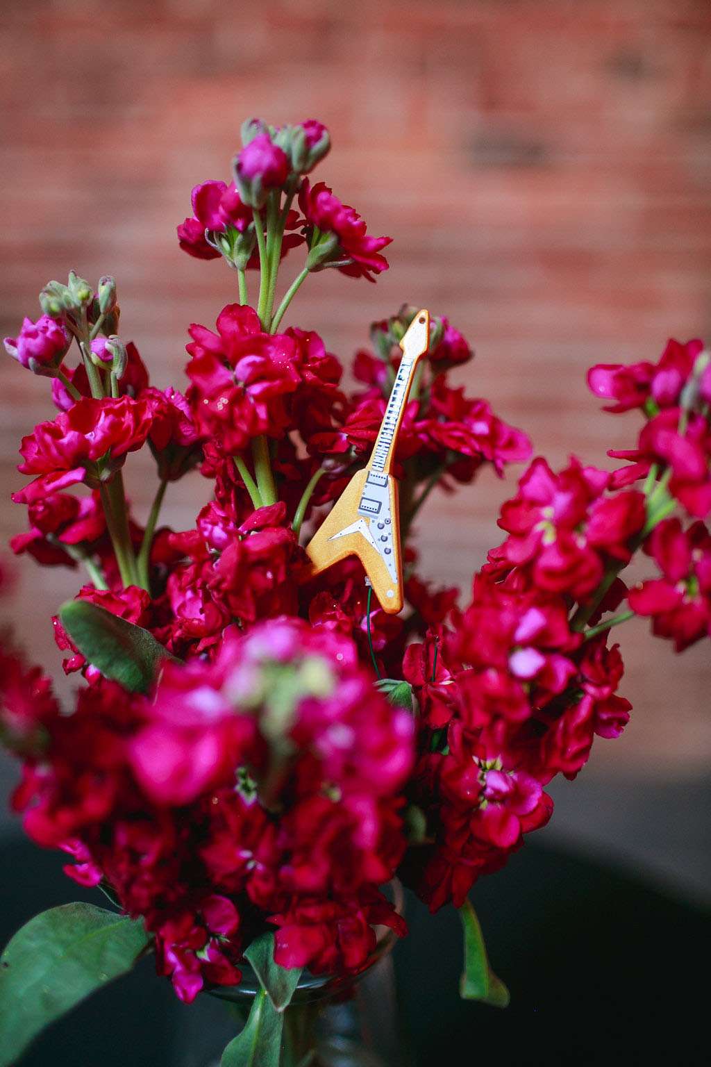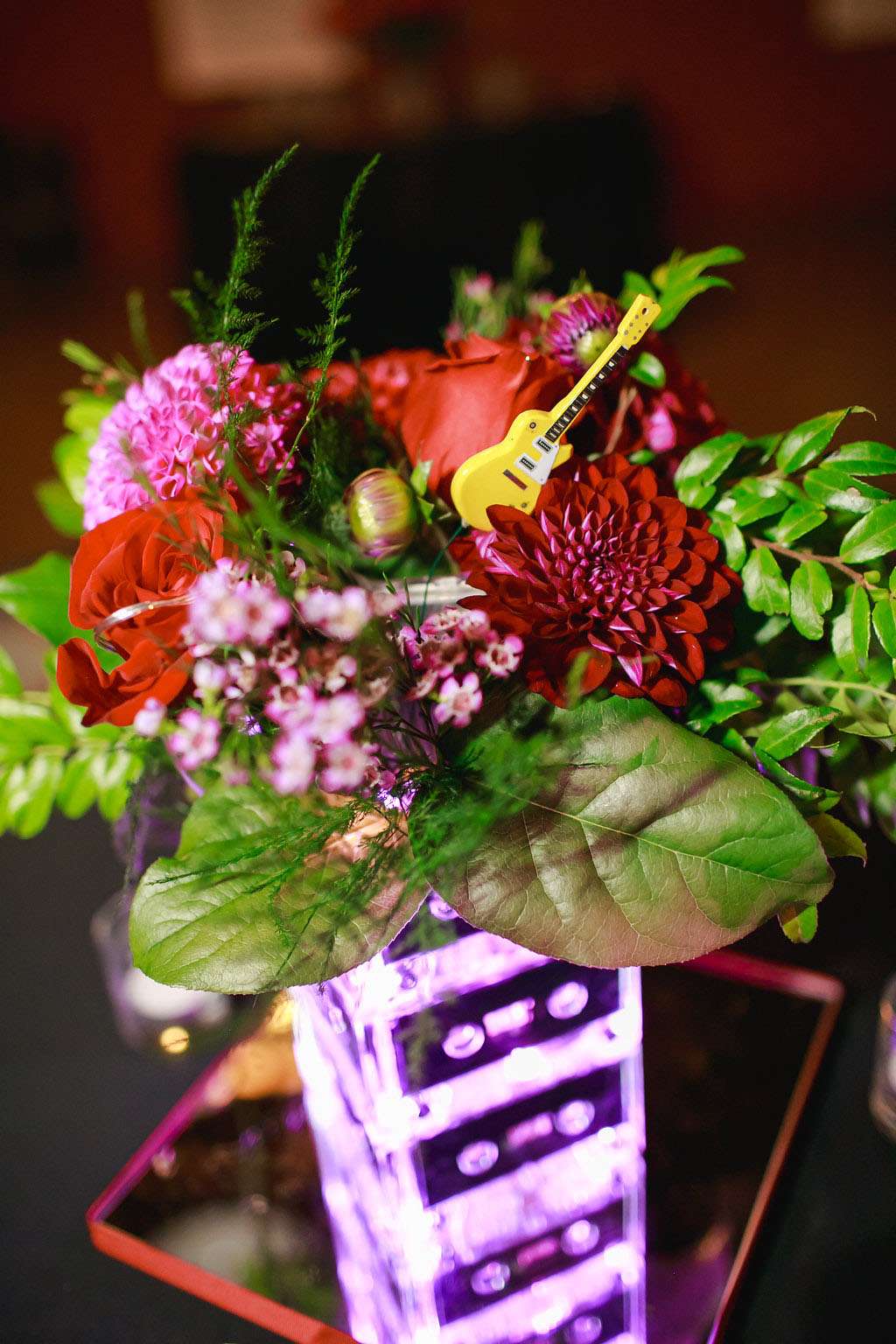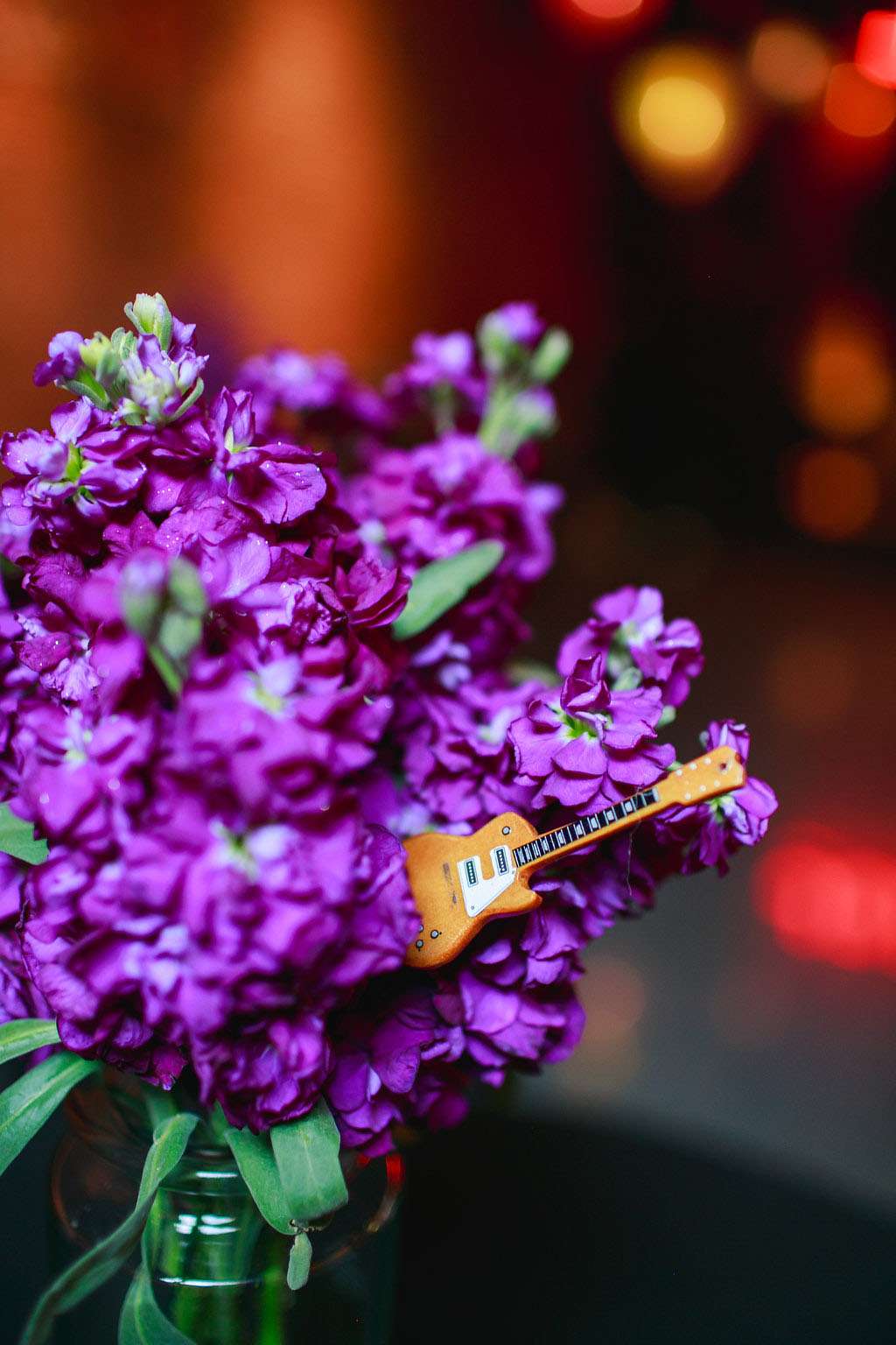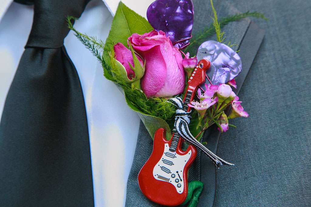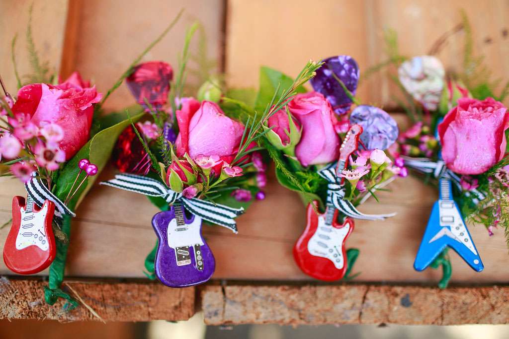 “I also did the boutonnières because I wanted something fun for the guys to wear”, she said. “I found these amazing miniature wood guitar keychains online that were perfect. I added some colourful wire and guitar picks and then tied it all up with a black and white ribbon. Our florist then added pink roses and greens to complete the design. I had to order the keychains in bulk lots, so I ended up having about 30 remaining, which we used in our floral centrepieces! I drilled a small hole in the bottom of each guitar that fit a piece of floral wire. Our florist was able to use them in the arrangements. I also attached one to each of my bridesmaids’ bouquets. It turned out to be a really cute touch!”
