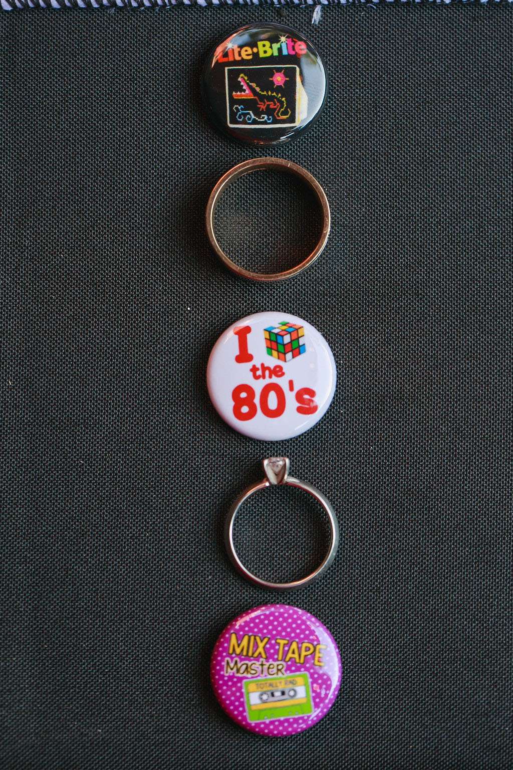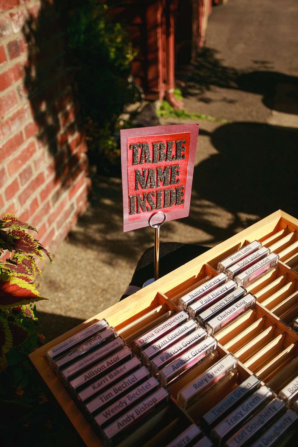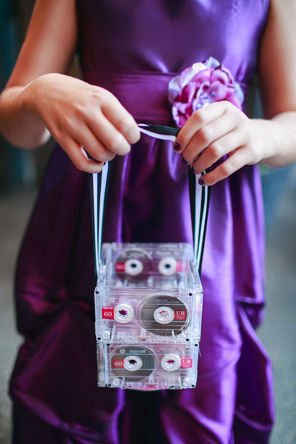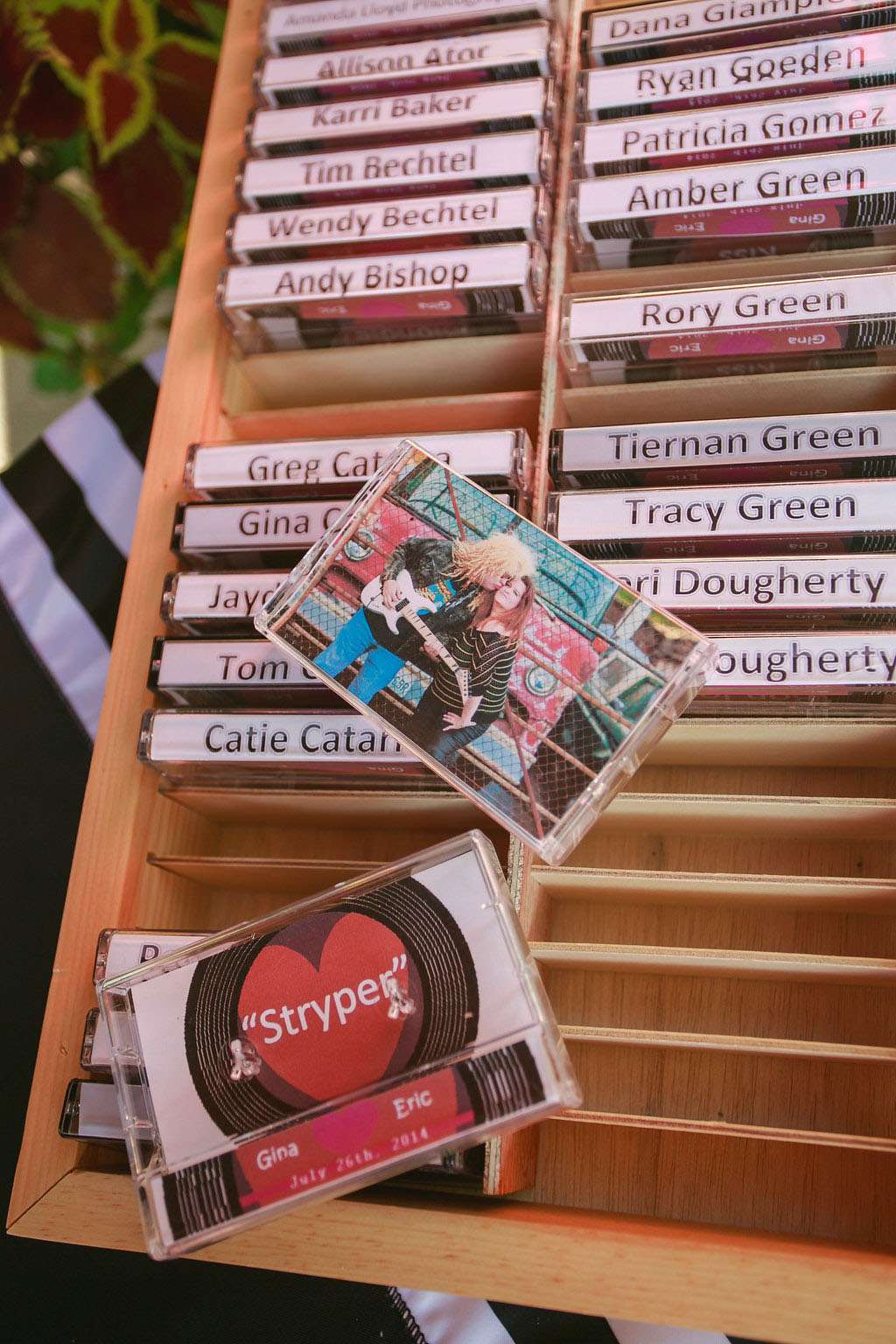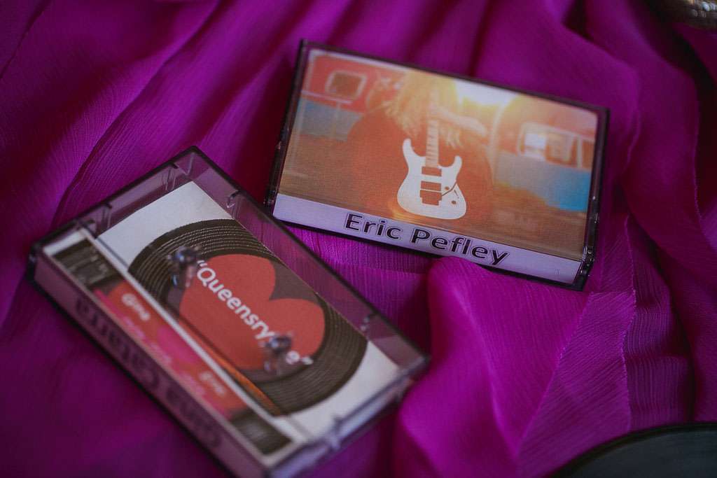 “I was particularly proud of my escort card idea. I created cassette tape holder liners personalised for each guest which indicated their table seating on the inside. I used photographs of us in 80s clothes for the covers!”