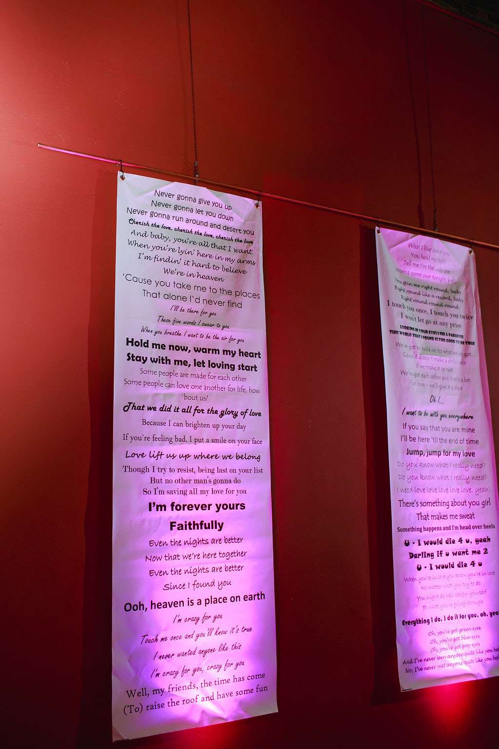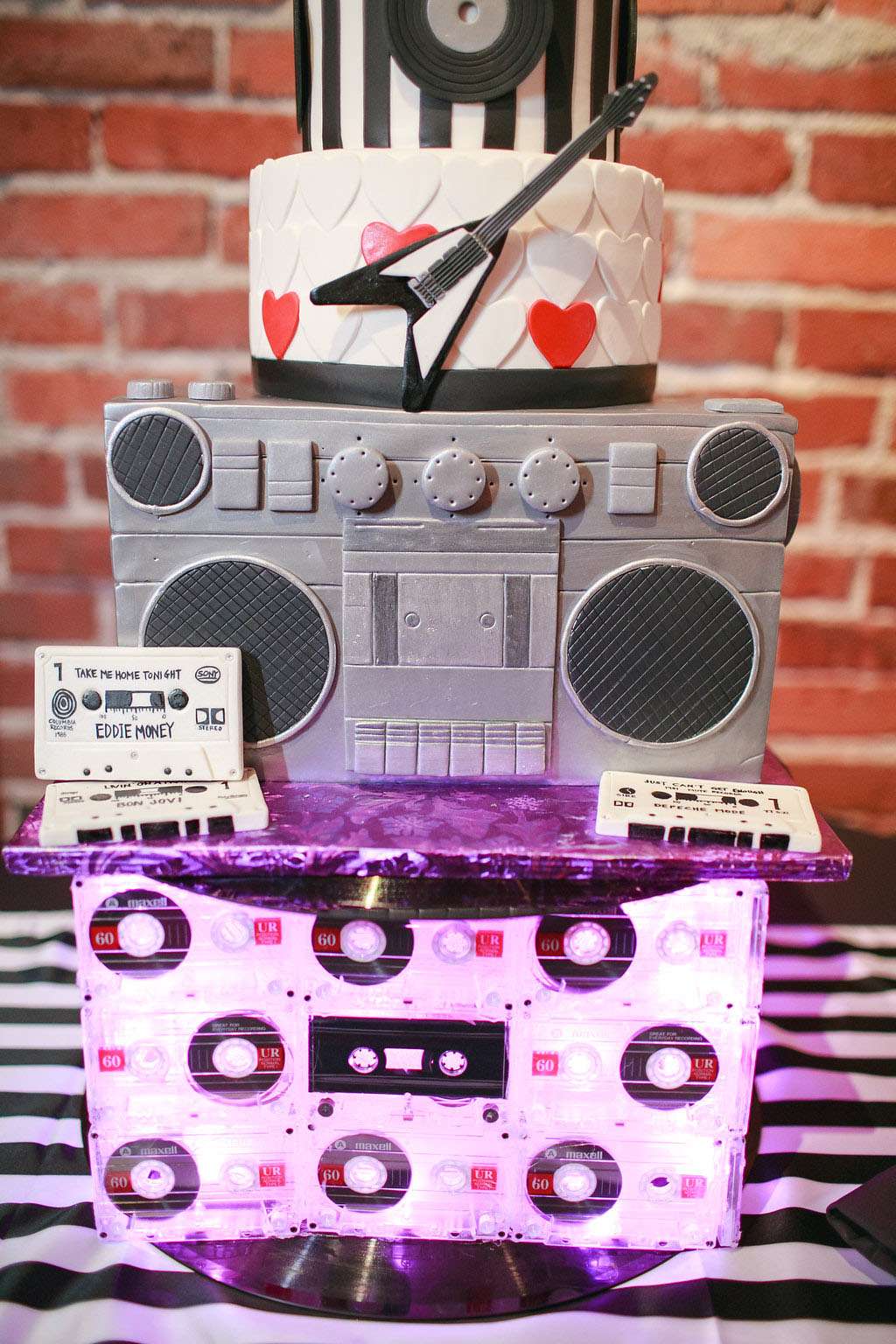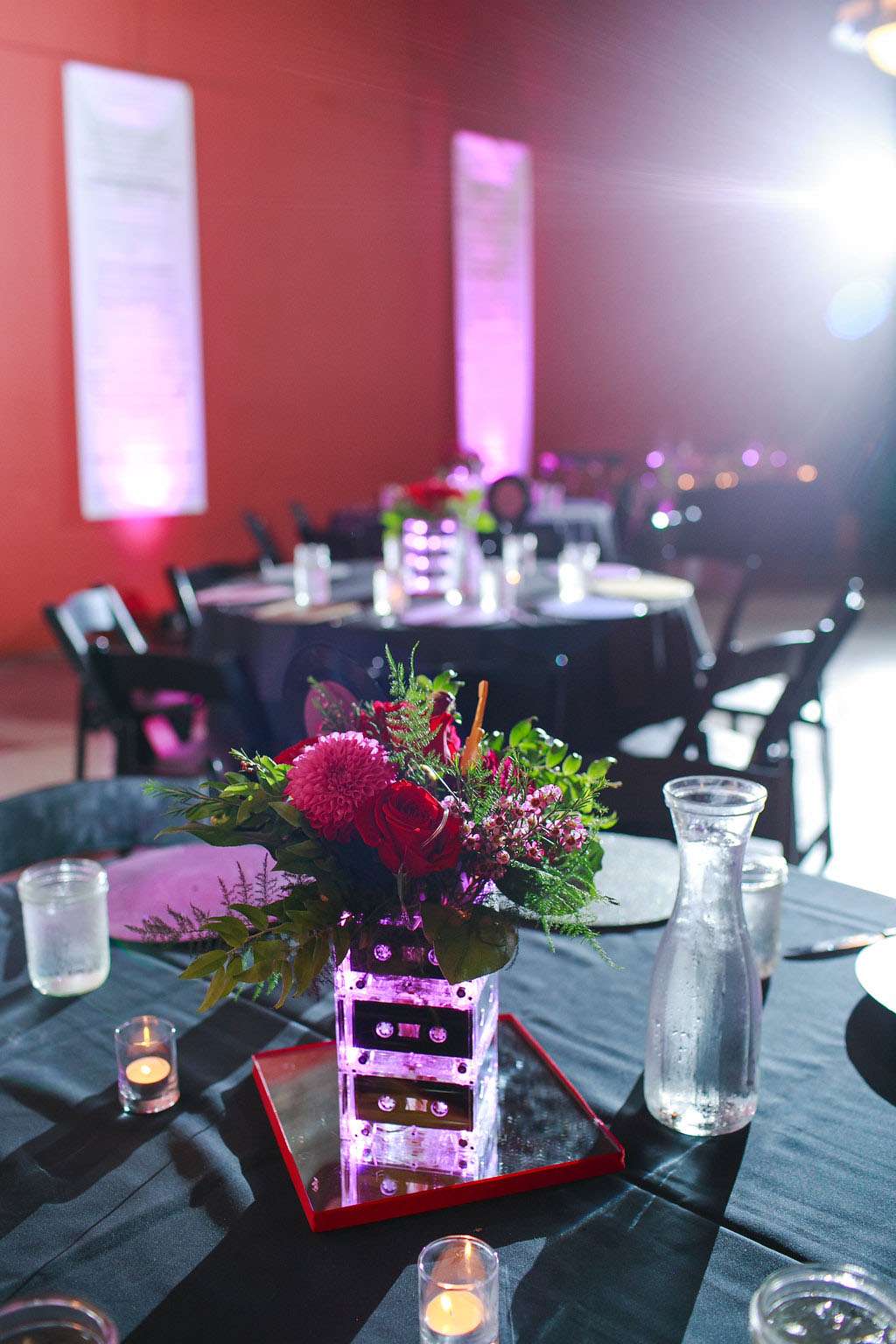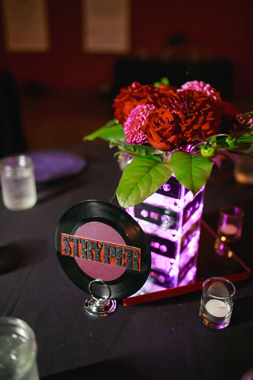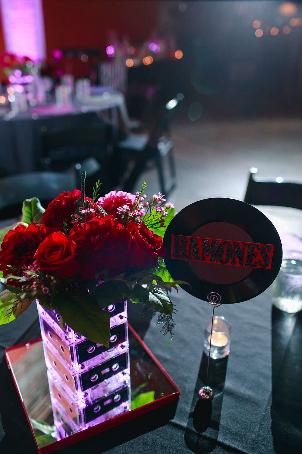 “The things on the table were also all DIY. The centrepiece vases were made by hot gluing together cassette tapes and then putting lights inside. They looked amazing with the arrangements added by our florist. We also had a big version as the stand for our cake. The plate chargers were made from spray painted old LPs.”