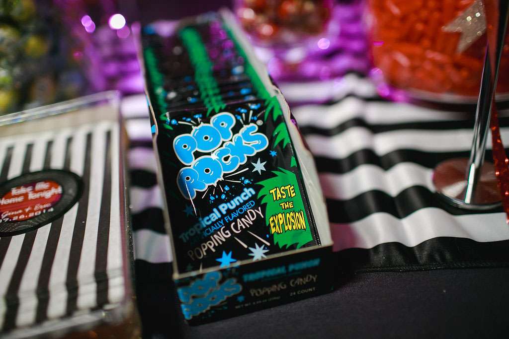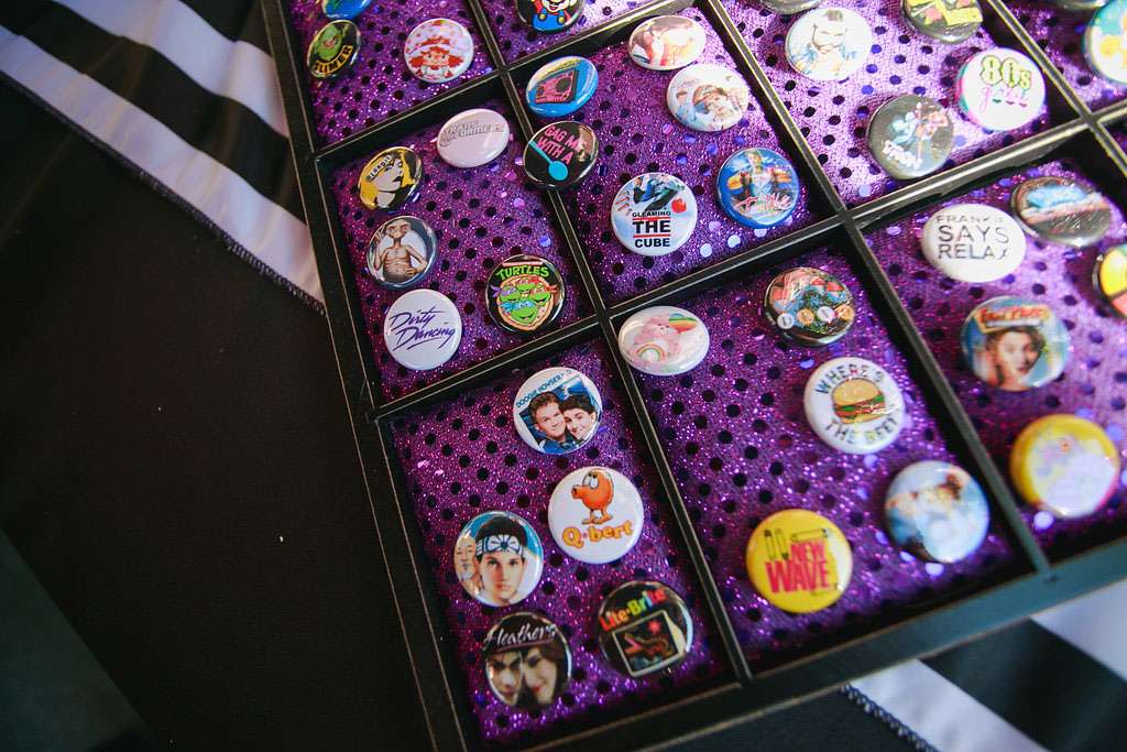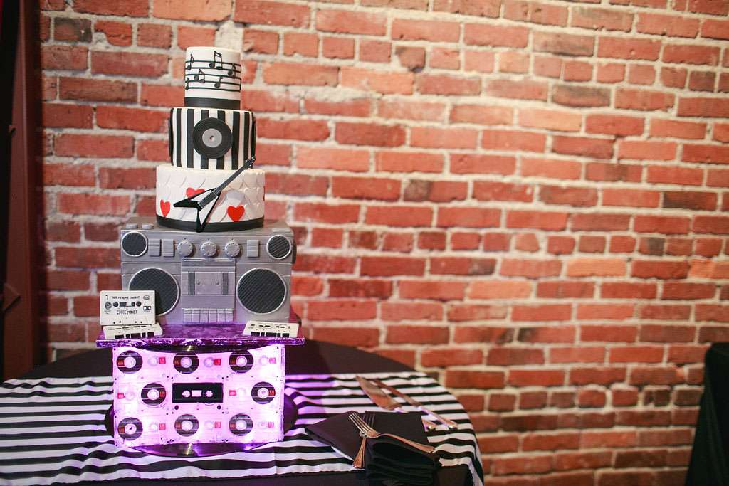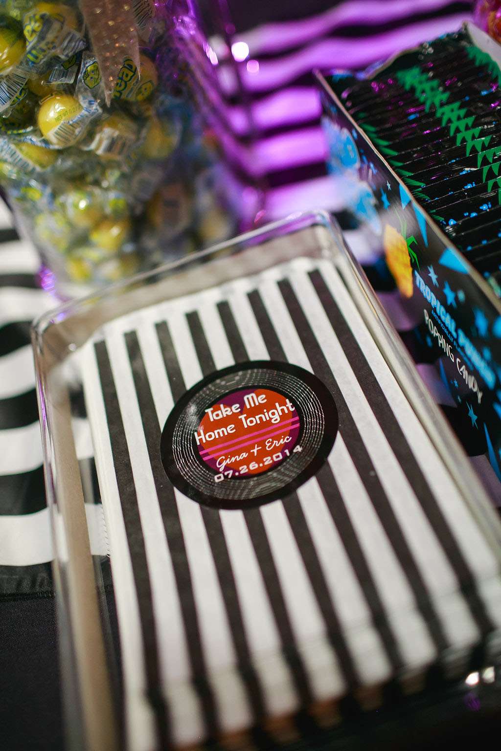 “We tried to pull in aspects of the theme that we both love, including the music and bright colours. I incorporated as many cassette tapes and records into the décor as I could. We also tried to incorporate some ‘80s ideas into our attire, such as a blue tux for Eric and a ruffle-filled asymmetrical dress for me. We also put together a candy buffet with all of our favourite 1980s candy.”