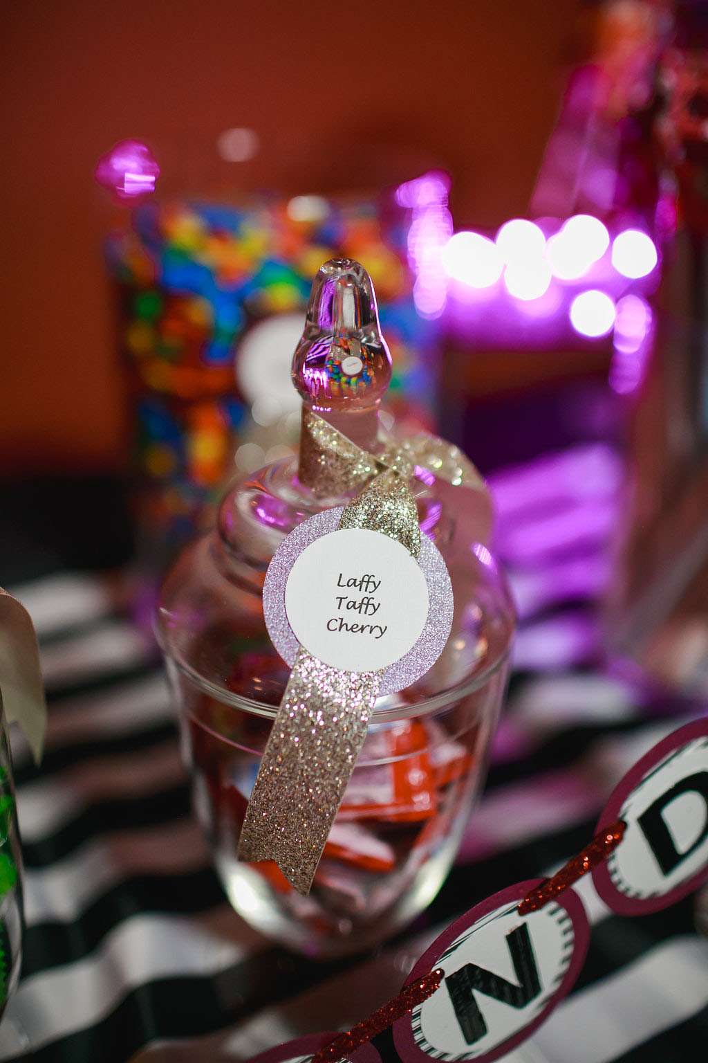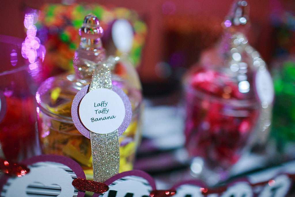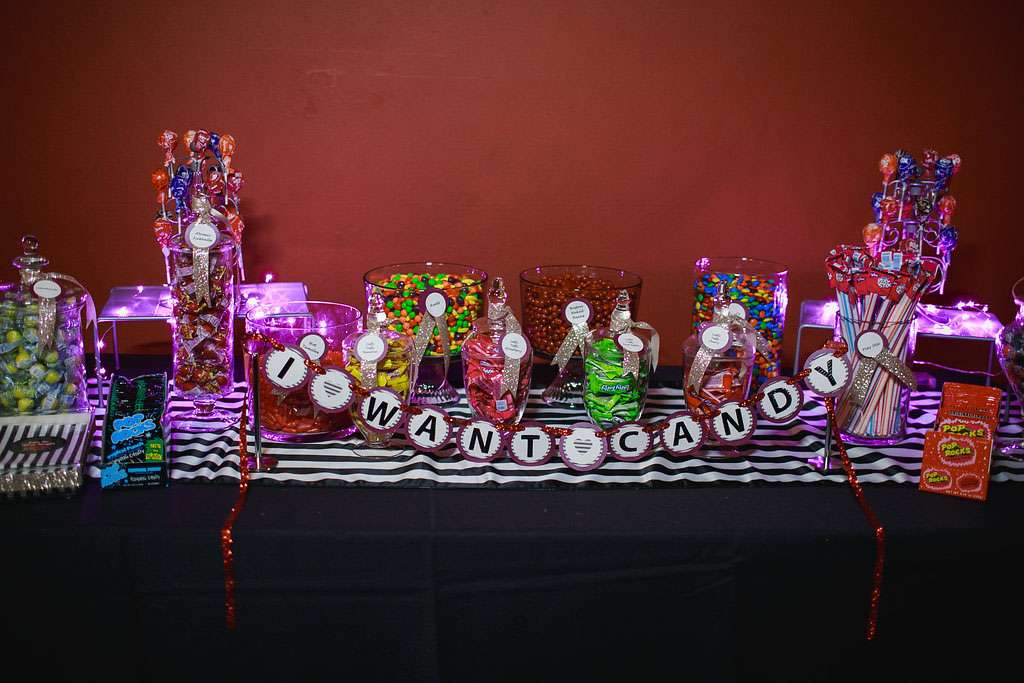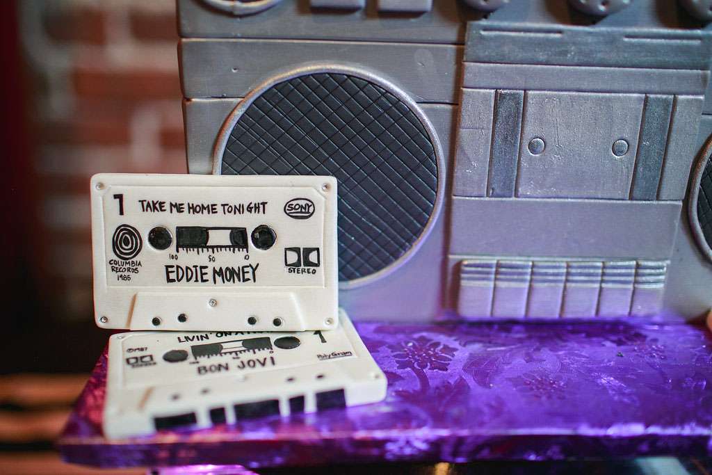 “We tried to pull in aspects of the theme that we both love, including the music and bright colours. I incorporated as many cassette tapes and records into the décor as I could. We also tried to incorporate some ‘80s ideas into our attire, such as a blue tux for Eric and a ruffle-filled asymmetrical dress for me. We also put together a candy buffet with all of our favourite 1980s candy.”